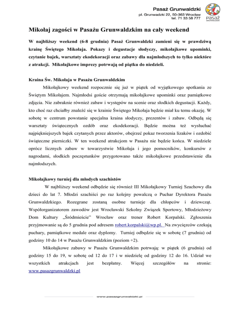 Mikołaj zagości w Pasażu Grunwaldzkim na cały weekend W najbliższy weekend (6-8 grudnia) Pasaż Grunwaldzki zamieni się w prawdziwą krainę Świętego Mikołaja. Pokazy i degustacje słodyczy, mikołajkowe upominki, czytanie bajek, warsztaty ekodekoracji oraz zabawy dla najmłodszych to tylko niektóre z atrakcji. Mikołajkowe imprezy potrwają od piątku do niedzieli. Kraina Św. Mikołaja w Pasażu Grunwaldzkim Mikołajkowy weekend rozpocznie się już w piątek od wyjątkowego spotkania ze Świętym Mikołajem. Najmłodsi goście otrzymają mikołajkowe upominki oraz pamiątkowe zdjęcia. Nie zabraknie również zabaw i występów na scenie oraz słodkich degustacji. Każdy, kto choć raz chciałby znaleźć się w krainie Świętego Mikołaja będzie miał ku temu okazję. W sobotę w centrum powstanie specjalna kraina słodyczy, prezentów i zabaw. Odbędą się warsztaty świątecznych ozdób oraz ekodekoracji. Będzie można też wysłuchać najpiękniejszych bajek czytanych przez aktorów, obejrzeć pokaz tworzenia lizaków i ozdobić świąteczne pierniczki. W ten weekend atrakcjom w Pasażu nie będzie końca. W niedziele oprócz licznych zabaw w towarzystwie Mikołaja i jego pomocników, konkursów z nagrodami, słodkich poczęstunków przygotowano także mikołajkowe przedstawienie dla najmłodszych. Mikołajkowy turniej dla młodych szachistów W najbliższy weekend odbędzie się również III Mikołajkowy Turniej Szachowy dla dzieci do lat 7. Młodzi szachiści po raz kolejny powalczą o Puchar Dyrektora Pasażu Grunwaldzkiego. Rozegrane zostaną osobne turnieje dla chłopców i dziewcząt. Współorganizatorem zawodów jest Wrocławski Szkolny Związek Sportowy, Młodzieżowy Dom Kultury „Śródmieście” Wrocław oraz trener Robert Korpalski. Zgłoszenia przyjmowanie są do 5 grudnia pod adresem [email protected]. Na zwycięzców czekają puchary, pamiątkowe medale oraz dyplomy. Turniej odbędzie się w sobotę (7 grudnia) od godziny 10 do 14 w Pasażu Grunwaldzkim (poziom +2). Mikołajkowe zabawy w Pasażu Grunwaldzkim potrwają: w piątek (6 grudnia) od godziny 15 do 19, w sobotę od 12 do 17 i w niedzielę od godziny 12 do 16. Udział we wszystkich atrakcjach www.pasazgrunwaldzki.pl jest bezpłatny. Więcej szczegółów na stronie: Kontakt dla mediów: Kamila Paliwoda Agencja Royal Brand PR tel.: (71) 723 72 70 [email protected] Pasaż Grunwaldzki – to najwyżej oceniane w niezależnych rankingach wrocławskie centrum rozrywkowo-handlowe. Powstał w 2007 roku. Na 130 000 mkw. powierzchni miejsce znalazło blisko 200 sklepów, punktów usługowych i restauracji oraz 11-salowe Multikino i supermarket.
