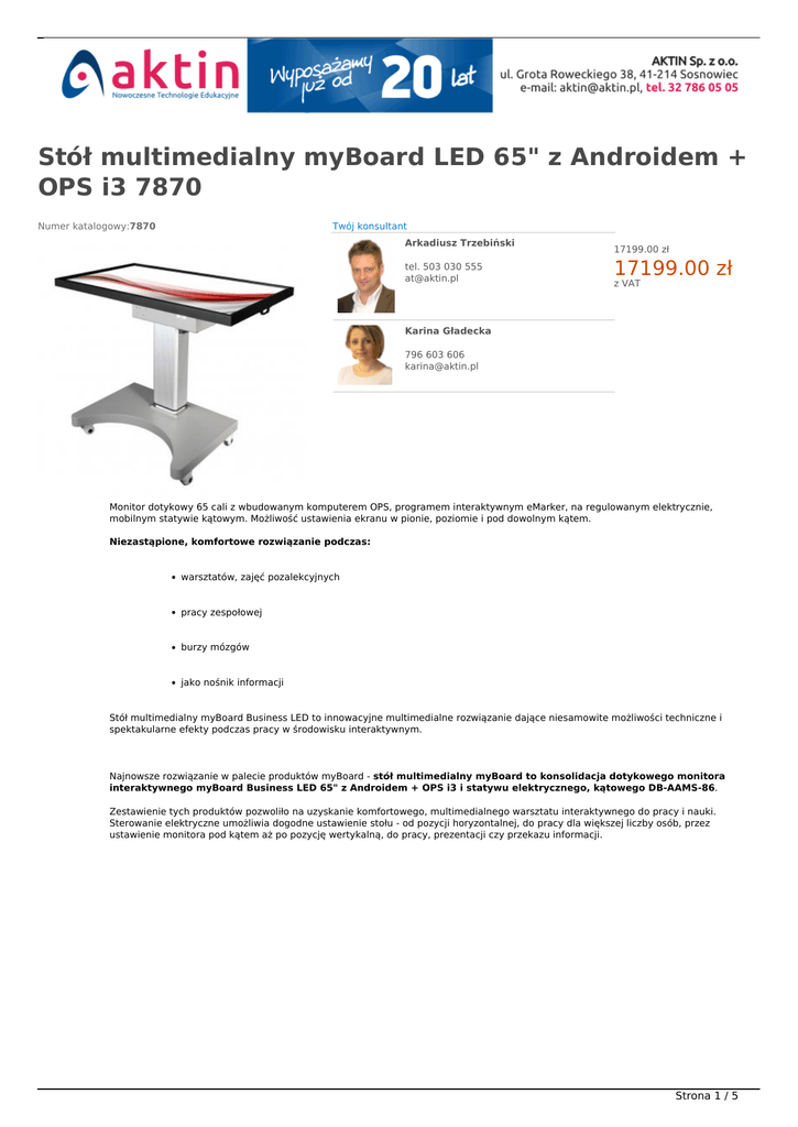 Stół multimedialny myBoard LED 65" z Androidem + OPS i3 7870 Numer katalogowy:7870 Twój konsultant Arkadiusz Trzebiński tel. 503 030 555 [email protected] NOWOŚĆ W OFERCIE 17199.00 zł 17199.00 zł z VAT Karina Gładecka 796 603 606 [email protected] Monitor dotykowy 65 cali z wbudowanym komputerem OPS, programem interaktywnym eMarker, na regulowanym elektrycznie, mobilnym statywie kątowym. Możliwość ustawienia ekranu w pionie, poziomie i pod dowolnym kątem. Niezastąpione, komfortowe rozwiązanie podczas: warsztatów, zajęć pozalekcyjnych pracy zespołowej burzy mózgów jako nośnik informacji Stół multimedialny myBoard Business LED to innowacyjne multimedialne rozwiązanie dające niesamowite możliwości techniczne i spektakularne efekty podczas pracy w środowisku interaktywnym. Najnowsze rozwiązanie w palecie produktów myBoard - stół multimedialny myBoard to konsolidacja dotykowego monitora interaktywnego myBoard Business LED 65" z Androidem + OPS i3 i statywu elektrycznego, kątowego DB-AAMS-86. Zestawienie tych produktów pozwoliło na uzyskanie komfortowego, multimedialnego warsztatu interaktywnego do pracy i nauki. Sterowanie elektryczne umożliwia dogodne ustawienie stołu - od pozycji horyzontalnej, do pracy dla większej liczby osób, przez ustawienie monitora pod kątem aż po pozycję wertykalną, do pracy, prezentacji czy przekazu informacji. Strona 1 / 5 Stół dotykowy myBoard został zaprojektowany z myślą o wykorzystywaniu interaktywnych sekwencji gestów dotykowych, obsłudze urządzenia do 20 punktów dotyku jednocześnie oraz o prostej, intuicyjnej pracy w środowisku interaktywnym myBoard. Zastosowane w systemach myBoard oprogramowanie Multi -Touch Board v.7.0. zapewnia szereg możliwości i rozwiązań ułatwiających pracę, naukę i prezentacje biznesowe. Poznaj podstawowe zalety oprogramowania Multi -Touch Board v.7.0. Powierzchnia blatu stołu wykonana jest z matowego, hartowanego szkła, co gwarantuje odpowiednią wytrzymałość a także odporność na uszkodzenia mechaniczne takie jak: zarysowania, uderzenia, nadmierny nacisk czy zalanie. Matowa powierzchnia zapewnia idealny odbiór obrazu co w zestawieniu z wysoką jakością wyświetlacza LED w rozdzielczości full HD skutkuje perfekcyjnym kontrastem i realistyczną paletą barw. Strona 2 / 5 Zastosowanie: jako element wyposażenia VIP-roomu, biura, biura projektowego niezbędny w sali konferencyjnej i szkoleniowej niezastąpiony w szkole- na lekcjach, warsztatach, zajęciach pozalekcyjnych na uczelni - rozwiązanie pomocne przy pracy grupowej jako narzędzie marketingowe idealnie wpisujące się w wizję każdego skutecznego działu marketingu i PR atrakcja na targach, eventach w grupach szybkiego reagowania jak wojsko, straż, policja jako nośnik informacji – czyli wszędzie tam gdzie informacja ma znaczenie Stół interaktywny myBoard zamieni każdą Twoją prezentację w nowoczesne, interaktywne wydarzenie. Zastosowanie technologii dotykowej 20TOUCH oraz funkcja multi-gesture to gwarancja sukcesu i spektakularności Twojego wystąpienia. Stosując stół myBoard w szkole - zachęcisz uczniów do aktywności, wzbudzisz nowe pokłady energii i kreatywności a nauka stanie się przyjemnością i pasją. Strona 3 / 5 Najważniejsze cechy:· wbudowany system Android 5.0 funkcja 20 TOUCH - ze wsparciem aż 20 punktów dotyku żywotność panelu LED 50 tys. godzin powierzchnia ze szkła hartowanego 4mm z matową powłoką antyrefleksyjną system audio 2 x 15W rozdzielczość Full HD 1920 X 1080 rozwiązanie Plug & Play - bez potrzeby instalacji sterowników oprogramowanie interaktywne eMarker Doskonałe do pracy w szkole trwałe- zastosowane hartowane szkło, odporne na zarysowania to gwarancja bezpieczeństwa praktyczne- matowa, satynowa powierzchnia Anti Glare jest idealna do pisania i oglądania łatwe w obsłudze dzięki funkcji Plug&Play, Drag&Drop wysoka rozdzielczość i kontrastowy obraz podnoszą jakość obrazu Specyfikacja monitora Panel LED 65" Kontrast 4000:1 Jasność 350cd/m2 Proporcje obrazu 16:9 Obszar wyświetlania 1428,5x803,5mm Tryb wyświetlania 16:9/4:3/punkt do punktu/pełny ekran Rozdzielczość FullHD 1920x1080 Ekran szyba hartowana 4mm z powłoką Anti Glare Tryb dźwięku D/K; B/G; I; M Kąt widzenia 178° Żywotność panelu 50 000 h Rozmiar pixela 0,744 x 0,744 Czas reakcji 17ms Przedział napięcia AC (100~240)V-50-60Hz Głośniki 2x15W Zużycie prądu max/tryb czuwania Max. 230 W / 0,5 W Plug&Play Tak Technologia dotyku IR podczerwień Waga 68kg Wejścia HDMI 2.0 x1; HDMI 1.0 x1; VGA x1; YPBPR x1; AV x1; USB 2.0 x2; USB 3.0 x2; RJ45 x1; Czytnik kart x1; Gniazdo Touch USB x1 Wyjścia AV-Out x1; wyjście słuchawkowe; SPDIF x1 Wymiary 1547x936x93mm Specyfikacja modułu dotyku Prędkość kursora 180 dot/s Strona 4 / 5 Obiekty odczytu Palec, wskaźnik lub inny nieprzezroczysty obiekt Punkty dotyku 20 punktów dotyku Dokładność pozycjonowania Strona 5 / 5 Powered by TCPDF (www.tcpdf.org)