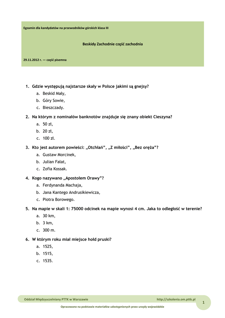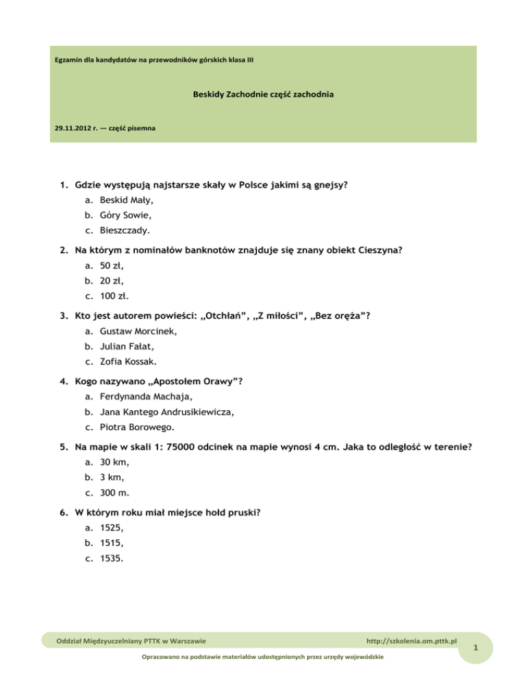 Egzamin dla kandydatów na przewodników górskich klasa III Beskidy Zachodnie część zachodnia 29.11.2012 r. — część pisemna 1. Gdzie występują najstarsze skały w Polsce jakimi są gnejsy? a. Beskid Mały, b. Góry Sowie, c. Bieszczady. 2. Na którym z nominałów banknotów znajduje się znany obiekt Cieszyna? a. 50 zł, b. 20 zł, c. 100 zł. 3. Kto jest autorem powieści: „Otchłań”, „Z miłości”, „Bez oręża”? a. Gustaw Morcinek, b. Julian Fałat, c. Zofia Kossak. 4. Kogo nazywano „Apostołem Orawy”? a. Ferdynanda Machaja, b. Jana Kantego Andrusikiewicza, c. Piotra Borowego. 5. Na mapie w skali 1: 75000 odcinek na mapie wynosi 4 cm. Jaka to odległość w terenie? a. 30 km, b. 3 km, c. 300 m. 6. W którym roku miał miejsce hołd pruski? a. 1525, b. 1515, c. 1535. Oddział Międzyuczelniany PTTK w Warszawie http://szkolenia.om.pttk.pl Opracowano na podstawie materiałów udostępnionych przez urzędy wojewódzkie 1 29.11.2012 Egzamin dla kandydatów na przewodników górskich klasa III — Beskidy Zachodnie część zachodnia 7. Jakie rezerwaty przyrody znajdują się w dolinie Koszarawy? a. Morzyk — Kopce, b. Grapa — Gawroniec, c. Romanka — Pod Rysianką. 8. Który Park Narodowy za symbol ma nietoperza? a. Babiogórski PN, b. Pieniński PN, c. Ojcowski PN. 9. Które z podanych łańcuchów górskich Europy jest najwyższy? a. Karpaty, b. Pireneje, c. Apeniny. 10. Czym różni się otwarte złamanie kości od zwykłego złamania? a. przerwaniem skóry i wyraźną raną, b. zabarwieniem skóry w miejscu złamania, c. niczym się nie różni. 11. Co jest najwyższym wzniesieniem Gór Zasolskich (wsch. Beskidu Małego)? a. Czupel, b. Łamana Skała, c. Jaworzyna. 12. Co to jest nolepa w kurnej chacie? a. podłoga wylepiona gliną przed piecem, b. ganek przed domem, c. okap nad oknem. 13. Kto był inicjatorem wyznakowania Głównego Szlaku Beskidzkiego? a. Władysław Krygowski, b. Kazimierz Sosnowski, c. Józef Nyka. 14. Gdzie zlokalizujesz Pasmo Barnasiówki? a. między Jeleśnią a Koszarawą, b. na południe od Suchej Beskidzkiej, c. na północny zachód od Myślenic. 2 http://szkolenia.om.pttk.pl Oddział Międzyuczelniany PTTK w Warszawie Opracowano na podstawie materiałów udostępnionych przez urzędy wojewódzkie Egzamin dla kandydatów na przewodników górskich klasa III — Beskidy Zachodnie część zachodnia 29.11.2012 15. Najwyższym wzniesieniem na Pojezierzu Pomorskim jest? a. Wieżyca, b. Dylewska Góra, c. Wielki Dział. 16. Jakie szczyty widać, patrząc na wschód, z przełęczy U Poloka? a. Romanka — Palenica — Pilsko, b. Kiczora — Palenica — Walentarski Groń, c. Łazek (Lasek) — Palenica — Pilsko. 17. Która z wymienionych przełęczy jest najwyższa? a. Salmopol, b. Lipnicka, c. Kubalonka. 18. Jak nazywa się sala jadalna w klasztorze? a. refektarz, b. kapitularz, c. wirydarz. 19. Kto był pierwszym przewodnikiem z licencją po rejonie Babiej Góry? a. Władysław Miodowicz, b. Wawrzyniec Szkolnik, c. Władysław Szafer. 20. W jakim masywie leżą hale: Śmietanowa i Cebulowa? a. Baraniej Góry, b. Pilska, c. Mędralowej. 21. Kto jest autorem powieści „Księga Tatr”? a. Emil Zegadłowicz, b. Jalu Kurek, c. Władysław Orkan. 22. Jakie wzniesienia zlokalizujesz w Paśmie Wielkiej Raczy? a. Wielka Racza — Girowa — Śrubity Groń, b. Mała Racza — Orzeł — Prusów, c. Upłaz — Bugaj — Orzeł. Oddział Międzyuczelniany PTTK w Warszawie http://szkolenia.om.pttk.pl.pl Opracowano na podstawie materiałów udostępnionych przez urzędy wojewódzkie 3 29.11.2012 Egzamin dla kandydatów na przewodników górskich klasa III — Beskidy Zachodnie część zachodnia 23. Kto zaprojektował Zameczek Prezydencki na Zadnim Groniu? a. Ludwik Konarzewski, b. Jan Wałach, c. Adolf Szyszko–Bohusz. 24. W jakim paśmie leżą: Okrąglica i Hala Krupowa? a. Policy, b. Rycerzowej, c. Wielkiej Raczy. 25. Największą atrakcją tej miejscowości leżącej na Pogórzu Śląskim jest fontanna solankowa? a. Kończyce, b. Dębowiec, c. Zebrzydowice. 26. Kto w Rudzicy założył Muzeum Strachów Polnych? a. Stanisław Żaki, b. Małgorzata Kiereś, c. Florian Kohut. 27. Gdzie, koło Cieszyna, znajduje się największy w Polsce ośrodek opiekuńczo– wychowawczy kościoła ewangelickiego? a. Goleszów, b. Cisownica, c. Dzięgielów. 28. Do jakiej rzeki wpadają potoki: Hołcyna, Bukowy, Chrobaczy? a. Brennica, b. Malinka, c. Żylica. 29. Gdzie znajduje się muzeum biograficzne Emila Zegadłowicza? a. Brenna, b. Gorzeń, c. Skoczów. 30. Z jakiego rejonu Beskidu Zach. zbiera się nasiona jodeł i wysyła na eksport? a. Istebna, b. Szczyrk, c. Zawoja. 4 http://szkolenia.om.pttk.pl Oddział Międzyuczelniany PTTK w Warszawie Opracowano na podstawie materiałów udostępnionych przez urzędy wojewódzkie