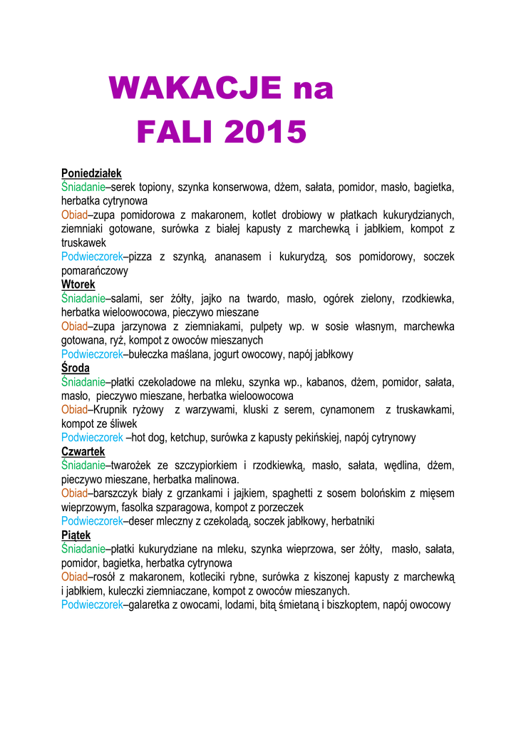 WAKACJE na FALI 2015 Poniedziałek Śniadanie–serek topiony, szynka konserwowa, dŜem, sałata, pomidor, masło, bagietka, herbatka cytrynowa Obiad–zupa pomidorowa z makaronem, kotlet drobiowy w płatkach kukurydzianych, ziemniaki gotowane, surówka z białej kapusty z marchewką i jabłkiem, kompot z truskawek Podwieczorek–pizza z szynką, ananasem i kukurydzą, sos pomidorowy, soczek pomarańczowy Wtorek Śniadanie–salami, ser Ŝółty, jajko na twardo, masło, ogórek zielony, rzodkiewka, herbatka wieloowocowa, pieczywo mieszane Obiad–zupa jarzynowa z ziemniakami, pulpety wp. w sosie własnym, marchewka gotowana, ryŜ, kompot z owoców mieszanych Podwieczorek–bułeczka maślana, jogurt owocowy, napój jabłkowy Środa Śniadanie–płatki czekoladowe na mleku, szynka wp., kabanos, dŜem, pomidor, sałata, masło, pieczywo mieszane, herbatka wieloowocowa Obiad–Krupnik ryŜowy z warzywami, kluski z serem, cynamonem z truskawkami, kompot ze śliwek Podwieczorek –hot dog, ketchup, surówka z kapusty pekińskiej, napój cytrynowy Czwartek Śniadanie–twaroŜek ze szczypiorkiem i rzodkiewką, masło, sałata, wędlina, dŜem, pieczywo mieszane, herbatka malinowa. Obiad–barszczyk biały z grzankami i jajkiem, spaghetti z sosem bolońskim z mięsem wieprzowym, fasolka szparagowa, kompot z porzeczek Podwieczorek–deser mleczny z czekoladą, soczek jabłkowy, herbatniki Piątek Śniadanie–płatki kukurydziane na mleku, szynka wieprzowa, ser Ŝółty, masło, sałata, pomidor, bagietka, herbatka cytrynowa Obiad–rosół z makaronem, kotleciki rybne, surówka z kiszonej kapusty z marchewką i jabłkiem, kuleczki ziemniaczane, kompot z owoców mieszanych. Podwieczorek–galaretka z owocami, lodami, bitą śmietaną i biszkoptem, napój owocowy