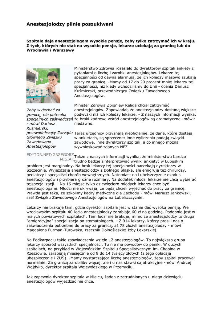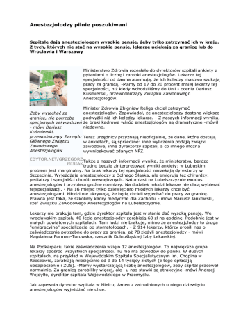 Anestezjolodzy pilnie poszukiwani Szpitale dają anestezjologom wysokie pensje, żeby tylko zatrzymać ich w kraju. Z tych, których nie stać na wysokie pensje, lekarze uciekają za granicę lub do Wrocławia i Warszawy Ministerstwo Zdrowia rozesłało do dyrektorów szpitali ankiety z pytaniami o liczbę i zarobki anestezjologów. Lekarze tej specjalności od dawna alarmują, że ich koledzy masowo szukają pracy za granicą. -Mamy od 17 do 20 procent mniej lekarzy tej specjalności, niż kiedy wchodziliśmy do Unii - ocenia Dariusz Kuśmierski, przewodniczący Związku Zawodowego Anestezjologów. Żeby wyjechać za granicę, nie potrzeba specjalnych zaświadczeń - mówi Dariusz Kuśmierski, przewodniczący Zarządu Głównego Związku Zawodowego Anestezjologów Minister Zdrowia Zbigniew Religa chciał zatrzymać anestezjologów. Zapowiadał, że anestezjolodzy dostaną większe podwyżki niż ich koledzy lekarze. - Z naszych informacji wynika, że braki kadrowe wśród anestezjologów są dramatyczne -mówił niedawno. Teraz urzędnicy przyznają nieoficjalnie, że dane, które dostają w ankietach, są sprzeczne: inne wyliczenia podają związki zawodowe, inne dyrektorzy szpitali, a co innego można wywnioskować zdanych NFZ. EDYTOR.NET/GRZEGORZ Także z naszych informacji wynika, że ministerstwu bardzo MISIAK trudno będzie zinterpretować wyniki ankiety: w Lubuskim problem jest marginalny. Na brak lekarzy tej specjalności narzekają dyrektorzy w Szczecinie. Wyjeżdżają anestezjolodzy z Dolnego Śląska, ale emigrują też chirurdzy, pediatrzy i specjaliści chorób wewnętrznych. Natomiast na Lubelszczyznie exodus anestezjologów i przybiera groźne rozmiary. Na dodatek młodzi lekarze nie chcą wybierać tejspecjalizacji. - Na 16 miejsc tylko dziewięcioro młodych lekarzy chce być anestezjologami. Młodzi nie ukrywają, że będą chcieli wyjechać do pracy za granicę. Prawda jest taka, że szkolimy kadry medyczne dla Zachodu - mówi Mariusz Jankowski, szef Związku Zawodowego Anestezjologów na Lubelszczyznie. Lekarzy nie brakuje tam, gdzie dyrektor szpitala jest w stanie dać wysoką pensję. We wrocławskim szpitalu 40-lecia anestezjolodzy zarabiają 60 zł na godzinę. Podobnie jest w małych powiatowych szpitalach. Tam ludzi nie brakuje, mimo że anestezjolodzy to druga "emigracyjna" specjalizacja po stomatologach. - Z 914 lekarzy, którzy prosili nas o zaświadczenia potrzebne do pracy za granicą, aż 78 złożyli anestezjolodzy - mówi Magdalena Furman-Turowska, rzecznik Dolnośląskiej Izby Lekarskiej. Na Podkarpaciu takie zaświadczenia wzięło 12 anestezjologów. To największa grupa lekarzy spośród wszystkich specjalności. Tu nie ma powodów do paniki. W dużych szpitalach, na przykład w Wojewódzkim Szpitalu Specjalistycznym im. Chopina w Rzeszowie, zarabiają miesięcznie od 9 do 14 tysięcy złotych (z tego opłacają ubezpieczenie i ZUS). -Mamy wystarczającą liczbę anestezjologów, żeby szpital pracował normalnie. Za granicą zarobiliby więcej, ale i u nas stawki są atrakcyjne -mówi Andrzej Wojdyłło, dyrektor szpitala Wojewódzkiego w Przemyślu. Jak zapewnia dyrektor szpitala w Mielcu, żaden z zatrudnionych u niego dziewięciu anestezjologów wyjeżdżać nie chce. Gorzej jest w małych miejscowościach. -Poszukujemy dwóch specjalistów, jeden od nas odszedł. Żeby ich zachęcić do przyjazdu w Bieszczady, musimy im zaproponować wyjątkowo korzystne warunki - mówi dyrektor ds. lecznictwa w leskim szpitalu Mariusz Łapiński. W Zielonej Górze tylko dwa na 111 pobranych zaświadczeń pozwalających na pracę w Unii wzięli anestezjolodzy. W Gorzowie Wielkopolskim po taki wniosek zgłosił się tylko jeden lekarz. Ostatecznie nie wyjechał . Związkowcy tłumaczą: dziś mało lekarzy bierze zaświadczenia z izb lekarskich, bo coraz częściej zagraniczne szpitale nie wymagają takich dokumentów. - Wystarcza polecenie polskiego lekarza, który pracuje wdanym środowisku. Czasem najlepszą rekomendacją są trzy słowa - lekarz z Polski - twierdzi Dariusz Kuśmierski, szef związku. SYLWIA SZPARKOWSKA, ELŻBIETA POŁUDNIK Ile zarabiają lekarze ¦ Dariusz Lipczyński był anestezjologiem w łódzkim szpitalu dziecięcym. Wyjechał do Belfastu. Zarabia około 5 tysięcy funtów miesięcznie za dziewiętnaście godzin pracy tygodniowo. ¦ Mariusz Jankowski pracuje w szpitalu wojewódzkim w Lublinie. Zarabia miesięcznie 2 tysiące złotych. Kieruje lokalnym oddziałem związku. Zapowiada: - Przygotowujemy strajk. ¦ W warszawskim szpitalu wolskim lekarz dostaje za godzinę 48 złotych. Może zarobić nawet 12 tysięcy miesięcznie. Więcej niż dyrektor szpitala i więcej niż minister zdrowia. Dzięki takim pensjom nie mamy kłopotów z zatrudnieniem, możemy wybierać naprawdę dobrych lekarzy - mówi Marek Balicki, dyrektor szpitala wolskiego. ¦ Mógłbym zaoferować 10 tysięcy brutto, ale nie ma chętnych - mówi Tomasz Anasiewicz, anestezjolog i dyrektor ds. lecznictwa szpitala w Zamościu. - Dwa lata temu miałem pięciu lekarzy tej specjalności, ale wyjechali: do Wrocławia i Warszawy. Teraz mam dwóch. Sam pracuję na okrągło. źródło; Rzeczpospolita Nr 30 - 05.02.07 r.