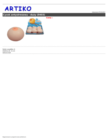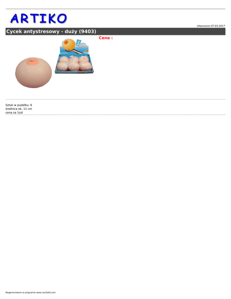 Utworzono 07-03-2017 Cycek antystresowy - duży (9403) Cena : Sztuk w pudełku: 6 średnica ok. 11 cm cena za 1szt Wygenerowano w programie www.oscGold.com