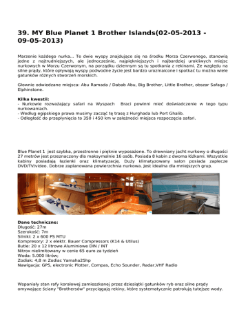 39. MY Blue Planet 1 Brother Islands(02-05-2013 09-05-2013) Marzenie każdego nurka... Te dwie wyspy znajdujące się na środku Morza Czerwonego, stanowią jedne z najtrudniejszych, ale jednocześnie, najpiękniejszych i najbardziej urokliwych miejsc nurkowych w Morzu Czerwonym, na porządku dziennym są tu spotkania z rekinami. Ze względu na silne prądy, które opływają wyspy podwodne życie jest bardzo urozmaicone i spotkać tu można wiele gatunków różnych stworzeń morskich. Głownie odwiedzane miejsca: Abu Ramada / Dabab Abu, Big Brother, Little Brother, obszar Safaga / Elphinstone. Kilka kwestii: - Nurkowie rozważający safari na Wyspach Braci powinni mieć doświadczenie w tego typu nurkowaniach. - Według egipskiego prawa musimy zacząć tę trasę z Hurghada lub Port Ghalib. - Odległość do przepłynięcia to 350 i 450 km w zależności miejsca rozpoczęcia safari. Blue Planet 1 jest szybka, przestronne i pięknie wyposażone. To drewniany jacht nurkowy o długości 27 metrów jest przeznaczony dla maksymalnie 16 osób. Posiada 8 kabin z dwoma łóżkami. Wszystkie kabiny posiadają łazienki oraz klimatyzację. Duży klimatyzowany salon posiada zaplecze DVD/TV/video. Dobrze zaplanowana powierzchnia nurkowa. Jest idealna dla mniejszych grup. Dane techniczne: Długość: 27m Szerokość: 7m Silniki: 2 x 600 PS MTU Kompresory: 2 x elektr. Bauer Compressors (K14 & Utilus) Butle: 20 x 12 litrowe Aluminiowe DIN / INT Nitrox nielimitowany w cenie 65 euro za tydzień Woda: 5.000 litrów; Zodiak: 4,8 m Zodiac Yamaha25hp Nawigacja: GPS, electronic Plotter, Compas, Echo Sounder, Radar,VHF Radio Wspaniały stan rafy koralowej zamieszkanej przez dziesiątki gatunków ryb oraz silne prądy omywające ściany "Brothersów" przyciągają rekiny, które systematycznie patrolują tutejsze wody. Widuje się tutaj rekiny białopłetwe oceaniczne, rekiny młoty, kosoogony, rekiny jedwabiste i szare rekiny rafowe. Na porządku dziennym są również spotkania z murenami o imponujących rozmiarach, wielkimi strzępielami rafowymi i żółwiami. Dla płetwonurków, których pasjonuje nurkowanie na wrakach mamy Aida i Numbia, dwa wraki, na których nurkowanie na pewno będzie niezapomnianym przeżyciem. Cena zawiera: zakwaterowanie na łodzi, transfer z i do lotniska wyżywienie fullboard oraz herbatę, kawę, butelkowaną wodę, napoje bezalkoholowe, 6 dni nurkowych, przewodników nurkowych, butla, balast, pas balastowy. Cena nie zawiera: kosztów przelotu ok. 1500 PLN, wiza płatna na lotnisku - 15 USD, opłat parkowych 55 Euro za osobę, napojów gazowanych i innych w puszkach oraz alkoholowych, zwyczajowych napiwków dla załogi ok 25 EURO. Dokładne trasy i miejsca nurkowe zależą od warunków pogodowych i poziomu doświadczenia nurków. SCUBA TRAVEL – PROFESSIONAL INCENTIVE UL. STOCZNIOWCÓW 9, 03-982 WARSZAWA EMAIL: [email protected], http://www.scubatravel.com.pl [email protected], http://www.proincentive.pl TEL.: (+4822) 646 98 43, FAX: (+4822) 646 98 41 Powered by TCPDF (www.tcpdf.org)