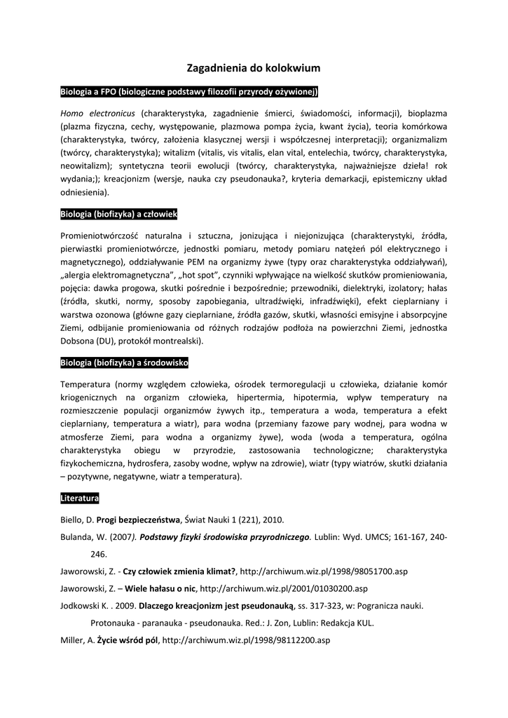 Zagadnienia do kolokwium Biologia a FPO (biologiczne podstawy filozofii przyrody ożywionej) Homo electronicus (charakterystyka, zagadnienie śmierci, świadomości, informacji), bioplazma (plazma fizyczna, cechy, występowanie, plazmowa pompa życia, kwant życia), teoria komórkowa (charakterystyka, twórcy, założenia klasycznej wersji i współczesnej interpretacji); organizmalizm (twórcy, charakterystyka); witalizm (vitalis, vis vitalis, elan vital, entelechia, twórcy, charakterystyka, neowitalizm); syntetyczna teorii ewolucji (twórcy, charakterystyka, najważniejsze dzieła! rok wydania;); kreacjonizm (wersje, nauka czy pseudonauka?, kryteria demarkacji, epistemiczny układ odniesienia). Biologia (biofizyka) a człowiek Promieniotwórczośd naturalna i sztuczna, jonizująca i niejonizująca (charakterystyki, źródła, pierwiastki promieniotwórcze, jednostki pomiaru, metody pomiaru natężeo pól elektrycznego i magnetycznego), oddziaływanie PEM na organizmy żywe (typy oraz charakterystyka oddziaływao), „alergia elektromagnetyczna”, „hot spot”, czynniki wpływające na wielkośd skutków promieniowania, pojęcia: dawka progowa, skutki pośrednie i bezpośrednie; przewodniki, dielektryki, izolatory; hałas (źródła, skutki, normy, sposoby zapobiegania, ultradźwięki, infradźwięki), efekt cieplarniany i warstwa ozonowa (główne gazy cieplarniane, źródła gazów, skutki, własności emisyjne i absorpcyjne Ziemi, odbijanie promieniowania od różnych rodzajów podłoża na powierzchni Ziemi, jednostka Dobsona (DU), protokół montrealski). Biologia (biofizyka) a środowisko Temperatura (normy względem człowieka, ośrodek termoregulacji u człowieka, działanie komór kriogenicznych na organizm człowieka, hipertermia, hipotermia, wpływ temperatury na rozmieszczenie populacji organizmów żywych itp., temperatura a woda, temperatura a efekt cieplarniany, temperatura a wiatr), para wodna (przemiany fazowe pary wodnej, para wodna w atmosferze Ziemi, para wodna a organizmy żywe), woda (woda a temperatura, ogólna charakterystyka obiegu w przyrodzie, zastosowania technologiczne; charakterystyka fizykochemiczna, hydrosfera, zasoby wodne, wpływ na zdrowie), wiatr (typy wiatrów, skutki działania – pozytywne, negatywne, wiatr a temperatura). Literatura Biello, D. Progi bezpieczeostwa, Świat Nauki 1 (221), 2010. Bulanda, W. (2007). Podstawy fizyki środowiska przyrodniczego. Lublin: Wyd. UMCS; 161-167, 240246. Jaworowski, Z. - Czy człowiek zmienia klimat?, http://archiwum.wiz.pl/1998/98051700.asp Jaworowski, Z. – Wiele hałasu o nic, http://archiwum.wiz.pl/2001/01030200.asp Jodkowski K. . 2009. Dlaczego kreacjonizm jest pseudonauką, ss. 317-323, w: Pogranicza nauki. Protonauka - paranauka - pseudonauka. Red.: J. Zon, Lublin: Redakcja KUL. Miller, A. Życie wśród pól, http://archiwum.wiz.pl/1998/98112200.asp Pieokowski, A. - Dziura coraz większa, http://archiwum.wiz.pl/2000/00121100.asp Pieokowski, A. - Nowy gaz cieplarniany, http://archiwum.wiz.pl/2000/00113900.asp Pieokowski, A.- Wyrok na CO2, http://archiwum.wiz.pl/1998/98051800.asp Sedlak, W. Bioplazma jako podstawowa metoda sondażu życia, RF XXVII, 3, 103-122. Siemioski, M. (1994). Fizyka zagrożeń środowiska. Warszawa: Wyd. Nauk. PWN; 19-37 Subocz, P. - Życie jest światłem, - Homo electronicus - jego pojęcia i logika; - Oto homo zwany electronicus; - Bioelektroniczna koncepcja abiogenezy wg ks. Prof. W. Sedlaka ( http://www.sm.fki.pl/Sedlak/x_sedlak.php?nr=23) Zon, J. 2000. Bioplazma i plazma fizyczna w układach żywych. Studium przyrodnicze i filozoficzne. Lublin: Redakcja Wydawnictw KUL, ss. 340. (podyktowana notatka)