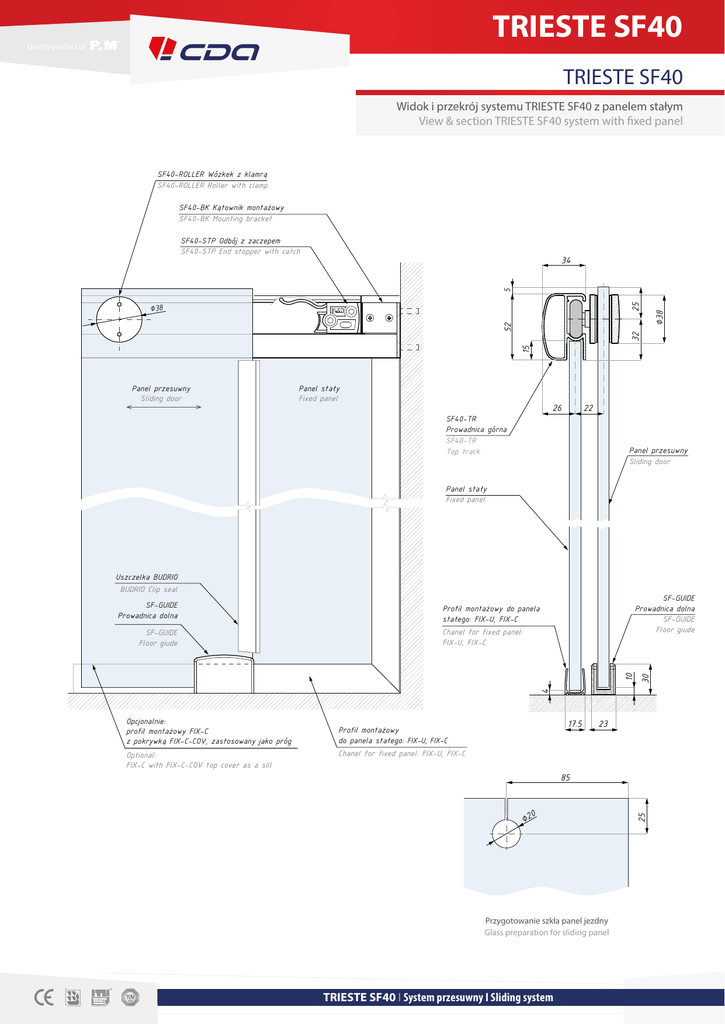 TRIESTE SF40 Quality product of TRIESTE SF40 Widok i przekrój systemu TRIESTE SF40 z panelem stałym View & section TRIESTE SF40 system with fixed panel SF40-ROLLER Wózkek z klamrą SF40-ROLLER Roller with clamp SF40-BK Kątownik montażowy SF40-BK Mounting bracket SF40-STP Odbój z zaczepem SF40-STP End stopper with catch 15 32 52 25 ∅38 ∅38 5 34 Panel przesuwny Sliding door Panel stały Fixed panel 26 SF40-TR Prowadnica górna SF40-TR Top track 22 Panel przesuwny Sliding door Panel stały Fixed panel Uszczelka BUDRIO BUDRIO Clip seal Chanel for fixed panel: FIX-U, FIX-C 4 10 SF-GUIDE Floor giude SF-GUIDE Prowadnica dolna SF-GUIDE Floor giude Profil montażowy do panela stałego: FIX-U, FIX-C 30 SF-GUIDE Prowadnica dolna Optional: FIX-C with FIX-C-COV top cover as a sill 17.5 Profil montażowy do panela stałego: FIX-U, FIX-C 23 Chanel for fixed panel: FIX-U, FIX-C 85 0 ∅2 Przygotowanie szkła panel jezdny Glass preparation for sliding panel TRIESTE SF40 І System przesuwny І Sliding system 25 Opcjonalnie: profil montażowy FIX-C z pokrywką FIX-C-COV, zastosowany jako próg