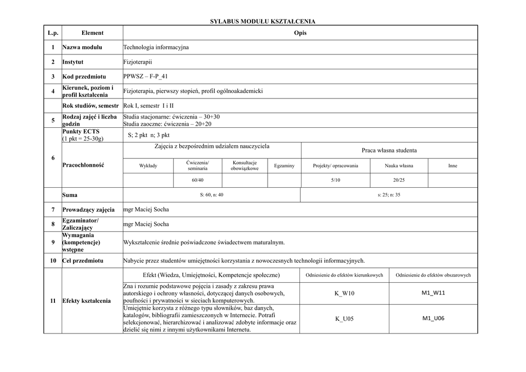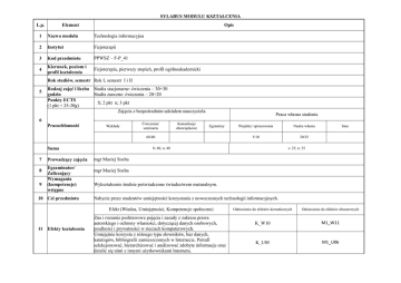 SYLABUS MODUŁU KSZTAŁCENIA L.p. Element Opis 1 Nazwa modułu Technologia informacyjna 2 Instytut Fizjoterapii 3 Kod przedmiotu PPWSZ – F-P_41 4 Kierunek, poziom i profil kształcenia Fizjoterapia, pierwszy stopień, profil ogólnoakademicki Rok studiów, semestr Rok I, semestr I i II 5 Rodzaj zajęć i liczba godzin Punkty ECTS (1 pkt = 25-30g) Studia stacjonarne: ćwiczenia – 30+30 Studia zaoczne: ćwiczenia – 20+20 S; 2 pkt n; 3 pkt Zajęcia z bezpośrednim udziałem nauczyciela 6 Pracochłonność Wykłady Ćwiczenia/ seminaria Konsultacje obowiązkowe Praca własna studenta Egzaminy 60/40 Suma 7 8 9 Prowadzący zajęcia Egzaminator/ Zaliczający Wymagania (kompetencje) wstępne 10 Cel przedmiotu Efekty kształcenia Nauka własna 5/10 20/25 S: 60, n: 40 Inne s: 25; n: 35 mgr Maciej Socha mgr Maciej Socha Wykształcenie średnie poświadczone świadectwem maturalnym. Nabycie przez studentów umiejętności korzystania z nowoczesnych technologii informacyjnych. Efekt (Wiedza, Umiejętności, Kompetencje społeczne) 11 Projekty/ opracowania Zna i rozumie podstawowe pojęcia i zasady z zakresu prawa autorskiego i ochrony własności, dotyczącej danych osobowych, poufności i prywatności w sieciach komputerowych. Umiejętnie korzysta z różnego typu słowników, baz danych, katalogów, bibliografii zamieszczonych w Internecie. Potrafi selekcjonować, hierarchizować i analizować zdobyte informacje oraz dzielić się nimi z innymi użytkownikami Internetu. Odniesienie do efektów kierunkowych Odniesienie do efektów obszarowych K_W10 M1_W11 K_U05 M1_U06 L.p. Element Opis Posiada umiejętność prowadzenia dokumentacji w rożnych podmiotach leczniczych dotyczącej pacjentów oraz podejmowanych działań z zakresu fizjoterapii na przykładzie programów komputerowych w wersjach demonstracyjnych. Potrafi sporządzać dokumenty multimedialne, przygotować formularze, prezentacje i publikować je w Internecie. Forma i warunki 12 potwierdzenia efektu kształcenia Efekt kształcenia K_W10, K_U05, K_U08, K_U11 K_U08 M1_U06 M1_U09 K_U11 M1_U06 M1_U07 M1_U08 M1_U12 M1_U13 Sposób potwierdzenia (weryfikacji) Aktywne uczestnictwo w zajęciach. Wykonanie zleconych zadań. Opublikowanie prac w witrynie internetowej studenta. Podstawowym miejscem uzyskiwania i wymiany informacji jest portal Google.pl wraz z jego narzędziami wspomagającymi tworzenie dokumentów, publikowanie ich w witrynie internetowej studenta oraz prowadzenie korespondencji przez konto pocztowe studenta, grupę Treści merytoryczne dyskusyjną lub usługę czat. Studenci redagują i publikują artykuły multimedialne, formularze oraz prezentacje na tematy z zakresu 13 przedmiotu fizjoterapii. Opracowują i publikują biznesplan własnej działalności gospodarczej fizjoterapeuty. Na przykładach wersji demonstracyjnych programów komputerowych poznają sposoby prowadzenia dokumentacji medycznej pacjentów. Wykaz literatury Zasoby informacyjne Internetu. 14 podstawowej Wykaz literatury 15 uzupełniającej (pomocniczej)
