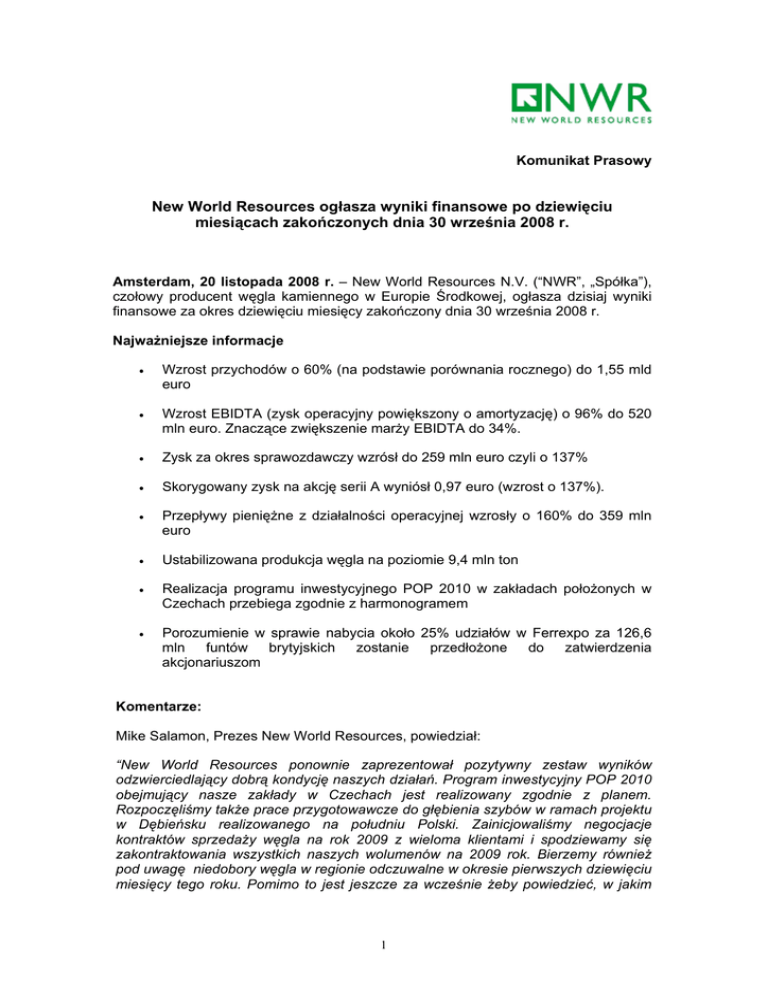 Komunikat Prasowy New World Resources ogłasza wyniki finansowe po dziewięciu miesiącach zakończonych dnia 30 września 2008 r. Amsterdam, 20 listopada 2008 r. – New World Resources N.V. (“NWR”, „Spółka”), czołowy producent węgla kamiennego w Europie Środkowej, ogłasza dzisiaj wyniki finansowe za okres dziewięciu miesięcy zakończony dnia 30 września 2008 r. Najważniejsze informacje • Wzrost przychodów o 60% (na podstawie porównania rocznego) do 1,55 mld euro • Wzrost EBIDTA (zysk operacyjny powiększony o amortyzację) o 96% do 520 mln euro. Znaczące zwiększenie marży EBIDTA do 34%. • Zysk za okres sprawozdawczy wzrósł do 259 mln euro czyli o 137% • Skorygowany zysk na akcję serii A wyniósł 0,97 euro (wzrost o 137%). • Przepływy pieniężne z działalności operacyjnej wzrosły o 160% do 359 mln euro • Ustabilizowana produkcja węgla na poziomie 9,4 mln ton • Realizacja programu inwestycyjnego POP 2010 w zakładach położonych w Czechach przebiega zgodnie z harmonogramem • Porozumienie w sprawie nabycia około 25% udziałów w Ferrexpo za 126,6 mln funtów brytyjskich zostanie przedłożone do zatwierdzenia akcjonariuszom Komentarze: Mike Salamon, Prezes New World Resources, powiedział: “New World Resources ponownie zaprezentował pozytywny zestaw wyników odzwierciedlający dobrą kondycję naszych działań. Program inwestycyjny POP 2010 obejmujący nasze zakłady w Czechach jest realizowany zgodnie z planem. Rozpoczęliśmy także prace przygotowawcze do głębienia szybów w ramach projektu w Dębieńsku realizowanego na południu Polski. Zainicjowaliśmy negocjacje kontraktów sprzedaży węgla na rok 2009 z wieloma klientami i spodziewamy się zakontraktowania wszystkich naszych wolumenów na 2009 rok. Bierzemy również pod uwagę niedobory węgla w regionie odczuwalne w okresie pierwszych dziewięciu miesięcy tego roku. Pomimo to jest jeszcze za wcześnie żeby powiedzieć, w jakim 1 stopniu na przebieg negocjacji wpłyną kwestie gospodarcze związane z sytuacją na rynku kredytów, które również dotykają naszych klientów z branży hutniczej . Zgodnie z regionalną strategią wzrostu, Zarząd NWR zgodził się na nabycie około 25% udziałów w spółce Ferrexpo, jednego z największych producentów granulatu (pelletu) rudy żelaza w Europie. Jest to unikalna okazja, która - jeżeli zostanie zaakceptowana przez naszych udziałowców - pozwoli na zdywersyfikowanie źródeł przychodów w ramach atrakcyjnego węglowo-stalowego łańcucha surowcowego. Pozwoli to również na umocnienie pozycji Spółki w regionie Europy ŚrodkowoWschodniej i ułatwi zaangażowanie się w potencjalne przedsięwzięcia związane z wydobyciem węgla na Ukrainie w perspektywie długoterminowej. Wybrane dane finansowe i operacyjne za pierwsze 9 za pierwsze 9 miesięcy 2008 miesięcy 2007 1.552.544 972.248 520.446 265.232 395.910 145.664 350.784 148.684 259.389 109.227 (w tys. EUR, narastająco od początku roku) Przychody EBITDA Zysk na działalności operacyjnej Zysk przed opodatkowaniem* Zysk za okres sprawozdawczy Skorygowany zysk na jedną akcję serii A ** Aktywa razem Przepływy pieniężne netto z działalności operacyjnej Zadłużenie netto Kapitał obrotowy netto Nakłady kapitałowe Wielkość sprzedaży węgla i koksu*** Łączne wydobycie węgla *** Średnia liczba pracowników**** Wskaźnik częstotliwości wypadków powodujących utratę czasu pracy Zmiana % 60% 96% 172% 136% 137% 0,97 0,41 137% 2.948.991 2.144.126 17% 359.394 352.818 (65.369) 163.811 138.238 429.520 49.781 55.300 160% (18%) 231% 196% 9.435 9.408 21.301 9.604 9.373 22.031 (2%) 0% (3%) 13,25 16,13 (18%) * z działalności kontynuowanej ** skorygowany według aktualnej liczny akcji, zob. także pkt „Zysk na akcję” *** w tys. ton **** łącznie z wykonawcami Solidne wyniki Dobre wyniki za okres dziewięciu miesięcy zakończony dnia 30 września 2008 roku, odzwierciedlają stabilną sytuację operacyjną oraz solidne rezultaty osiągane dzięki produkcji węgla i koksu. Wskaźnik EBITDA wyniósł 520 mln euro za okres sprawozdawczy, co oznacza wzrost o 96% w porównaniu z pierwszymi dziewięcioma miesiącami 2007 r. Dzięki temu marża EBITDA wyniosła 34%, czyli tyle samo co w pierwszej połowie 2008 roku. Koszty podstawowe wzrosły o około 11%, co jest zadowalającym wynikiem biorąc pod uwagę wzrost kosztów odczuwalnych przez cały sektor. 2 Skorygowany zysk na akcję serii A zwiększył się o 137%, czyli do 0,97 euro dzięki znaczącemu wzrostowi przychodów spowodowanemu wyższymi cenami węgla i niższymi obciążeniami podatkowymi. Poziom produkcji pozostał stabilny w porównaniu do tego samego okresu 2007 r. i NWR jest na dobrej drodze, aby osiągnąć założony roczny poziom produkcji wynoszący 12,8 mln ton węgla. Realizacja programu inwestycyjnego NWR wykorzystującego najnowocześniejsze technologie postępuje zgodnie z naszym planem. Wdrożenie POP 2010 przyniesie wzrost wydajności, podwyższenie bezpieczeństwa pracy i wzrost niezawodności, jak też umożliwi eksploatację pokładów na większej szerokości. Kontynuowane są również prace w ramach projektu Dębieńsko. Kontynuujemy nasze starania, aby wykorzystać pojawiające się okazje w regionie Europy Środkowo-Wschodniej, zarówno poprzez wzrost organiczny jak i akwizycje. Zgodnie z tą strategią NWR proponuje nabycie około 25% udziałów w Ferrexpo za 126,6 mln funtów brytyjskich. Zdrowie i bezpieczeństwo Zdrowie i bezpieczeństwo pracowników są priorytetami NWR. Nieustannie dokładamy wysiłków na rzecz poprawy warunków pracy w naszych zakładach. Nasz wskaźnik wypadków powodujących przerwy w pracy w pierwszych dziewięciu miesiącach 2008 r. spadł o niemal 20% w porównaniu do analogicznego okresu w roku poprzednim. Nowe informacje dotyczące POP 2010 Realizacja I Fazy Programu Optymalizacji Produkcji (POP 2010) przebiega zgodnie z naszym planem. W ramach I Fazy 