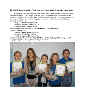 30.11.2016. Szkolny Konkurs Plastyczny, pt.: „Piękny uśmiech mam, bo o zęby dbam” W bieżącym roku szkolnym uczniowie naszej szkoły biorą udział w programie " Chroń Dziecięce Uśmiechy". W ramach realizacji zadań wynikających z ww. programu został ogłoszony konkurs, którego celem było wyłonienie najciekawszych kompozycji plastycznych promujących higienę jamy ustnej. Nagrodzono uczniów w obu kategoriach wiekowych. Laureaci w klasach I-III: I miejsce - Wiktor Grygier, kl. 2b, II miejsce- Wiktoria Opacka, kl. 3c, III miejsce- Nadia Zielony, kl. 1a; Wyróżnienia zdobyli uczniowie kl. 2b: Nadia Kanik i Tymon Mazepa. Laureaci w klasach I-IV: I miejsce – Marta Sacewicz, kl. 6a, II miejsce- Anna Skwira, kl. 6a, III miejsce- Joanna Blumert, kl. 5c; Wyróżnienia zdobyły uczennice : Klaudia Mucha, kl. 5a i Katarzyna Prusaczyk, kl. 6d. Zwycięzcom gratulujemy i życzymy kolejnych sukcesów! Zofia Alama- Cieśla