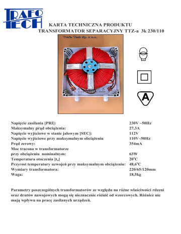 KARTA TECHNICZNA PRODUKTU TRANSFORMATOR SEPARACYJNY TTZ-a 3k 230/110 Napięcie zasilania [PRI]: Maksymalny prąd obciążenia: Napięcie wyjściowe w stanie jałowym [SEC]: Napięcie wyjściowe przy maksymalnym obciążeniu Prąd zerowy: Moc tracona w transformatorze przy obciążeniu nominalnym: Temperatura otoczenia [ta] Przyrost temperatury uzwojeń przy maksymalnym obciążeniu: Wymiary transformatora: Waga: 230V ~50Hz 27,3A 112V 110V~50Hz 354mA 63W 20oC 48,6oC 220/65/120mm 18,5kg Parametry poszczególnych transformatorów ze względu na różne właściwości rdzeni oraz drutów nawojowych mogą się nieznacznie różnić od wzorcowych. Różnice nie mają wpływu na pracę zasilanych urządzeń. OBUDOWA TRANSFORMATORA TTZ-a 3k 230/110 Obudowa firmy ENSTO IP 67 Wyposażenie: Podstawa, pokrywa, śruby do przykręcenia pokrywy, śruby do płyty montażowej/szyny DIN Opis: Obudowa ABS Uwagi: Pokrywa szara Grupa produktów: Ensto CUBO Wymiary Szerokość (mm): 300 Wysokość (mm): 300 Głębokość (mm): 132 Materiały Materiał: ABS Kolor podstawy: RAL 7035 Kolor pokrywy: Szara Materiał śrub do pokryw: Poliamid Kolor śrub do pokryw: RAL 7035 Materiał uszczelki: PUR (Poliuretan) Parametry techniczne Stopień ochrony IP : IP 66/67 Wytrzymałość mechaniczna IK : IK 07/IK 06 Klasa palności : UL 94 V-2...5VA