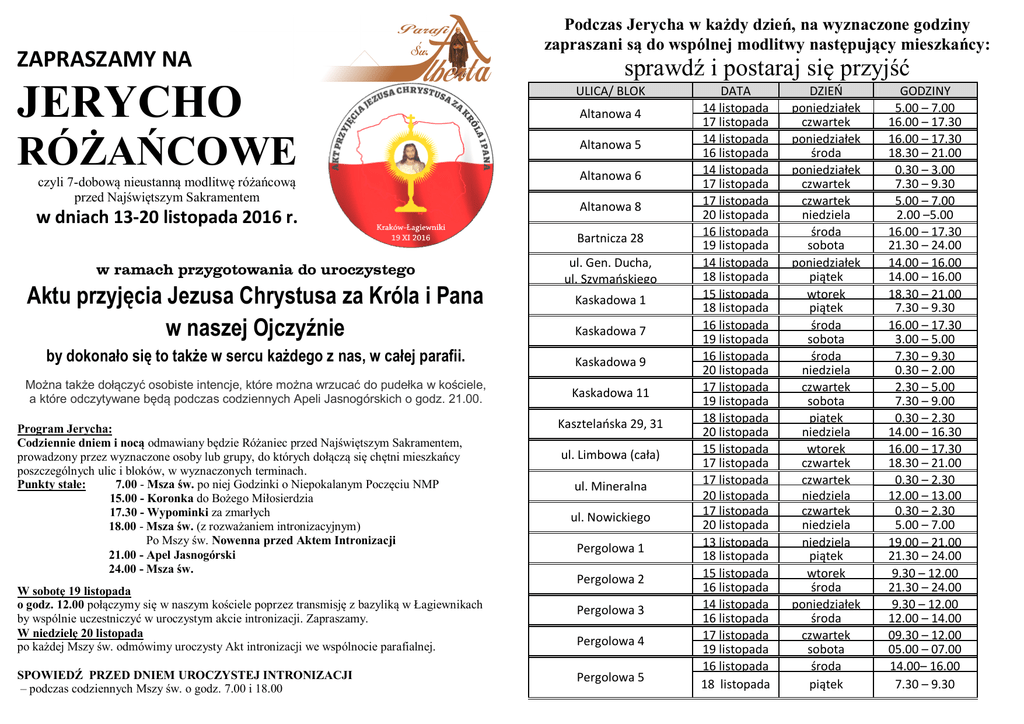 ZAPRASZAMY NA Podczas Jerycha w każdy dzień, na wyznaczone godziny zapraszani są do wspólnej modlitwy następujący mieszkańcy: sprawdź i postaraj się przyjść JERYCHO ULICA/ BLOK RÓŻAŃCOWE Altanowa 5 czyli 7-dobową nieustanną modlitwę różańcową przed Najświętszym Sakramentem w dniach 13-20 listopada 2016 r. Altanowa 4 Altanowa 6 Altanowa 8 Bartnicza 28 w ramach przygotowania do uroczystego Aktu przyjęcia Jezusa Chrystusa za Króla i Pana w naszej Ojczyźnie ul. Gen. Ducha, ul. Szymańskiego Kaskadowa 1 Kaskadowa 7 by dokonało się to także w sercu każdego z nas, w całej parafii. Kaskadowa 9 Można także dołączyć osobiste intencje, które można wrzucać do pudełka w kościele, a które odczytywane będą podczas codziennych Apeli Jasnogórskich o godz. 21.00. Kaskadowa 11 Program Jerycha: Codziennie dniem i nocą odmawiany będzie Różaniec przed Najświętszym Sakramentem, prowadzony przez wyznaczone osoby lub grupy, do których dołączą się chętni mieszkańcy poszczególnych ulic i bloków, w wyznaczonych terminach. Punkty stałe: 7.00 - Msza św. po niej Godzinki o Niepokalanym Poczęciu NMP 15.00 - Koronka do Bożego Miłosierdzia 17.30 - Wypominki za zmarłych 18.00 - Msza św. (z rozważaniem intronizacyjnym) Po Mszy św. Nowenna przed Aktem Intronizacji 21.00 - Apel Jasnogórski 24.00 - Msza św. W sobotę 19 listopada o godz. 12.00 połączymy się w naszym kościele poprzez transmisję z bazyliką w Łagiewnikach by wspólnie uczestniczyć w uroczystym akcie intronizacji. Zapraszamy. W niedzielę 20 listopada po każdej Mszy św. odmówimy uroczysty Akt intronizacji we wspólnocie parafialnej. SPOWIEDŹ PRZED DNIEM UROCZYSTEJ INTRONIZACJI – podczas codziennych Mszy św. o godz. 7.00 i 18.00 Kasztelańska 29, 31 ul. Limbowa (cała) ul. Mineralna ul. Nowickiego Pergolowa 1 Pergolowa 2 Pergolowa 3 Pergolowa 4 Pergolowa 5 DATA 14 listopada 17 listopada 14 listopada 16 listopada 14 listopada 17 listopada 17 listopada 20 listopada 16 listopada 19 listopada 14 listopada 18 listopada 15 listopada 18 listopada 16 listopada 19 listopada 16 listopada 20 listopada 17 listopada 19 listopada 18 listopada 20 listopada 15 listopada 17 listopada 17 listopada 20 listopada 17 listopada 20 listopada 13 listopada 18 listopada 15 listopada 16 listopada 14 listopada 16 listopada 17 listopada 19 listopada 16 listopada 18 listopada DZIEŃ poniedziałek czwartek poniedziałek środa poniedziałek czwartek czwartek niedziela środa sobota poniedziałek piątek wtorek piątek środa sobota środa niedziela czwartek sobota piątek niedziela wtorek czwartek czwartek niedziela czwartek niedziela niedziela piątek wtorek środa poniedziałek środa czwartek sobota środa piątek GODZINY 5.00 – 7.00 16.00 – 17.30 16.00 – 17.30 18.30 – 21.00 0.30 – 3.00 7.30 – 9.30 5.00 – 7.00 2.00 –5.00 16.00 – 17.30 21.30 – 24.00 14.00 – 16.00 14.00 – 16.00 18.30 – 21.00 7.30 – 9.30 16.00 – 17.30 3.00 – 5.00 7.30 – 9.30 0.30 – 2.00 2.30 – 5.00 7.30 – 9.00 0.30 – 2.30 14.00 – 16.30 16.00 – 17.30 18.30 – 21.00 0.30 – 2.30 12.00 – 13.00 0.30 – 2.30 5.00 – 7.00 19.00 – 21.00 21.30 – 24.00 9.30 – 12.00 21.30 – 24.00 9.30 – 12.00 12.00 – 14.00 09.30 – 12.00 05.00 – 07.00 14.00– 16.00 7.30 – 9.30 ul. Poligonowa Poligonowa 10 i 12 Poligonowa 2B Poligonowa 8 ul. Północna Relaksowa 2 Relaksowa 4 Relaksowa 6, 12 Relaksowa 8 Relaksowa 11 Relaksowa 13, 15 Relaksowa 14, 16 Relaksowa 17 Relaksowa 25, 27 ul. Sławinek Tarasowa 2A, 4 Tarasowa 3, 5, 6 ul. Willowa Willowa 1 Willowa 21 17 listopada 19 listopada 15 listopada 18 listopada 15 listopada 19 listopada 13 listopada 19 listopada 15 listopada 17 listopada 14 listopada 18 listopada 14 listopada 16 listopada 15 listopada 18 listopada 15 listopada 18 listopada 15 listopada 17 listopada 17 listopada 18 listopada 15 listopada 16 listopada 15 listopada 16 listopada 17 listopada 19 listopada 14 listopada 19 listopada 14 listopada 19 listopada 14 listopada 16 listopada 14 listopada 19 listopada 16 listopada 19 listopada 15 listopada 18 listopada czwartek sobota wtorek piątek wtorek sobota niedziela sobota wtorek czwartek poniedziałek piątek poniedziałek środa wtorek piątek wtorek piątek wtorek czwartek czwartek piątek wtorek środa wtorek środa czwartek sobota poniedziałek sobota poniedziałek sobota poniedziałek środa poniedziałek sobota środa sobota wtorek piątek 12.00 - 14.00 0.30 – 3.00 3.00 – 5.00 12.00 – 14.00 21.30 – 24.00 12.30 – 15.00 21.30 – 24.00 18.30 – 21.00 12.00 – 14.00 14.00 – 16.00 21.30 – 24.00 05.00 – 07.00 18.30 – 21.00 5.00 – 7.00 7.30 – 9.30 2.30 – 5.00 5.00 – 7.00 18.30 – 21.00 16.00 – 17.30 18.30 – 21.00 9.30 – 12.00 9.30 – 12.00 14.00 – 16.00 21.30 – 24.00 21.30 – 24.00 9.30 – 12.00 21.30 – 24.00 15.00 – 17.30 9.30 – 12.00 12.00 – 12.30 3.00 – 5.00 10.00 – 12.00 7.30 – 9.30 3.00 – 5.00 12.00 – 14.00 9.00 – 10.00 0.30 – 3.00 12.00 –12.30 0.30 – 3.00 16.00 – 17.30 Można przyjść także w innym czasie, by wspomagać się w modlitwie. Szczególnie zapraszamy na punkty stałe: Msze św. (7.00, 18.00, 24.00) i Apel jasnogórski (21.00) Specjalne godziny modlitwy mają GRUPY PARAFIALNE Róża Różańcowa- dzieci –Matki 19 listopad Bożej Pompejańskiej Dzieci do I Komunii Ministranci i lektorzy Domowy Kościół Rada Parafialna Młodzież Franciszkańska i Kandydaci do Bierzmowania Wspólnota Modlitewna Najświętszego Imienia Jezus Prezydium Legionu Maryi M.B. Kalwaryjskiej Koło Różańcowe M. B Różańcowej Koło Różańcowe M.B. Królowej Polski Koło Różańcowe M.B. Nieustaj. Pomocy Koło Różańcowe M.B. Niepokalanej Koło Różańcowe M.B. Fatimskiej Koło Różańcowe M.B. Kalwaryjskiej Koło Różańcowe M.B. Pocieszenia Koło Różańcowe M.B. Królowej Rodzin sobota 12.00 – 12.30 17 listopad 19 listopad 14 listopad 20 listopad 18 listopad 20 listopad