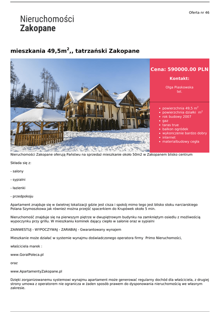 Oferta nr 46 mieszkania 49,5m2,, tatrzański Zakopane Cena: 590000.00 PLN Kontakt: Olga Piaskowska tel. powierzchnia 49,5 m2 powierzchnia działki m2 rok budowy 2007 gaz taras true balkon ogródek wykonczenie bardzo dobry internet materialbudowy cegła Nieruchomości Zakopane oferują Państwu na sprzedaż mieszkanie około 50m2 w Zakopanem blisko centrum Składa się z: - salony - sypialni - łazienki - przedpokoju Apartament znajduje się w świetnej lokalizacji gdzie jest cisza i spokój mimo tego jest blisko stoku narciarskiego Polana Szymoszkowa jak również można przejść spacerkiem do Krupówek około 5 min. Nieruchomość znajduje się na pierwszym piętrze w dwupiętrowym budynku na zamkniętym osiedlu z możliwością wypoczynku przy grillu. W mieszkaniu kominek dający ciepło w salonie oraz w sypialni ZAINWESTUJ - WYPOCZYWAJ - ZARABIAJ - Gwarantowany wynajem Mieszkanie może działać w systemie wynajmu doświadczonego operatora firmy Primo Nieruchomości, właściciela marek : www.GoralPoleca.pl oraz www.ApartamentyZakopane.pl Dzięki zorganizowanemu systemowi wynajmu apartament może generować regularny dochód dla właściciela, z drugiej strony umowa z operatorem nie ogranicza w żaden sposób prawem do dysponowania nieruchomością we własnym zakresie. Lokalizacja apartamentu gwarantuje zwrot inwestycyjny przy wynajmie turystycznym. Do mieszkania w cenie garaż. Cena: 590 000 PLN Zapraszam do kontaktu: Olga Piaskowska 530 460 111 Treść niniejszego ogłoszenia nie stanowi oferty handlowej w rozumieniu Kodeksu Cywilnego. Oferta wysłana z programu IMO dla biur nieruchomości Galeria Osoba kontaktowa: Olga Piaskowska tel. www.nieruchomoscizakopane.pl Powered by TCPDF (www.tcpdf.org)