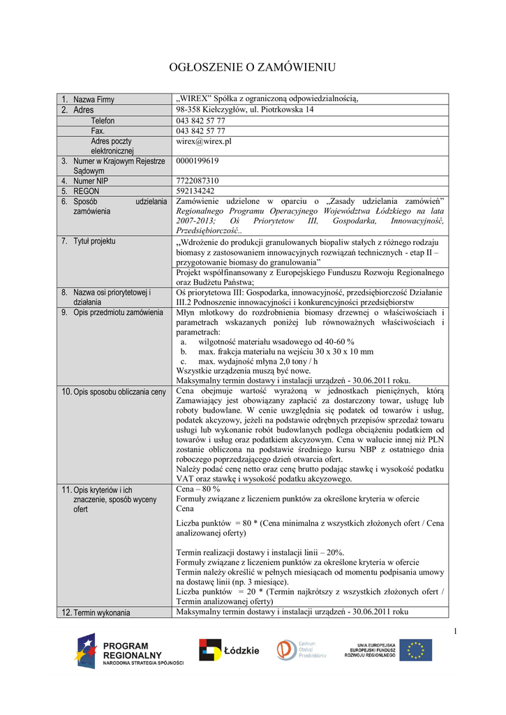 OGŁOSZENIE O ZAMÓWIENIU 1. Nazwa Firmy 2. Adres 3. 4. 5. 6. Telefon Fax. Adres poczty elektronicznej Numer w Krajowym Rejestrze Sądowym Numer NIP REGON Sposób udzielania zamówienia 7. Tytuł projektu 8. Nazwa osi priorytetowej i działania 9. Opis przedmiotu zamówienia 10. Opis sposobu obliczania ceny 11. Opis kryteriów i ich znaczenie, sposób wyceny ofert „WIREX” Spółka z ograniczoną odpowiedzialnością, 98-358 Kiełczygłów, ul. Piotrkowska 14 043 842 57 77 043 842 57 77 [email protected] 0000199619 7722087310 592134242 Zamówienie udzielone w oparciu o „Zasady udzielania zamówień” Regionalnego Programu Operacyjnego Województwa Łódzkiego na lata 2007-2013; Oś Priorytetow III, Gospodarka, Innowacyjność, Przedsiębiorczość.. „Wdrożenie do produkcji granulowanych biopaliw stałych z różnego rodzaju biomasy z zastosowaniem innowacyjnych rozwiązań technicznych - etap II – przygotowanie biomasy do granulowania” Projekt współfinansowany z Europejskiego Funduszu Rozwoju Regionalnego oraz Budżetu Państwa; Oś priorytetowa III: Gospodarka, innowacyjność, przedsiębiorczość Działanie III.2 Podnoszenie innowacyjności i konkurencyjności przedsiębiorstw Młyn młotkowy do rozdrobnienia biomasy drzewnej o właściwościach i parametrach wskazanych poniżej lub równoważnych właściwościach i parametrach: a. wilgotność materiału wsadowego od 40-60 % b. max. frakcja materiału na wejściu 30 x 30 x 10 mm c. max. wydajność młyna 2,0 tony / h Wszystkie urządzenia muszą być nowe. Maksymalny termin dostawy i instalacji urządzeń - 30.06.2011 roku. Cena obejmuje wartość wyrażoną w jednostkach pieniężnych, którą Zamawiający jest obowiązany zapłacić za dostarczony towar, usługę lub roboty budowlane. W cenie uwzględnia się podatek od towarów i usług, podatek akcyzowy, jeżeli na podstawie odrębnych przepisów sprzedaż towaru usługi lub wykonanie robót budowlanych podlega obciążeniu podatkiem od towarów i usług oraz podatkiem akcyzowym. Cena w walucie innej niż PLN zostanie obliczona na podstawie średniego kursu NBP z ostatniego dnia roboczego poprzedzającego dzień otwarcia ofert. Należy podać cenę netto oraz cenę brutto podając stawkę i wysokość podatku VAT oraz stawkę i wysokość podatku akcyzowego. Cena – 80 % Formuły związane z liczeniem punktów za określone kryteria w ofercie Cena Liczba punktów = 80 * (Cena minimalna z wszystkich złożonych ofert / Cena analizowanej oferty) 12. Termin wykonania Termin realizacji dostawy i instalacji linii – 20%. Formuły związane z liczeniem punktów za określone kryteria w ofercie Termin należy określić w pełnych miesiącach od momentu podpisania umowy na dostawę linii (np. 3 miesiące). Liczba punktów = 20 * (Termin najkrótszy z wszystkich złożonych ofert / Termin analizowanej oferty) Maksymalny termin dostawy i instalacji urządzeń - 30.06.2011 roku 1 zamówienia 13. Opis sposobu przygotowania ofert 14. Miejsce oraz termin składania i otwarcia ofert 15. Opis warunków udziału w postępowaniu oraz sposobu dokonywania oceny spełnienia tych warunków . Oferty proszę składać w formie pisemnej w języku polskim w zamkniętych kopertach z podaniem na kopercie nazwy składającego zamówienie oraz z dopiskiem „Odpowiedź na zamówienie – Młyn młotkowy”. 98-358 Kiełczygłów, ul. Piotrkowska 14 – siedziba spółki. termin składania ofert – od 26.01.2011 do 04.02.2011 do godz. 15:00 termin otwarcia ofert - 04.02.2011 godz. 16:00 W przypadku nadania oferty przesyłką pocztową, kurierską lub w inny sposób oferta zostanie prawidłowo złożona jeżeli wpłynie do siedziby spółki przed upływem terminu składania ofert. Zamawiający zastrzega sobie możliwość zmiany warunków zamówienia lub unieważnienia postępowania. 2