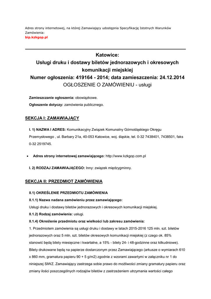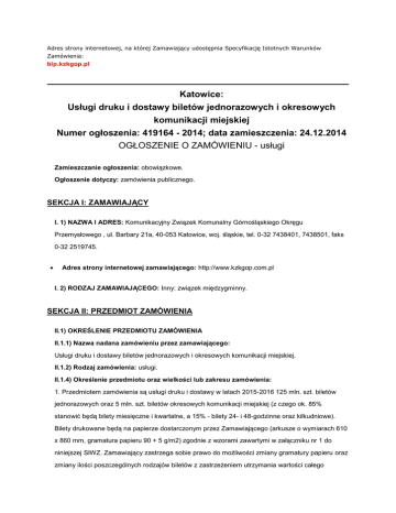 Adres strony internetowej, na której Zamawiający udostępnia Specyfikację Istotnych Warunków Zamówienia: bip.kzkgop.pl Katowice: Usługi druku i dostawy biletów jednorazowych i okresowych komunikacji miejskiej Numer ogłoszenia: 419164 - 2014; data zamieszczenia: 24.12.2014 OGŁOSZENIE O ZAMÓWIENIU - usługi Zamieszczanie ogłoszenia: obowiązkowe. Ogłoszenie dotyczy: zamówienia publicznego. SEKCJA I: ZAMAWIAJĄCY I. 1) NAZWA I ADRES: Komunikacyjny Związek Komunalny Górnośląskiego Okręgu Przemysłowego , ul. Barbary 21a, 40-053 Katowice, woj. śląskie, tel. 0-32 7438401, 7438501, faks 0-32 2519745. Adres strony internetowej zamawiającego: http://www.kzkgop.com.pl I. 2) RODZAJ ZAMAWIAJĄCEGO: Inny: związek międzygminny. SEKCJA II: PRZEDMIOT ZAMÓWIENIA II.1) OKREŚLENIE PRZEDMIOTU ZAMÓWIENIA II.1.1) Nazwa nadana zamówieniu przez zamawiającego: Usługi druku i dostawy biletów jednorazowych i okresowych komunikacji miejskiej. II.1.2) Rodzaj zamówienia: usługi. II.1.4) Określenie przedmiotu oraz wielkości lub zakresu zamówienia: 1. Przedmiotem zamówienia są usługi druku i dostawy w latach 2015-2016 125 mln. szt. biletów jednorazowych oraz 5 mln. szt. biletów okresowych komunikacji miejskiej (z czego ok. 85% stanowić będą bilety miesięczne i kwartalne, a 15% - bilety 24- i 48-godzinne oraz kilkudniowe). Bilety drukowane będą na papierze dostarczonym przez Zamawiającego (arkusze o wymiarach 610 x 860 mm, gramatura papieru 90 + 5 g/m2) zgodnie z wzorami zawartymi w załączniku nr 1 do niniejszej SIWZ. Zamawiający zastrzega sobie prawo do możliwości zmiany gramatury papieru oraz zmiany ilości poszczególnych rodzajów biletów z zastrzeżeniem utrzymania wartości całego zamówienia. W ramach przedmiotu zamówienia, przy każdorazowej zmianie cen, szaty graficznej biletów, Wykonawca wykona specimeny w ilości 20 szt. każdego nominału biletu, który uległ zmianie. 2.1. Wymagania dotyczące biletów jednorazowych: a) bilet jednorazowy winien mieć wymiar: 7,5 cm x 3,5 cm. b) bilety winny być klejone w bloczkach po 100 szt., umieszczonych w tzw. opakowaniu zbiorczym po 100 bloczków (np. folia przezroczysta). Każdorazowa partia biletów winna być dostarczona w paczkach, tj. tzw. opakowaniu transportowym, na które składa się 5 opakowań zbiorczych. 2.1.1. Zamawiający zastrzega sobie prawo zmiany obecnych wzorów biletów, w tym także kształtu hologramu, oraz wprowadzenia nowych dodatkowych wzorów w trakcie trwania Umowy oraz zmiany treści umieszczonej na odwrocie biletu. Projekt graficzny biletu przygotowywany będzie przez Wykonawcę. Koszt wykonania nowych projektów lub zmiany kształtu hologramu powinien być wliczony w cenę biletów. 2.1.2. Wymagane zabezpieczenie biletów: a) numer świecący w UV, b) mikrodruk o treści KZK GOP, c) gilosz lub ornament, d) hologram (o wymiarach 12 x 4 mm), e) farba termiczna: - kolor nr 2708, - miejsce nasycenia - strzałki wskazujące miejsce kasowania, - wysokość temperatury powodującej przebarwienie koloru +310 C . 2.2. Wymagania dotyczące biletów okresowych: 2.2.1. Wymiary biletów: a) bilety miesięczne, kwartalne, wakacyjne i R-1: 7 cm x 9,7 cm b) bilety 24- i 48-godzinne oraz kilkudniowe: 14 cm x 3,5 cm 2.2.2. Wymagane zabezpieczenie biletów: a) tło reliefowe z podłużnym napisem KZK GOP w górnej połowie biletu (nie dotyczy biletów 24- i 48-godzinnych oraz kilkudniowych), b) kostka przeciw ksero w dolnej połowie biletu (nie dotyczy biletów 24- i 48-godzinnych oraz kilkudniowych), c) numer serii biletu święcący w UV (kolor do uzgodnienia), d) mikrodruk o treści KZK GOP, e) hologram o powierzchni ok. 1 cm2 dla biletów miesięcznych, kwartalnych, wakacyjnych i R-1 oraz ok. 1,4 cm2 dla biletów 24- i 48-godzinnych oraz kilkudniowych, f) gilosz: lewa strona biletu 1,2 cm i prawa - 0,3 cm (nie dotyczy biletów 24- i 48-godzinnych oraz kilkudniowych oraz R-1), g) farba termiczna - wysokość temperatury powodującej przebarwienie koloru +310 C, kolor i miejsce na bilecie do uzgodnienia, powierzchnia 1 cm2 , h) farba sekretna. 2.2.3. Zamawiający zastrzega sobie prawo zmiany obecnych wzorów biletów oraz wprowadzenia nowych dodatkowych wzorów w trakcie trwania Umowy. Projekty graficzne będą przygotowywane przez Wykonawcę. Koszt wykonania nowych projektów powinien być wliczony w cenę biletów. 2.3. Zamawiający wymaga, aby bilety dostarczane były przez Wykonawcę do magazynu Zamawiającego. Transport musi być chroniony przez wyspecjalizowaną firmę. 2.4. Zamawiający przewiduje, że bilety będące przedmiotem zamówienia dostarczane będą przez okres 2 lat w częściach, których wielkość zależy od bieżącego zapotrzebowania Zamawiającego na bilety. Ilości druku poszczególnych nominałów biletów w każdej z części realizacji przedmiotu zamówienia oraz termin jej realizacji każdorazowo określony zostanie przez Zamawiającego w pisemnym zleceniu. 2.5. Na podstawie art. 36a ust. 2 pkt. 1 Pzp, Zamawiający zastrzega obowiązek osobistego wykonania przez Wykonawcę kluczowych części zamówienia, co obejmuje całość zamówienia, za wyjątkiem wykonania hologramu, którego wykonanie może być powierzone podwykonawcy. II.1.6) Wspólny Słownik Zamówień (CPV): 79.82.30.00-9. II.1.7) Czy dopuszcza się złożenie oferty częściowej: nie. II.1.8) Czy dopuszcza się złożenie oferty wariantowej: nie. II.2) CZAS TRWANIA ZAMÓWIENIA LUB TERMIN WYKONANIA: Okres w miesiącach: 24. SEKCJA III: INFORMACJE O CHARAKTERZE PRAWNYM, EKONOMICZNYM, FINANSOWYM I TECHNICZNYM III.2) ZALICZKI III.3) WARUNKI UDZIAŁU W POSTĘPOWANIU ORAZ OPIS SPOSOBU DOKONYWANIA OCENY SPEŁNIANIA TYCH WARUNKÓW III.3.2) Wiedza i doświadczenie Opis sposobu dokonywania oceny spełniania tego warunku o 1. O udzielenie zamówienia może ubiegać się Wykonawca, który należycie wykonał lub wykonuje w okresie ostatnich trzech lat przed upływem terminu składania ofert, a jeżeli okres prowadzenia