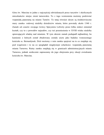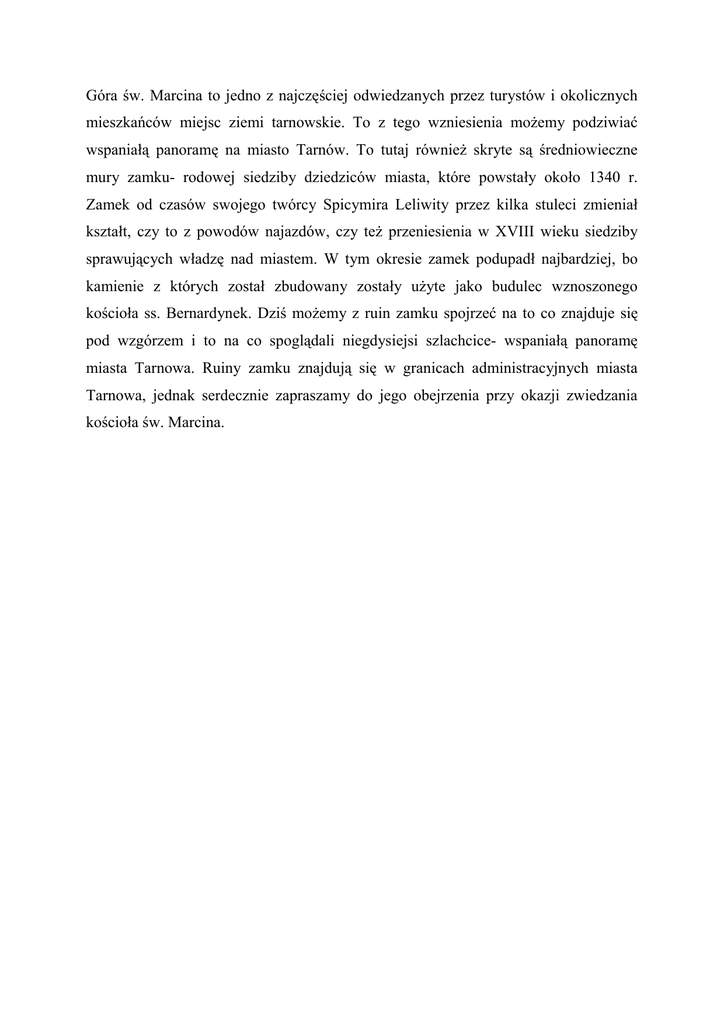Góra św. Marcina to jedno z najczęściej odwiedzanych przez turystów i okolicznych mieszkańców miejsc ziemi tarnowskie. To z tego wzniesienia możemy podziwiać wspaniałą panoramę na miasto Tarnów. To tutaj również skryte są średniowieczne mury zamku- rodowej siedziby dziedziców miasta, które powstały około 1340 r. Zamek od czasów swojego twórcy Spicymira Leliwity przez kilka stuleci zmieniał kształt, czy to z powodów najazdów, czy też przeniesienia w XVIII wieku siedziby sprawujących władzę nad miastem. W tym okresie zamek podupadł najbardziej, bo kamienie z których został zbudowany zostały użyte jako budulec wznoszonego kościoła ss. Bernardynek. Dziś możemy z ruin zamku spojrzeć na to co znajduje się pod wzgórzem i to na co spoglądali niegdysiejsi szlachcice- wspaniałą panoramę miasta Tarnowa. Ruiny zamku znajdują się w granicach administracyjnych miasta Tarnowa, jednak serdecznie zapraszamy do jego obejrzenia przy okazji zwiedzania kościoła św. Marcina.