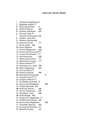 Zaliczenie Metody Badań 1. Abramek Magdalena 5 2. Bagińska Dagna??? 3. Denysiuk Roman 5 4. Drelich Marcin 4,0 5. Furman Arkadiusz 4,5 6. Głowala Olga 5 7. Gomuła Przemysław 3.0 8. Gurbisz Anita 4.5 9. Hurkacz Michał 4.0 10. Justyna Dziwik ??? 11. Koisz Jakub 4.0 12. Kotys Barbara 4.0 13. Kozieł Małgorzata 4.0 14. Kruszwicki Krzysztof??? 15. Lorenc Przemysław ??? 16. Łęk Katarzyna 5.0 17. Maćkowski Ernest ??? 18. Marcinek Grzegorz ??? 19. Mazur Michał ??? 20. Mazurkiewicz Anna 5.0 21. Mróz Magdalena 4,5 22. Nowak Edyta??? 23. Pytlarz Grażyna 4.0 24. Sławiński Przemysław 25. Surodzki Paweł ??? 26. Szejgiec Milena??? 27. Szymańska Karolina 5 28. Szymczyk Magdalena 29. Ukleja Sebastian 5.0 30. Walczak Justyna 4.0 31. Wawer Katarzyna 4.0 32. Wendeker Anna 5.0 33. Wilk Magda 4.0 34. Wójtowicz Magdalena ??? 35. Wróblewska Helena 3.0 36. Zborowska Magdalena 37. Ziemniak Mateusz 4.5 38. Szymaszek Karolina 4,5 39. Banasik Paulina 4.0 4 5.0 4.0