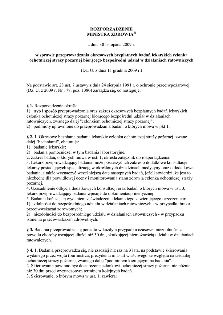 ROZPORZĄDZENIE MINISTRA ZDROWIA1) z dnia 30 listopada 2009 r. w sprawie przeprowadzania okresowych bezpłatnych badań lekarskich członka ochotniczej straŜy poŜarnej biorącego bezpośredni udział w działaniach ratowniczych (Dz. U. z dnia 11 grudnia 2009 r.) Na podstawie art. 28 ust. 7 ustawy z dnia 24 sierpnia 1991 r. o ochronie przeciwpoŜarowej (Dz. U. z 2009 r. Nr 178, poz. 1380) zarządza się, co następuje: § 1. Rozporządzenie określa: 1) tryb i sposób przeprowadzania oraz zakres okresowych bezpłatnych badań lekarskich członka ochotniczej straŜy poŜarnej biorącego bezpośredni udział w działaniach ratowniczych, zwanego dalej "członkiem ochotniczej straŜy poŜarnej"; 2) podmioty uprawnione do przeprowadzania badań, o których mowa w pkt 1. § 2. 1. Okresowe bezpłatne badania lekarskie członka ochotniczej straŜy poŜarnej, zwane dalej "badaniami", obejmują: 1) badanie lekarskie; 2) badania pomocnicze, w tym badania laboratoryjne. 2. Zakres badań, o których mowa w ust. 1, określa załącznik do rozporządzenia. 3. Lekarz przeprowadzający badania moŜe poszerzyć ich zakres o dodatkowe konsultacje lekarzy posiadających specjalizację w określonych dziedzinach medycyny oraz o dodatkowe badania, a takŜe wyznaczyć wcześniejszą datę następnych badań, jeŜeli stwierdzi, Ŝe jest to niezbędne dla prawidłowej oceny i monitorowania stanu zdrowia członka ochotniczej straŜy poŜarnej. 4. Uzasadnienie odbycia dodatkowych konsultacji oraz badań, o których mowa w ust. 3, lekarz przeprowadzający badania wpisuje do dokumentacji medycznej. 5. Badania kończą się wydaniem zaświadczenia lekarskiego zawierającego orzeczenie o: 1) zdolności do bezpośredniego udziału w działaniach ratowniczych - w przypadku braku przeciwwskazań zdrowotnych; 2) niezdolności do bezpośredniego udziału w działaniach ratowniczych - w przypadku istnienia przeciwwskazań zdrowotnych. § 3. Badania przeprowadza się ponadto w kaŜdym przypadku czasowej niezdolności z powodu choroby trwającej dłuŜej niŜ 30 dni, skutkującej niemoŜnością udziału w działaniach ratowniczych. § 4. 1. Badania przeprowadza się, nie rzadziej niŜ raz na 3 lata, na podstawie skierowania wydanego przez wójta (burmistrza, prezydenta miasta) właściwego ze względu na siedzibę ochotniczej straŜy poŜarnej, zwanego dalej "podmiotem kierującym na badania". 2. Skierowanie powinno być dostarczone członkowi ochotniczej straŜy poŜarnej nie później niŜ 30 dni przed wyznaczonym terminem kolejnych badań. 3. Skierowanie, o którym mowa w ust. 1, zawiera: 1) dane osobowe (imię i nazwisko, imię ojca, datę i miejsce urodzenia, PESEL, adres miejsca zamieszkania), a w przypadku osoby nieposiadającej numeru PESEL - nazwę i numer dokumentu potwierdzającego toŜsamość; 2) nazwę i adres ochotniczej straŜy poŜarnej; 3) funkcję pełnioną w ochotniczej straŜy poŜarnej; 4) informacje o specyfice działań ratowniczych, w tym informacje o występowaniu czynników szkodliwych lub niebezpiecznych dla zdrowia. 4. Skierowanie, o którym mowa w ust. 1, wydawane jest w dwóch egzemplarzach, z których jeden pozostaje w karcie badań, a drugi potwierdzony przez lekarza, o którym mowa w § 5, członek ochotniczej straŜy poŜarnej zwraca, wraz z fakturą, do podmiotu kierującego na badania. § 5. Badania przeprowadza lekarz, o którym mowa w przepisach wydanych na podstawie art. 229 § 8 ustawy z dnia 26 czerwca 1974 r. - Kodeks pracy (Dz. U. z 1998 r. Nr 21, poz. 94, z późn. zm.2)). § 6. 1. Członek ochotniczej straŜy poŜarnej lub podmiot kierujący na badania, który nie zgadza się z treścią wydanego orzeczenia, o którym mowa w § 2 ust. 5, w terminie 14 dni od dnia otrzymania orzeczenia, moŜe wystąpić do wojewódzkiego ośrodka medycyny pracy za pośrednictwem lekarza, który je wydał, z wnioskiem o przeprowadzenie ponownych badań. 2. Lekarz, za którego pośrednictwem wnoszony jest wniosek, przekazuje go niezwłocznie, wraz z dokumentacją badań, do wojewódzkiego ośrodka medycyny pracy. 3. Badania, o których mowa w ust. 1, przeprowadza się w wojewódzkim ośrodku medycyny pracy właściwym ze względu na siedzibę podmiotu kierującego na badania. Ponowne badania przeprowadza się w terminie 14 dni od dnia otrzymania wniosku, o którym mowa w ust. 1. Orzeczenie wydane w wyniku ponownych badań jest ostateczne. § 7. Rozporządzenie wchodzi w Ŝycie z dniem ogłoszenia.3) ______ 1) Minister Zdrowia kieruje działem administracji rządowej - zdrowie, na podstawie § 1 ust. 2 rozporządzenia Prezesa Rady Ministrów z dnia 16 listopada 2007 r. w sprawie szczegółowego zakresu działania Ministra Zdrowia (Dz. U. Nr 216, poz. 1607). 2) Zmiany tekstu jednolitego wymienionej ustawy zostały ogłoszone w Dz. U. z 1998 r. Nr 106, poz. 668 i Nr 113, poz. 717, z 1999 r. Nr 99, poz. 1152, z 2000 r. Nr 19, poz. 239, Nr 43, poz. 489, Nr 107, poz. 1127 i Nr 120, poz. 1268, z 2001 r. Nr 11, poz. 84, Nr 28, poz. 301, Nr 52, poz. 538, Nr 99, poz. 1075, Nr 111, poz. 1194, Nr 123, poz. 1354, Nr 128, poz. 1405 i Nr 154, poz. 1805, z 2002 r. Nr 74, poz. 676, Nr 135, poz. 1146, Nr 196, poz. 1660, Nr 199, poz. 1673 i Nr 200, poz. 1679, z 2003 r. Nr 166, poz. 1608 i Nr 213, poz. 2081, z 2004 r. Nr 96, poz. 959, Nr 99, poz. 1001, Nr 120, poz. 1252 i Nr 240, poz. 2407, z 2005 r. Nr 10, poz. 71, Nr 68, poz. 610, Nr 86, poz. 732 i Nr 167, poz. 1398, z 2006 r. Nr 104, poz. 708 i 711, Nr 133, poz. 935, Nr 217, poz. 1587 i Nr 221, poz. 1615, z 2007 r. Nr 64, poz. 426, Nr 89, poz. 589, Nr 176, poz. 1239, Nr 181, poz. 1288 i Nr 225, poz. 1672, z 2008 r. Nr 93, poz. 586, Nr 116, poz. 740, Nr 223, poz. 1460 i Nr 237, poz. 1654 oraz z 2009 r. Nr 6, poz. 33, Nr 56, poz. 458, Nr 58, poz. 485, Nr 98, poz. 817, Nr 99, poz. 825, Nr 115, poz. 958 i Nr 157, poz. 1241. 3) Niniejsze rozporządzenie było poprzedzone rozporządzeniem Ministra Zdrowia i Opieki Społecznej z dnia 19 stycznia 1993 r. w sprawie szczeg