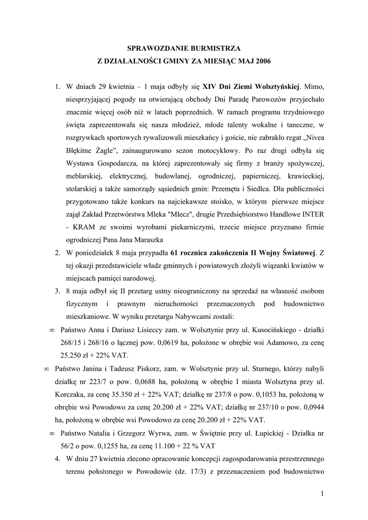SPRAWOZDANIE BURMISTRZA Z DZIAŁALNOŚCI GMINY ZA MIESIĄC MAJ 2006 1. W dniach 29 kwietnia – 1 maja odbyły się XIV Dni Ziemi Wolsztyńskiej. Mimo, niesprzyjającej pogody na otwierającą obchody Dni Paradę Parowozów przyjechało znacznie więcej osób niż w latach poprzednich. W ramach programu trzydniowego święta zaprezentowała się nasza młodzież, młode talenty wokalne i taneczne, w rozgrywkach sportowych rywalizowali mieszkańcy i goście, nie zabrakło regat „Nivea Błękitne Żagle”, zainaugurowano sezon motocyklowy. Po raz drugi odbyła się Wystawa Gospodarcza, na której zaprezentowały się firmy z branży spożywczej, meblarskiej, elektrycznej, budowlanej, ogrodniczej, papierniczej, krawieckiej, stolarskiej a także samorządy sąsiednich gmin: Przemętu i Siedlca. Dla publiczności przygotowano także konkurs na najciekawsze stoisko, w którym pierwsze miejsce zajął Zakład Przetwórstwa Mleka "Mlecz", drugie Przedsiębiorstwo Handlowe INTER - KRAM ze swoimi wyrobami piekarniczymi, trzecie miejsce przyznano firmie ogrodniczej Pana Jana Maraszka 2. W poniedziałek 8 maja przypadła 61 rocznica zakończenia II Wojny Światowej. Z tej okazji przedstawiciele władz gminnych i powiatowych złożyli wiązanki kwiatów w miejscach pamięci narodowej. 3. 8 maja odbył się II przetarg ustny nieograniczony na sprzedaż na własność osobom fizycznym i prawnym nieruchomości przeznaczonych pod budownictwo mieszkaniowe. W wyniku przetargu Nabywcami zostali: • Państwo Anna i Dariusz Lisieccy zam. w Wolsztynie przy ul. Kusocińskiego - działki 268/15 i 268/16 o łącznej pow. 0,0619 ha, położone w obrębie wsi Adamowo, za cenę 25.250 zł + 22% VAT. • Państwo Janina i Tadeusz Piskorz, zam. w Wolsztynie przy ul. Sturnego, którzy nabyli działkę nr 223/7 o pow. 0,0688 ha, położoną w obrębie I miasta Wolsztyna przy ul. Korczaka, za cenę 35.350 zł + 22% VAT; działkę nr 237/8 o pow. 0,1053 ha, położoną w obrębie wsi Powodowo za cenę 20.200 zł + 22% VAT; działkę nr 237/10 o pow. 0,0944 ha, położoną w obrębie wsi Powodowo za cenę 20.200 zł + 22% VAT. • Państwo Natalia i Grzegorz Wyrwa, zam. w Świętnie przy ul. Łupickiej - Działka nr 56/2 o pow. 0,1255 ha, za cenę 11.100 + 22 % VAT 4. W dniu 27 kwietnia zlecono opracowanie koncepcji zagospodarowania przestrzennego terenu położonego w Powodowie (dz. 17/3) z przeznaczeniem pod budownictwo 1 mieszkaniowe. Termin wykonania wyznaczono na dzień 15.06 br. Koncepcja będzie podstawą podziału terenu i sprzedaży działek 5. W dniu 8 maja minął termin składania ofert w postępowaniu przetargowym o wartości szacunkowej poniżej 60000 euro na opracowanie dokumentacji projektowej ulicy Wodnej wraz z parkingami. Do czasu składania ofert wpłynęła 1 oferta. Po przeprowadzonej ocenie złożonej oferty postępowanie zostało unieważnione ze względu na przekroczenie kwoty, którą zamawiający zamierzał przeznaczyć na sfinansowanie zamówienia t.j. kwoty 40.000zł. W związku z koniecznością wykonania jeszcze w tym roku nowych miejsc parkingowych toczone są obecnie rozmowy z projektantem w sprawie zlecenia opracowania dokumentacji części parkingowej. 6. W dniu 9 maja minął termin składania ofert w postępowaniu przetargowym o wartości szacunkowej poniżej 60000 euro na modernizację rowu miejskiego w Wolsztynie (na odcinku od Jez. Wolsztyńskiego do ul. R. Kocha). Do czasu składania ofert wpłynęła 1 oferta złożona przez Usługowy Zakład Eksploatacji i Konserwacji Urządzeń Technicznych Melioracji inż. Jan Sita z Jażyńca. Wartość złożonej oferty 149 934,21zł (brutto). Termin wykonania umowy 24 lipca br. 7. W dniu 10 maja odbyło się spotkanie z mieszkańcami Wolsztyna poświęcone możliwościom ubiegania się o środki z funduszy strukturalnych na działania z zakresu rewitalizacji, m.in. na renowację budynków i dóbr kultury o wartości architektonicznej i znaczeniu historycznym, znajdujących się na rewitalizowanym terenie Wolsztyna. Na spotkaniu został przedstawiony mieszkańcom Plan Rewitalizacji Obszarów Miejskich dla Miasta Wolsztyna. Zaproponowano także zawiązanie stowarzyszenia, które w przyszłości mogłoby się stać beneficjentem programów pomocowych przeznaczonych na rewitalizację obszarów miejskich. 8. W dniu 11 maja minął termin składania ofert w postępowaniu przetargowym o wartości szacunkowej powyżej 60000 euro na modernizację chodnika – ul. Powstańców Wlkp. w Obrze. Zakres zadania obejmuje m.in.: - wykonanie ławy z betonu B-15 pod ściek i krawężnik, - ustawienie krawężników betonowych, - wykonanie podbudowy z chudego betonu, - ułożenie nawierzchni z kostki betonowej. Do czasu składania ofert wpłynęły 4 oferty. Wartość wybranej oferty, tj. oferty złożonej przez Zakład Handlowo – Usługowo – Budowlany S.C. Leszek Gról, 2 Zbigniew Brychcy, wyniosła 75 549,11zł (brutto). Termin realizacji umowy - 45 dni od daty podpisania umowy, tj. do dnia 01.06 br. 9. W dniu 11 maja minął termin składania ofert w postępowaniu przetargowym o wartości szacunkowej poniżej 60000 euro na budowę przyłącza kanalizacji sanitarnej do zaplecza socjalnego na plaży przy J. Świętym w Obrze. Zakres zadania obejmuje wykonanie przepompowni ścieków wraz z rurociągiem tłocznym dł. 102 metry do istniejącej sieci w ul. Cmentarnej. Do czasu składania ofert wpłynęła 1 oferta złożona przez Zakład Remontowo – Budowlany Józef Mączkowski. Wartość złożonej oferty 59 499,96zł (brutto). Termin wykonania umowy 19 czerwca br. 10. W dniu 11 maja odbył się odbiór techniczny zadania pn. Modernizacja oświetlenia drogowego na terenie miasta i gminy Wolsztyn. Dostawcą opraw była firma AKKOP Koperek s.j. Kraków, natomiast wykonawcą ENEA S.A. O/Zielona Góra, Rejon Energetyczny Wolsztyn. Zakres zadania: • oprawy oświetleniowe sodowe SGS 101/70 ze źródłem światła o mocy 70W – 470kpl • oprawy oświetleni