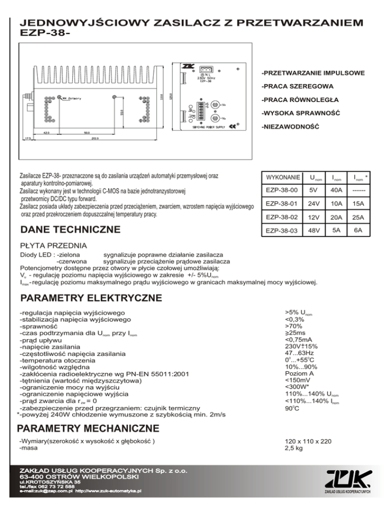 JEDNOWYJŒCIOWY ZASILACZ Z PRZETWARZANIEM EZP-38- -PRZETWARZANIE IMPULSOWE -PRACA SZEREGOWA -PRACA RÓWNOLEG£A -WYSOKA SPRAWNOŒÆ -NIEZAWODNOŒÆ Zasilacze EZP-38- przeznaczone s¹ do zasilania urz¹dzeñ automatyki przemys³owej oraz aparatury kontrolno-pomiarowej. Zasilacz wykonany jest w technologii C-MOS na bazie jednotranzystorowej przetwornicy DC/DC typu forward. Zasilacz posiada uk³ady zabezpieczenia przed przeci¹¿eniem, zwarciem, wzrostem napiêcia wyjœciowego oraz przed przekroczeniem dopuszczalnej temperatury pracy. DANE TECHNICZNE WYKONANIE U nom I nom I nom * EZP-38-00 5V 40A ------ EZP-38-01 24V 10A 15A EZP-38-02 12V 20A 25A EZP-38-03 48V 5A 6A P£YTA PRZEDNIA Diody LED : -zielona sygnalizuje poprawne dzia³anie zasilacza -czerwona sygnalizuje przeci¹¿enie pr¹dowe zasilacza Potencjometry dostêpne przez otwory w p³ycie czo³owej umo¿liwiaj¹: Vu - regulacjê poziomu napiêcia wyjœciowego w zakresie +/- 5%Unom Imax - regulacjê poziomu maksymalnego pr¹du wyjœciowego w granicach maksymalnej mocy wyjœciowej. PARAMETRY ELEKTRYCZNE -regulacja napiêcia wyjœciowego -stabilizacja napiêcia wyjœciowego -sprawnoœæ -czas podtrzymania dla Unom przy Inom -pr¹d up³ywu -napiêcie zasilania -czêstotliwoœæ napiêcia zasilania -temperatura otoczenia -wilgotnoœæ wzglêdna -zak³ócenia radioelektryczne wg PN-EN 55011:2001 -têtnienia (wartoœæ miêdzyszczytowa) -ograniczenie mocy na wyjœciu -ograniczenie napiêciowe wyjœcia -pr¹d zwarcia dla r zw = 0 -zabezpieczenie przed przegrzaniem: czujnik termiczny *-powy¿ej 240W ch³odzenie wymuszone z szybkoœci¹ min. 2m/s >5% Unom <0,3% >70% >25ms <0,75mA 230V +-15% 47...63Hz 00...+550C 10%...90% Poziom A <150mV <300W* 110%...140% U nom <110%...140% Inom 900C PARAMETRY MECHANICZNE -Wymiary(szerokoœæ x wysokoœæ x g³êbokoœæ ) -masa 120 x 110 x 220 2,5 kg ZAK£AD US£UG KOOPERACYJNYCH Sp. z o.o. 63-400 OSTRÓW WIELKOPOLSKI ul.KROTOSZYÑSKA 35 tel./fax 062 73 72 588 e-mail:[email protected] http://www.zuk-automatyka.pl ZAK£AD US£UG KOOPERACYJNYCH