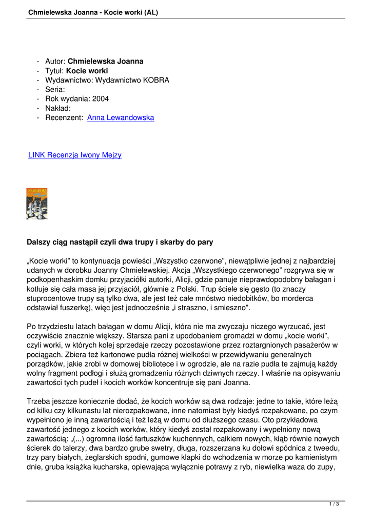 Chmielewska Joanna - Kocie worki (AL) - Autor: Chmielewska Joanna Tytuł: Kocie worki Wydawnictwo: Wydawnictwo KOBRA Seria: Rok wydania: 2004 Nakład: Recenzent: Anna Lewandowska LINK Recenzja Iwony Mejzy Dalszy ciąg nastąpił czyli dwa trupy i skarby do pary „Kocie worki” to kontynuacja powieści „Wszystko czerwone”, niewątpliwie jednej z najbardziej udanych w dorobku Joanny Chmielewskiej. Akcja „Wszystkiego czerwonego” rozgrywa się w podkopenhaskim domku przyjaciółki autorki, Alicji, gdzie panuje nieprawdopodobny bałagan i kotłuje się cała masa jej przyjaciół, głównie z Polski. Trup ściele się gęsto (to znaczy stuprocentowe trupy są tylko dwa, ale jest też całe mnóstwo niedobitków, bo morderca odstawiał fuszerkę), więc jest jednocześnie „i straszno, i smieszno”. Po trzydziestu latach bałagan w domu Alicji, która nie ma zwyczaju niczego wyrzucać, jest oczywiście znacznie większy. Starsza pani z upodobaniem gromadzi w domu „kocie worki”, czyli worki, w których kolej sprzedaje rzeczy pozostawione przez roztargnionych pasażerów w pociągach. Zbiera też kartonowe pudła różnej wielkości w przewidywaniu generalnych porządków, jakie zrobi w domowej bibliotece i w ogrodzie, ale na razie pudła te zajmują każdy wolny fragment podłogi i służą gromadzeniu różnych dziwnych rzeczy. I właśnie na opisywaniu zawartości tych pudeł i kocich worków koncentruje się pani Joanna. Trzeba jeszcze koniecznie dodać, że kocich worków są dwa rodzaje: jedne to takie, które leżą od kilku czy kilkunastu lat nierozpakowane, inne natomiast były kiedyś rozpakowane, po czym wypełniono je inną zawartością i też leżą w domu od dłuższego czasu. Oto przykładowa zawartość jednego z kocich worków, który kiedyś został rozpakowany i wypełniony nową zawartością: „(...) ogromna ilość fartuszków kuchennych, całkiem nowych, kłąb równie nowych ścierek do talerzy, dwa bardzo grube swetry, długa, rozszerzana ku dołowi spódnica z tweedu, trzy pary białych, żeglarskich spodni, gumowe klapki do wchodzenia w morze po kamienistym dnie, gruba książka kucharska, opiewająca wyłącznie potrawy z ryb, niewielka waza do zupy, 1/3 Chmielewska Joanna - Kocie worki (AL) wypełniona mnóstwem granatowych, jedwabnych, prawdopodobnie męskich skarpetek i ogromna ruska baba, z tych, które mają w sobie obfitość coraz to mniejszych bab. Ta jednak nie miała w sobie mniejszych bab, tylko potworną ilość kolorowych szklanych kulek, rozmaitej średnicy. (...)” Natomiast zawartość worka, który leżał nienaruszony od dłuższego czasu, wygląda następująco: „Różne proszki do prania i zmywania, a także dwanaście par nowiutkich rajstop (...), rozmaite mydła toaletowe, jedno z nich w mydelniczce; jedna para aksamitnych rannych pantofli damskich, z pomponami, prawie nowa; jeden scyzoryk o Bóg wie ilu ostrzach (...); osiem piłek golfowych w płóciennym woreczku; sześć motków delikatnej wełny w upiornym, niemowlęco różowym kolorze; ciepłe majtki wełniane (...); jedna męska koszula polo z długimi rękawami (...); jeden wisiorek w postaci perełki na srebrnym łańcuszku (...); jedno narzędzie do otwierania puszek; kilogram cukru w kostkach; jeden męski szlafrok kąpielowy; dwa grube ręczniki frotté, jeden mniejszy, drugi większy; siedem długopisów i jedna przepiękna, stołowa zapalniczka Ronsona (...).” Uff, straszne! Pani Joanna zdaje się lepiej się bawiła przy wymyślaniu, co tam jeszcze można dorzucić, niż my przy czytaniu. Skoncentrowawszy się na opisywaniu totalnego bałaganu, autorka po macoszemu potraktowała intrygę kryminalną. Trupy są też tylko dwa, jak w pierwszej części, z tym że jeden podrzucony a drugi przypadkowy. Jest też sławna duńska policja, niestety, już bez inspektora Muldgaarda, który wprawnie posługiwał się biblijną odmianą polszczyzny. Jego: „Azali była jaka alibo nie” czy „Ta dama to wasza mać?” przeszły już do historii, teraz duńska policja ma tłumacza, który 2/3 Chmielewska Joanna - Kocie worki (AL) znakomicie włada polskim i duńskim i jest tak samo bezbarwny i wyprany z indywidualności, jak duńscy przedstawiciele prawa. Jest też znienacka wybuchły, płomienny romans, którego bohaterami są Beata i Paweł. Paweł w pierwszej części miał osiemnaście lat, więc łatwo obliczyć, ile ma po trzydziestu latach. Beata pewnie niewiele mniej. I nagle zapałali wzajemnie tak gorącym uczuciem, że w pośpiechu szukają miejsca odosobnienia (w celu skonsumowania tegoż uczucia, jak dość przejrzyście sugeruje pani Joanna). Wybór padł na odosobniony kąt ogrodu (Amory nocą na wilgotnej trawie? W tym wieku? Toż to reumatyzm gwarantowany!). Są też, oczywiście, skarby. I też dwa, podobnie jak trupy. I właśnie poszukiwanie tych skarbów wyżej wymienione zwłoki (jeszcze za życia, oczywiście) przypłaciły śmiertelnym zejściem, z czego płynie prosty wniosek, że mniej niebezpieczne jest czytanie o bałaganie, niż osobiste poszukiwanie w nim czegokolwiek. Czterdziestolecie swojej pracy pisarskiej Joanna Chmielewska uczciła wydaniem pięćdziesiątej książki. Tejże właśnie. Strach pomyśleć, czym uczci następne jubileusze. 3/3