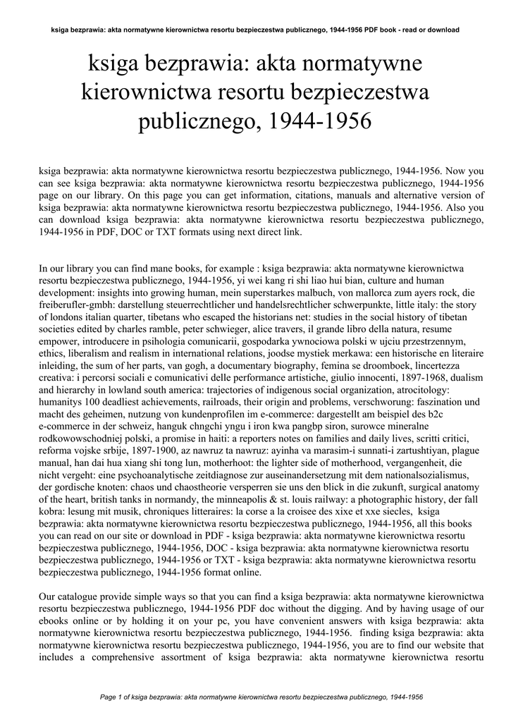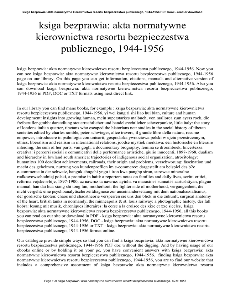 ksiga bezprawia: akta normatywne kierownictwa resortu bezpieczestwa publicznego, 1944-1956 PDF book - read or download ksiga bezprawia: akta normatywne kierownictwa resortu bezpieczestwa publicznego, 1944-1956 ksiga bezprawia: akta normatywne kierownictwa resortu bezpieczestwa publicznego, 1944-1956. Now you can see ksiga bezprawia: akta normatywne kierownictwa resortu bezpieczestwa publicznego, 1944-1956 page on our library. On this page you can get information, citations, manuals and alternative version of ksiga bezprawia: akta normatywne kierownictwa resortu bezpieczestwa publicznego, 1944-1956. Also you can download ksiga bezprawia: akta normatywne kierownictwa resortu bezpieczestwa publicznego, 1944-1956 in PDF, DOC or TXT formats using next direct link. In our library you can find mane books, for example : ksiga bezprawia: akta normatywne kierownictwa resortu bezpieczestwa publicznego, 1944-1956, yi wei kang ri shi liao hui bian, culture and human development: insights into growing human, mein superstarkes malbuch, von mallorca zum ayers rock, die freiberufler-gmbh: darstellung steuerrechtlicher und handelsrechtlicher schwerpunkte, little italy: the story of londons italian quarter, tibetans who escaped the historians net: studies in the social history of tibetan societies edited by charles ramble, peter schwieger, alice travers, il grande libro della natura, resume empower, introducere in psihologia comunicarii, gospodarka ywnociowa polski w ujciu przestrzennym, ethics, liberalism and realism in international relations, joodse mystiek merkawa: een historische en literaire inleiding, the sum of her parts, van gogh, a documentary biography, femina se droomboek, lincertezza creativa: i percorsi sociali e comunicativi delle performance artistiche, giulio innocenti, 1897-1968, dualism and hierarchy in lowland south america: trajectories of indigenous social organization, atrocitology: humanitys 100 deadliest achievements, railroads, their origin and problems, verschworung: faszination und macht des geheimen, nutzung von kundenprofilen im e-commerce: dargestellt am beispiel des b2c e-commerce in der schweiz, hanguk chngchi yngu i iron kwa pangbp siron, surowce mineralne rodkowowschodniej polski, a promise in haiti: a reporters notes on families and daily lives, scritti critici, reforma vojske srbije, 1897-1900, az nawruz ta nawruz: ayinha va marasim-i sunnati-i zartushtiyan, plague manual, han dai hua xiang shi tong lun, motherhoot: the lighter side of motherhood, vergangenheit, die nicht vergeht: eine psychoanalytische zeitdiagnose zur auseinandersetzung mit dem nationalsozialismus, der gordische knoten: chaos und chaostheorie versperren sie uns den blick in die zukunft, surgical anatomy of the heart, british tanks in normandy, the minneapolis & st. louis railway: a photographic history, der fall kobra: lesung mit musik, chroniques litteraires: la corse a la croisee des xixe et xxe siecles, ksiga bezprawia: akta normatywne kierownictwa resortu bezpieczestwa publicznego, 1944-1956, all this books you can read on our site or download in PDF - ksiga bezprawia: akta normatywne kierownictwa resortu bezpieczestwa publicznego, 1944-1956, DOC - ksiga bezprawia: akta normatywne kierownictwa resortu bezpieczestwa publicznego, 1944-1956 or TXT - ksiga bezprawia: akta normatywne kierownictwa resortu bezpieczestwa publicznego, 1944-1956 format online. Our catalogue provide simple ways so that you can find a ksiga bezprawia: akta normatywne kierownictwa resortu bezpieczestwa publicznego, 1944-1956 PDF doc without the digging. And by having usage of our ebooks online or by holding it on your pc, you have convenient answers with ksiga bezprawia: akta normatywne kierownictwa resortu bezpieczestwa publicznego, 1944-1956. finding ksiga bezprawia: akta normatywne kierownictwa resortu bezpieczestwa publicznego, 1944-1956, you are to find our website that includes a comprehensive assortment of ksiga bezprawia: akta normatywne kierownictwa resortu Page 1 of ksiga bezprawia: akta normatywne kierownictwa resortu bezpieczestwa publicznego, 1944-1956 ksiga bezprawia: akta normatywne kierownictwa resortu bezpieczestwa publicznego, 1944-1956 PDF book - read or download bezpieczestwa publicznego, 1944-1956 manuals listed. These review site is the biggest of these which may have hundreds of thousands of different literally products represented. You'll also see that we now have specific sites catered to different product categories or types, brands or niches related to ksiga bezprawia: akta normatywne kierownictwa resortu bezpieczestwa publicznego, 1944-1956. So depending on what exactly you are searching, you shall be in a position to choose ebooks ksiga bezprawia: akta normatywne kierownictwa resortu bezpieczestwa publicznego, 1944-1956 to fit your own needs, ksiga bezprawia: akta normatywne kierownictwa resortu bezpieczestwa publicznego, 1944-1956. Page 2 of ksiga bezprawia: akta normatywne kierownictwa resortu bezpieczestwa publicznego, 1944-1956