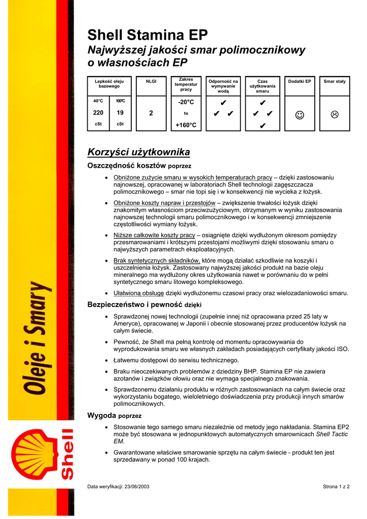 Shell Stamina EP Najwyższej jakości smar polimocznikowy o własnościach EP Lepkość oleju bazowego 40°C 100°C 220 19 cSt cSt NLGI 2 Zakres temperatur pracy Odporność na wymywanie wodą Czas użytkowania smaru -20°C ✔ ✔ ✔ ✔ ✔ ✔ ✔ to +160°C Dodatki EP Smar stały ☺ Korzyści użytkownika Oszczędność kosztów poprzez • Obniżone zużycie smaru w wysokich temperaturach pracy – dzięki zastosowaniu najnowszej, opracowanej w laboratoriach Shell technologii zagęszczacza polimocznikowego – smar nie topi się i w konsekwencji nie wycieka z łożysk. • Obniżone koszty napraw i przestojów – zwiększenie trwałości łożysk dzięki znakomitym własnościom przeciwzużyciowym, otrzymanym w wyniku zastosowania najnowszej technologii smaru polimocznikowego i w konsekwencji zmniejszenie częstotliwości wymiany łożysk. • Niższe całkowite koszty pracy – osiągnięte dzięki wydłużonym okresom pomiędzy przesmarowaniami i krótszymi przestojami możliwymi dzięki stosowaniu smaru o najwyższych parametrach eksploatacyjnych. • Brak syntetycznych składników, które mogą działać szkodliwie na koszyki i uszczelnienia łożysk. Zastosowany najwyższej jakości produkt na bazie oleju mineralnego ma wydłużony okres użytkowania nawet w porównaniu do w pełni syntetycznego smaru litowego kompleksowego. • Ułatwioną obsługę dzięki wydłużonemu czasowi pracy oraz wielozadaniowości smaru. Bezpieczeństwo i pewność dzięki • Sprawdzonej nowej technologii (zupełnie innej niż opracowana przed 25 laty w Ameryce), opracowanej w Japonii i obecnie stosowanej przez producentów łożysk na całym świecie. • Pewność, że Shell ma pełną kontrolę od momentu opracowywania do wyprodukowania smaru we własnych zakładach posiadających certyfikaty jakości ISO. • Łatwemu dostępowi do serwisu technicznego. • Braku nieoczekiwanych problemów z dziedziny BHP. Stamina EP nie zawiera azotanów i związków ołowiu oraz nie wymaga specjalnego znakowania. • Sprawdzonemu działaniu produktu w różnych zastosowaniach na całym świecie oraz wykorzystaniu bogatego, wieloletniego doświadczenia przy produkcji innych smarów polimocznikowych. Wygoda poprzez • Stosowanie tego samego smaru niezależnie od metody jego nakładania. Stamina EP2 może być stosowana w jednopunktowych automatycznych smarownicach Shell Tactic EM. • Gwarantowane właściwe smarowanie sprzętu na całym świecie - produkt ten jest sprzedawany w ponad 100 krajach. Data weryfikacji: 23/06/2003 Strona 1 z 2 Podstawowe zastosowania Przemysł stalowy, papierniczy, chemiczny, produkcja aluminium i wiele innych. Zalecany jako smar o własnościach EP do stosowania w wysoko obciążonych łożyskach kulowych, wałeczkowych i ślizgowych, w wysokich temperaturach pracy gdzie wymagany jest smar o wydłużonym okresie użytkowania. Sprawdzony w następujących zastosowaniach: Walcownie taśm na gorąco Łożyska w fabrykach papieru (strona sucha) Silniki elektryczne (duże) Zakres temperatur pracy Shell Stamina EP jest zalecany do stosowania w zakresie temperatur od -10°C do 160°C (maksymalnie do 180°C przy skróconych okresach przesmarowywania). Zdrowie i bezpieczeństwo Shell Stamina EP nie stwarza zagrożenia dla zdrowia, jeżeli używa się go w odpowiedni sposób oraz przy zachowaniu zasad higieny. Informacje na temat zdrowia i bezpieczeństwa dostępne są w Karcie Charakterystyki Produktu dostępnej w firmie Shell. Doradztwo techniczne W przypadku zastosowań innych niż opisane, należy się skontaktować z przedstawicielem Shell. Typowe własności fizyczne Shell Stamina Klasa NLGI Kolor Rodzaj zagęszczacza Olej bazowy EP 2 Jasnobrązowy Polimocznik Mineralny Lepkość kinematyczna @ 40°C cSt 100°C cSt (IP 71/ASTM-D445) 220 19 Penetracja po ugniataniu @ 25°C 0.1 mm (IP 50/ASTM-D217) 280 Temperatura kroplenia °C (IP 132) 260 Pompowalność Duże odległości Słaba Charakterystyka ta jest typowa dla obecnej produkcji. Strona 2 z 2