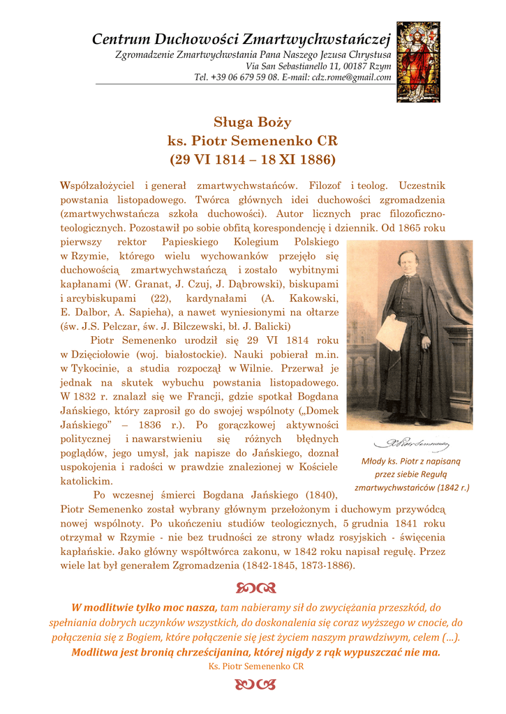 Centrum Duchowości Zmartwychwstańczej Zgromadzenie Zmartwychwstania Pana Naszego Jezusa Chrystusa Via San Sebastianello 11, 00187 Rzym Tel. +39 06 679 59 08. E-mail: [email protected] Sługa Boży ks. Piotr Semenenko CR (29 VI 1814 – 18 XI 1886) Współzałożyciel i generał zmartwychwstańców. Filozof i teolog. Uczestnik powstania listopadowego. Twórca głównych idei duchowości zgromadzenia (zmartwychwstańcza szkoła duchowości). Autor licznych prac filozoficznoteologicznych. Pozostawił po sobie obfitą korespondencję i dziennik. Od 1865 roku pierwszy rektor Papieskiego Kolegium Polskiego w Rzymie, którego wielu wychowanków przejęło się duchowością zmartwychwstańczą i zostało wybitnymi kapłanami (W. Granat, J. Czuj, J. Dąbrowski), biskupami i arcybiskupami (22), kardynałami (A. Kakowski, E. Dalbor, A. Sapieha), a nawet wyniesionymi na ołtarze (św. J.S. Pelczar, św. J. Bilczewski, bł. J. Balicki) Piotr Semenenko urodził się 29 VI 1814 roku w Dzięciołowie (woj. białostockie). Nauki pobierał m.in. w Tykocinie, a studia rozpoczął w Wilnie. Przerwał je jednak na skutek wybuchu powstania listopadowego. W 1832 r. znalazł się we Francji, gdzie spotkał Bogdana Jańskiego, który zaprosił go do swojej wspólnoty („Domek Jańskiego” – 1836 r.). Po gorączkowej aktywności politycznej i nawarstwieniu się różnych błędnych poglądów, jego umysł, jak napisze do Jańskiego, doznał Młody ks. Piotr z napisaną uspokojenia i radości w prawdzie znalezionej w Kościele przez siebie Regułą katolickim. zmartwychwstaoców (1842 r.) Po wczesnej śmierci Bogdana Jańskiego (1840), Piotr Semenenko został wybrany głównym przełożonym i duchowym przywódcą nowej wspólnoty. Po ukończeniu studiów teologicznych, 5 grudnia 1841 roku otrzymał w Rzymie - nie bez trudności ze strony władz rosyjskich - święcenia kapłańskie. Jako główny współtwórca zakonu, w 1842 roku napisał regułę. Przez wiele lat był generałem Zgromadzenia (1842-1845, 1873-1886). W modlitwie tylko moc nasza, tam nabieramy sił do zwyciężania przeszkód, do spełniania dobrych uczynków wszystkich, do doskonalenia się coraz wyższego w cnocie, do połączenia się z Bogiem, które połączenie się jest życiem naszym prawdziwym, celem (…). Modlitwa jest bronią chrześcijanina, której nigdy z rąk wypuszczać nie ma. Ks. Piotr Semenenko CR Czynnie współpracował ze Stolicą Apostolską. Uważany za jednego z najbardziej uczonych ludzi Kościoła w drugiej połowie XIX wieku, posiadał wielki autorytet naukowy u papieży. Pełnił funkcję konsulatora Kongregacji Indeksu i Świętego Oficjum (Doktryny Wiary). Został członkiem prestiżowych Papieskich Akademii: Religii Katolickiej oraz degli Arcadii. O jego kulturze naukowej mówi się powszechnie, iż charakteryzuje się wybitnymi i wielostronnymi uzdolnieniami, podkreśla się umysłowość o typie spekulatywnym, wyjątkowy talent syntezy, wnikliwość, samodzielność i oryginalność. Był niepospolitym erudytą, swobodnie podejmował dyskusje dotyczące najbardziej subtelnych problemów. Jako ceniony duszpasterz i poszukiwany spowiednik, był kierownikiem duchowym wielu osób (m.in. bł. C. Borzęckiej, J. Borzęckiej, bł. F. Siedliskiej, bł. M. Darowskiej, sł. B. K. Białeckiej, bł. A. Truszkowskiej). Rzeczy Boże dzieją się Współtworzył lub pomagał w zakładaniu wielu żeńskich powoli, w cichości, zgromadzeń zakonnych (m.in.: niepokalanek, zmartwychz wielką cierpliwością wstanek, służebniczek, felicjanek, dominikanek, nazarei trudnościami. tanek, reparatek, Pocieszycielek Najśw. Serca Jezusowego). Ks. Piotr Semenenko CR Doradzał bł. E. Bojanowskiemu oraz bł. H. Koźmińskiemu. Głosił kazania w różnych kościołach Polski, Francji, Belgii, Bułgarii i Rzymu. Wiele uwagi poświęcał wychowaniu młodzieży. Pragnął ożywić w nich umiłowanie nauki i świętości. Jego zdaniem tylko wiara mogła dać impuls do poświęceń, porządek, zgodę i przestrzeganie praw moralnych. Dał podwaliny pod zmartwychwstańczy system wychowawczy. Ks. Piotr Semenenko CR zmarł w opinii świętości w Paryżu 18 XI 1886 roku. Jego doczesne szczątki spoczywają w kościele przy domu generalnym zmartwychwstańców w Rzymie (via San Sebastianello 11). Proces beatyfikacyjny rozpoczęto po II wojnie światowej. Nowsze wydania dzieł ks. P. Semenenki: O pokusach, Kraków 2001 (www.alleluja.katolik.pl); Kazania na adwent i Boże Narodzenie, Warszawa 2000; Kazania o męce i śmierci Pana Jezusa, Warszawa 2001; Logika, Kraków 2004; O Papieżu, Kraków 2006; O Najświętszym Sakramencie, Kraków 2005; Grawer z koperty O modlitwie, Kraków 2006 (www.alleluja.katolik.pl); zegarka Wyimki ascetyczne, Kraków 2007 (www.alleluja.katolik.pl); ofiarowanego o. Piotrowi Mistyka, Poznań 2009. przez znanego Więcej o ks. Semenence znajdziesz na www.biz.xcr.pl. zegarmistrza A. Patka Zebrał i opracował ks. Wojciech Mleczko CR (©2009).