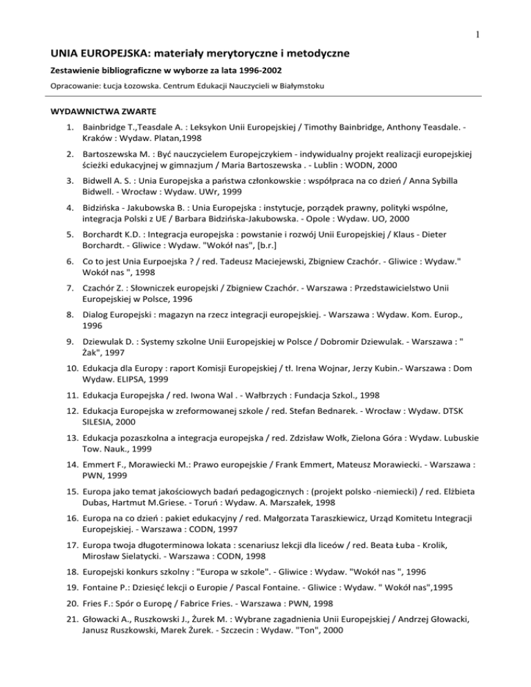 1 UNIA EUROPEJSKA: materiały merytoryczne i metodyczne Zestawienie bibliograficzne w wyborze za lata 1996-2002 Opracowanie: Łucja Łozowska. Centrum Edukacji Nauczycieli w Białymstoku WYDAWNICTWA ZWARTE 1. Bainbridge T.,Teasdale A. : Leksykon Unii Europejskiej / Timothy Bainbridge, Anthony Teasdale. Kraków : Wydaw. Platan,1998 2. Bartoszewska M. : Być nauczycielem Europejczykiem - indywidualny projekt realizacji europejskiej ścieżki edukacyjnej w gimnazjum / Maria Bartoszewska . - Lublin : WODN, 2000 3. Bidwell A. S. : Unia Europejska a państwa członkowskie : współpraca na co dzień / Anna Sybilla Bidwell. - Wrocław : Wydaw. UWr, 1999 4. Bidzińska - Jakubowska B. : Unia Europejska : instytucje, porządek prawny, polityki wspólne, integracja Polski z UE / Barbara Bidzińska-Jakubowska. - Opole : Wydaw. UO, 2000 5. Borchardt K.D. : Integracja europejska : powstanie i rozwój Unii Europejskiej / Klaus - Dieter Borchardt. - Gliwice : Wydaw. "Wokół nas", [b.r.] 6. Co to jest Unia Eurpoejska C / red. Tadeusz Maciejewski, bigniew Czachór. - Gliwice : Wydaw." Wokół nas ", 1998 7. Czachór . : Słowniczek europejski / bigniew Czachór. - Warszawa : Przedstawicielstwo Unii Europejskiej w Polsce, 1996 8. Dialog Europejski : magazyn na rzecz integracji europejskiej. - Warszawa : Wydaw. Kom. Europ., 1996 9. Dziewulak D. : Systemy szkolne Unii Europejskiej w Polsce / Dobromir Dziewulak. - Warszawa : " Żak", 1997 10. Edukacja dla Europy : raport Komisji Europejskiej / tł. Irena Wojnar, Jerzy Kubin.- Warszawa : Dom Wydaw. ELIPSA, 1999 11. Edukacja Europejska / red. Iwona Wal . - Wałbrzych : Fundacja Szkol., 1998 12. Edukacja Europejska w zreformowanej szkole / red. Stefan Bednarek. - Wrocław : Wydaw. DTSK SILESIA, 2000 13. Edukacja pozaszkolna a integracja europejska / red. dzisław Wołk, ielona Góra : Wydaw. Lubuskie Tow. Nauk., 1999 14. Emmert F., Morawiecki M.: Prawo europejskie / Frank Emmert, Mateusz Morawiecki. - Warszawa : PWN, 1999 15. Europa jako temat jakościowych badań pedagogicznych : aprojekt polsko -niemiecki) / red. Elżbieta Dubas, Hartmut M.Griese. - Toruń : Wydaw. A. Marszałek, 1998 16. Europa na co dzień : pakiet edukacyjny / red. Małgorzata Taraszkiewicz, Urząd Komitetu Integracji Europejskiej. - Warszawa : CODN, 1997 17. Europa twoja długoterminowa lokata : scenariusz lekcji dla liceów / red. Beata Łuba - Krolik, Mirosław Sielatycki. - Warszawa : CODN, 1998 18. Europejski konkurs szkolny : "Europa w szkole". - Gliwice : Wydaw. "Wokół nas ", 1996 19. Fontaine P.: Dziesięć lekcji o Europie / Pascal Fontaine. - Gliwice : Wydaw. " Wokół nas",1995 20. Fries F.: Spór o Europę / Fabrice Fries. - Warszawa : PWN, 1998 21. Głowacki A., Ruszkowski J., Żurek M. : Wybrane zagadnienia Unii Europejskiej / Andrzej Głowacki, Janusz Ruszkowski, Marek Żurek. - Szczecin : Wydaw. "Ton", 2000 2 22. Homplewicz J.: Wyzwania pedagogiczne wobec perspektyw integracji europejskiej / Janusz Homplewicz. - Rzeszów : Wydaw. WSP, 1998 23. Integracja europejska : implikacje dla Polski / red. Jacek Czaputowicz. -Kraków : Wydaw. WAM , 1999 24. Integracja Europejska : materiały seminarium dla konsultantów i doradców historii i wiedzy o społeczeństwie. - Warszawa : EXIT, 1996 25. Integracja europejska : podręcznik dla szkół średnich / red. Krystyna Chojnicka . - Kraków : Fundacja "Międzynarodowe Centrum Rozwoju Demokracji, 1997 26. Karpuk M.: Unia Europejska : informator dla młodzieży / Monika Karpuk. - Warszawa : [b.w.], 1999 27. Konopko H.: Edukacja europejska : ścieżka edukacja dla gimnazjum / Hanna Konopko. - Warszawa : GRAF-PUNKT, 2000 28. Leonard D.: Przewodnik po Unii Europejskiej / Dick Leonard. - Warszawa: "Studio Emka", 1998 29. Marciniak E. : Procesy integracyjne w Europie : scenariusze lekcji // W : Uczymy wiedzy o społeczeństwie : poradnik metodyczny : klasa 8 / Ewa Marciniak. - Warszawa : WSiP, 1997. - S.114 117 30. Materiały seminarium : "Polska w Europie". - Warszawa: Stowarzyszenie Nauczycieli "Szranki szkolne", 1997 31. Młodzież pogranicza kulturowego Białorusi, Polski, Ukrainy wobec integracji europejskiej : tożsamość, plany życiowe, wartości. - Białystok : "Trans Humana", 2000. - Bibliogr. 32. Narodowa Strategia Integracji. - Warszawa : Komitet Integracji Europejskiej, 1997 33. Noble A.: Przewodnik po Unii Europejskiej : od Rzymu do Maastricht i Amsterdamu / Aleksander Noble. - Warszawa : Książka i Wiedza, 2000 34. Kowalski J., Sielatycki M., Kozłowska W. : Partnerzy : Polacy i Niemcy w nowej Europie : scenariusze lekcji / Jacek Kowalski, Mirosław Sielatycki, Wiesława Kozłowska. - Warszawa : CODN, 1998 35. Podraza A. : Stosunki polityczne i gospodarcze Wspólnoty Europejskiej z państwami Europy Środkowej i Wschodniej / Andrzej Podraza. - Lublin : Redakcja Wydaw. KUL, 1996 36. Popiuk- Rysińska I. : Unia Europejska : geneza, kształt i konsekwencje integracji / Irena Popiuk Rysińska. - Warszawa : WSiP, 1998 37. Portret naszej Europy : informacje o krajach członkowskich Unii Europejskiej oraz Polsce. - Gliwice : Wydaw. "Wokół nas",1996 38. Rittel S. J. : Podręcznik nauczyciela w Unii Europejskiej : edukacja ekonomiczna i elementy wiedzy o pracy w klasach wczesnoszkolnych : konspekty lekcji dla nauczycieli. - Wrocław : AgencjaWydawniczo-Reklamowa, 1998 39. Rittel S. J. : Podręcznik nauczyciela w Unii Europejskiej : polityka dla dzieci: konspekty lekcji dla nauczyciela klas wczesnoszkolnych. - Wrocław : Agencja Wydawniczo-Reklamowa, 1998 40. Ruszkowski J., Górnicz E., Żurek M.: Leksykon integracji europejskiej / Janusz Ruszkowski, Ewa Górnicz, Marek Żurek .- Warszawa : PWN, 1998 41. Skotnicka - Illasiewicz E. : Powrót czy droga w nieznane C Europejskie dylematy Polaków / Elżbieta Skotnicka - Illasiewicz. - Warszawa : Wydaw. Inst. Kult., 1998 42. Słownik instytucji i terminów Unii Europejskiej / Henri Malosse, Pascal Fontaine. - Warszawa : Kom. Integr. Europ., 1997 43. Społeczności lokalne w perspektywi