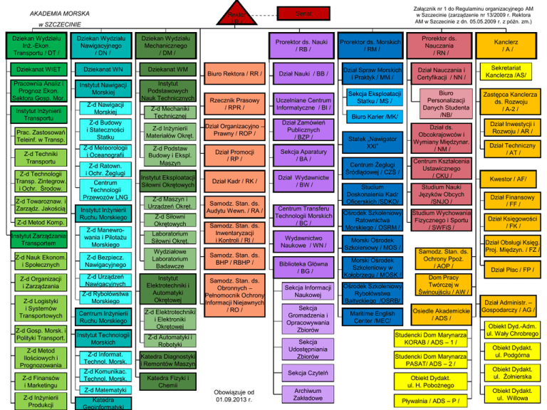 AKADEMIA MORSKA Rektor /R/ w SZCZECINIE Dziekan Wydziału Inż.-Ekon. Transportu / DT / Dziekan Wydziału Nawigacyjnego / DN / Dziekan Wydziału Mechanicznego / DM / Prorektor ds. Nauki / RB / Prorektor ds. Morskich / RM / Biuro Rektora / RR / Dział Nauki / BB / Dział Spraw Morskich i Praktyk / MM / Rzecznik Prasowy / RPR / Uczelniane Centrum Informatyczne / BI / Z-d Inżynierii Materiałów Okręt. Dział Organizacyjno – Prawny / ROP / Dział Zamówień Publicznych / BZP / Z-d Podstaw Budowy i Ekspl. Maszyn Dział Promocji / RP / Sekcja Aparatury / BA / Dział Kadr / RK / Dział Wydawnictw / BW / Dziekanat WIET Dziekanat WN Dziekanat WM Pracownia Analiz i Prognoz Ekon. Sektora Gosp. Mor. Instytut Nawigacji Morskiej Instytut Podstawowych Nauk Technicznych Instytut Inżynierii Transportu Prac. Zastosowań Teleinf. w Transp. Z-d Techniki Transportu Z-d Technologii Transp. Zintegrow. i Ochr. Środow. Z-d Towaroznaw. i Zarządz. Jakością Z-d Metod Komp. Z-d Nawigacji Morskiej Z-d Budowy i Stateczności Statku Z-d Meteorologii i Oceanografii Z-d Ratown. i Ochr. Żeglugi Centrum Technologii Przewozów LNG Instytut Inżynierii Ruchu Morskiego Z-d Mechaniki Technicznej Instytut Eksploatacji Siłowni Okrętowych Z-d Maszyn i Urządzeń Okręt. Z-d Siłowni Okrętowych Z-d Manewrowania i Pilotażu Morskiego Laboratorium Siłowni Okręt. Z-d Nauk Ekonom. i Społecznych Z-d Bezpiecz. Nawigacyjnego Wydziałowe Laboratorium Badawcze Z-d Organizacji i Zarządzania Z-d Urządzeń Nawigacyjnych Instytut Zarządzania Transportem Z-d Logistyki i Systemów Transportowych Z-d Gosp. Morsk. i Polityki Transport. Z-d Metod Ilościowych i Prognozowania Z-d Finansów i Marketingu Z-d Inżynierii Produkcji Z-d Rybołówstwa Morskiego Instytut Elektrotechniki i Automatyki Okrętowej Centrum Inżynierii Ruchu Morskiego Z-d Elektrotechniki i Elektroniki Okrętowej Instytut Technologii Morskich Z-d Automatyki i Robotyki Z-d Informat. Technol. Morsk. Z-d Komunikac. Technol. Morsk. Z-d Matematyki Katedra Geoinformatyki Załącznik nr 1 do Regulaminu organizacyjnego AM w Szczecinie (zarządzenie nr 13/2009 r. Rektora AM w Szczecinie z dn. 05.05.2009 r. z późn. zm.) Senat Samodz. Stan. ds. Audytu Wewn. / RA / Samodz. Stan. ds. Inwentaryzacji i Kontroli / RI / Samodz. Stan. ds. BHP / RBHP / Samodz. Stan. ds. Obronnych – Pełnomocnik Ochrony Informacji Niejawnych / RO / Centrum Transferu Technologii Morskich / BC / Wydawnictwo Naukowe / WN / Biblioteka Główna / BG / Katedra Diagnostyki i Remontów Maszyn Obowiązuje od 01.09.2013 r. Biuro Karier /MK/ Statek „Nawigator XXI” Dział ds. Obcokrajowców i Wymiany Międzynar. / NM / Sekretariat Kanclerza /AS/ Zastępca Kanclerza ds. Rozwoju / A-2 / Dział Inwestycji i Rozwoju / AR / Dział Techniczny / AT / Centrum Kształcenia Ustawicznego / CKU / Studium Doskonalenia Kadr Oficerskich /SDKO/ Studium Nauki Języków Obcych /SNJO / Dział Finansowy / FF / Ośrodek Szkoleniowy Ratownictwa Morskiego / OSRM / Studium Wychowania Fizycznego i Sportu / SWFiS / Dział Księgowości / FK / Morski Ośrodek Szkoleniowy / MOS / Morski Ośrodek Szkoleniowy w Kołobrzegu / MOSK / Sekcja Gromadzenia i Opracowywania Zbiorów Maritime English Center /MEC/ Archiwum Zakładowe Kanclerz /A/ Centrum Żeglugi Śródlądowej / CZŚ / Ośrodek Szkoleniowy Rybołówstwa Bałtyckiego /OSRB/ Sekcja Czytelń Katedra Fizyki i Chemii Dział Nauczania i Certyfikacji / NN / Biuro Personalizacji Danych Studenta /NB/ Sekcja Eksploatacji Statku / MS / Sekcja Informacji Naukowej Sekcja Udostępniania Zbiorów Prorektor ds. Nauczania / RN / Samodz. Stan. ds. Ochrony Ppoż. / AOP / Kwestor / AF/ Dział Obsługi Księg. Proj. Międzyn. / FZ / Dział Płac / FP / Dom Pracy Twórczej w Świnoujściu / AW / Osiedle Akademickie / ADS / Studencki Dom Marynarza KORAB / ADS – 1 / Studencki Dom Marynarza PASAT/ ADS – 2 / Obiekt Dydakt. ul. H. Pobożnego Pływalnia / ADS – P / Dział Administr. – Gospodarczy / AG / Obiekt Dyd.-Adm. ul. Wały Chrobrego Obiekt Dydakt. ul. Podgórna Obiekt Dydakt. ul. Żołnierska Obiekt Dydakt. ul. Willowa AKADEMIA MORSKA Rektor /R/ w SZCZECINIE Dziekan Wydziału Inż.-Ekon. Transportu / DT / Dziekan Wydziału Nawigacyjnego / DN / Dziekan Wydziału Mechanicznego / DM / Prorektor ds. Nauki / RB / Prorektor ds. Morskich / RM / Biuro Rektora / RR / Dział Nauki / BB / Dział Spraw Morskich i Praktyk / MM / Rzecznik Prasowy / RPR / Uczelniane Centrum Informatyczne / BI / Z-d Inżynierii Materiałów Okręt. Dział Organizacyjno – Prawny / ROP / Dział Zamówień Publicznych / BZP / Z-d Podstaw Budowy i Ekspl. Maszyn Dział Promocji / RP / Sekcja Aparatury / BA / Dział Kadr / RK / Dział Wydawnictw / BW / Dziekanat WIET Dziekanat WN Dziekanat WM Pracownia Analiz i Prognoz Ekon. Sektora Gosp. Mor. Instytut Nawigacji Morskiej Instytut Podstawowych Nauk Technicznych Instytut Inżynierii Transportu Prac. Zastosowań Teleinf. w Transp. Z-d Techniki Transportu Z-d Technologii Transp. Zintegrow. i Ochr. Środow. Z-d Towaroznaw. i Zarządz. Jakością Z-d Metod Komp. Z-d Nawigacji Morskiej Z-d Budowy i Stateczności Statku Z-d Meteorologii i Oceanografii Z-d Ratown. i Ochr. Żeglugi Centrum Technologii Przewozów LNG Instytut Inżynierii Ruchu Morskiego Z-d Mechaniki Technicznej Instytut Eksploatacji Siłowni Okrętowych Z-d Maszyn i Urządzeń Okręt. Z-d Siłowni Okrętowych Z-d Manewrowania i Pilotażu Morskiego Laboratorium Siłowni Okręt. Z-d Nauk Ekonom. i Społecznych Z-d Bezpiecz. Nawigacyjnego Wydziałowe Laboratorium Badawcze Z-d Organizacji i Zarządzania Z-d Urządzeń Nawigacyjnych Instytut Zarządzania Transportem Z-d Logistyki i Systemów Transportowych Z-d Gosp. Morsk. i Polityki Transport. Z-d Metod Ilościowych i Prognozowania Z-d Finansów i Marketingu Z-d Inżynierii Produkcji Z-d Rybołówstwa Morskiego Instytut Elektrotechniki i Automatyki Okrętowej Centrum Inżynierii Ruchu Morskiego Z-d Elektrotechniki i Elektroniki Okrętowej Instytut Technologii Morskich