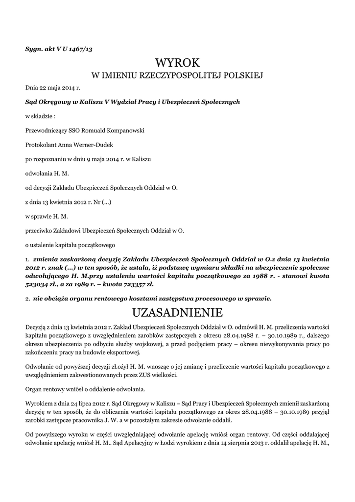 Sygn. akt V U 1467/13 WYROK W IMIENIU RZECZYPOSPOLITEJ POLSKIEJ Dnia 22 maja 2014 r. Sąd Okręgowy w Kaliszu V Wydział Pracy i Ubezpieczeń Społecznych w składzie : Przewodniczący SSO Romuald Kompanowski Protokolant Anna Werner-Dudek po rozpoznaniu w dniu 9 maja 2014 r. w Kaliszu odwołania H. M. od decyzji Zakładu Ubezpieczeń Społecznych Oddział w O. z dnia 13 kwietnia 2012 r. Nr (...) w sprawie H. M. przeciwko Zakładowi Ubezpieczeń Społecznych Oddział w O. o ustalenie kapitału początkowego 1. zmienia zaskarżoną decyzję Zakładu Ubezpieczeń Społecznych Oddział w O.z dnia 13 kwietnia 2012 r. znak (...) w ten sposób, że ustala, iż podstawę wymiaru składki na ubezpieczenie społeczne odwołującego H. M.przy ustaleniu wartości kapitału początkowego za 1988 r. - stanowi kwota 523034 zł., a za 1989 r. – kwota 723357 zł. 2. nie obciąża organu rentowego kosztami zastępstwa procesowego w sprawie. UZASADNIENIE Decyzją z dnia 13 kwietnia 2012 r. Zakład Ubezpieczeń Społecznych Oddział w O. odmówił H. M. przeliczenia wartości kapitału początkowego z uwzględnieniem zarobków zastępczych z okresu 28.04.1988 r. – 30.10.1989 r., dalszego okresu ubezpieczenia po odbyciu służby wojskowej, a przed podjęciem pracy – okresu niewykonywania pracy po zakończeniu pracy na budowie eksportowej. Odwołanie od powyższej decyzji zł.ożył H. M. wnosząc o jej zmianę i przeliczenie wartości kapitału początkowego z uwzględnieniem zakwestionowanych przez ZUS wielkości. Organ rentowy wniósł o oddalenie odwołania. Wyrokiem z dnia 24 lipca 2012 r. Sąd Okręgowy w Kaliszu – Sąd Pracy i Ubezpieczeń Społecznych zmienił zaskarżoną decyzję w ten sposób, że do obliczenia wartości kapitału początkowego za okres 28.04.1988 – 30.10.1989 przyjął zarobki zastępcze pracownika J. W. a w pozostałym zakresie odwołanie oddalił. Od powyższego wyroku w części uwzględniającej odwołanie apelację wniósł organ rentowy. Od części oddalającej odwołanie apelację wniósł H. M.. Sąd Apelacyjny w Łodzi wyrokiem z dnia 14 sierpnia 2013 r. oddalił apelację H. M., a z apelacji organu rentowego uchylił zaskarżoną przez organ część wyroku i w tym zakresie przekazał sprawę Sądowi Okręgowemu w Kaliszu do ponownego rozpoznania. Ponownie rozpoznając sprawę, sąd ustalił co następuje: Odwołujący H. M.urodzony dnia (...), podjął zatrudnienie w Przedsiębiorstwie (...) w K.od dnia 1 lipca 1975 r. początkowo na stanowisku mechanika napraw pojazdów. W 1981 r. powierzono odwołującemu stanowisko brygadzisty warsztatowego. W 1982 r. odwołujący uzyskał uprawnienie w zakresie spawania gazowego i elektrycznego. Od stycznia 1988 r. ustalone zostało dla odwołującego wynagrodzenie zasadnicze obliczone według stawki 10 kategorii IV tabeli w kwocie 137 zł. na godzinę. Od dnia 28 kwietnia 1988 r. odwołujący rozpoczął pracę za granicą w ramach tzw. budownictwa eksportowego mając zawartą umowę o pracę za granicą z innym podmiotem. W macierzystym zakładzie odwołujący miał urlop bezpłatny. W takim charakterze odwołujący pracował do dnia 30 października 1989 r. (dowód: akta osobowe odwołującego). Inny pracownik Przedsiębiorstwa – J. W. przyszedł do pracy w zakładzie w 1983 r. na zasadzie porozumienia zakładów pracy. Powierzone zostało mu stanowiska mechanika w tym samym dziale co w przypadku odwołującego. W styczniu 1988 r. przyznana stawka wynagrodzenia to 9 kategoria IV tabeli w kwocie 133 zł. na godzinę. W lipcu 1988 r. J. W.przyznano stawkę w kwocie 197 zł. na godzinę, od lutego 1989 r. – stawkę 260 zł. na godzinę. Z dniem 16 października 1989 r. powierzono odwołującemu obowiązki brygadzisty warsztatów (dowód: akta osobowe J. W.). Odwołujący za okres 01.01. – 28.04.1988 r. osiągnął w Przedsiębiorstwie wynagrodzenie w łącznej kwocie 261 599 zł. (dowód: zaświadczenie o zatrudnieniu i wynagrodzeniu w aktach ZUS). Wynagrodzenie zasadnicze J. W. w okresie maj – grudzień 1988 r. wyniosło 211 875 zł. W tym czasie wypłacono także pracownikowi premie na łączną kwotę 40 654 zł. i dodatek stażowy na kwotę 8 906 zł. Pobrane w okresie styczeń – październik 1989 r. przez J. W. wynagrodzenie zasadnicze to kwota 566 136 zł., premie – 113 227 zł., dodatek stażowy – 43 994 zł. (dowód: karta rocznego wynagrodzenia J. W. w aktach sprawy). Obowiązujące w Przedsiębiorstwie zasady premiowania regulowały prawo każdego pracownika do premii ustalanej jako określony procent wynagrodzenia zasadniczego po wykonaniu przez załogę zadań planowych. Za okres obejmujący lata 1988 – 89 nie było przypadków pozbawiania pracowników realizujących zadania planowe premii. Każdy pracownik miał także prawo do dodatku stażowego (dowód: zeznania świadka G. S.). Ustalając powyższe okoliczności, sąd dał wiarę zeznaniom świadka G. S. oraz danym zawartym w dokumentach złożonych do akt osobowych odwołującego oraz wskazanego przez odwołującego J. W.. Sąd dał wiarę także kartom rocznego wynagrodzenia J. W., ale tylko w odniesieniu do kwot umieszczonych w konkretnym polu pierwszorazowo. Obok tych kwot w danym polu była jeszcze dopisana jedna kwota. Kwoty te dopisane były co najmniej w następnym roku albowiem przy podsumowaniu zarobku za cały rok, tak dopisane kwoty nie obejmują sumy wynagrodzenia. Gdyby te kwoty dopisywane były przy kolejnych przeszeregowaniach dokonywanych z datą wsteczną to przy obliczeniach rocznych kwoty te byłyby sumowane z tymi, które wpisane były pierwotnie a następnie doliczane do kwot z kolejnych miesięcy. Takie obliczenia odnoszące się co najmniej do okresu pierwszego półrocza danego roku zwiększałyby obliczoną sumę wynagrodzenia za dany rok. Tymczasem podsumowanie roczne wskazuje na składniki tylko te, które napisane były pierwotnie. W tych warunkach ta część kart z naniesionymi dopiskami nie mogła zostać uzn
