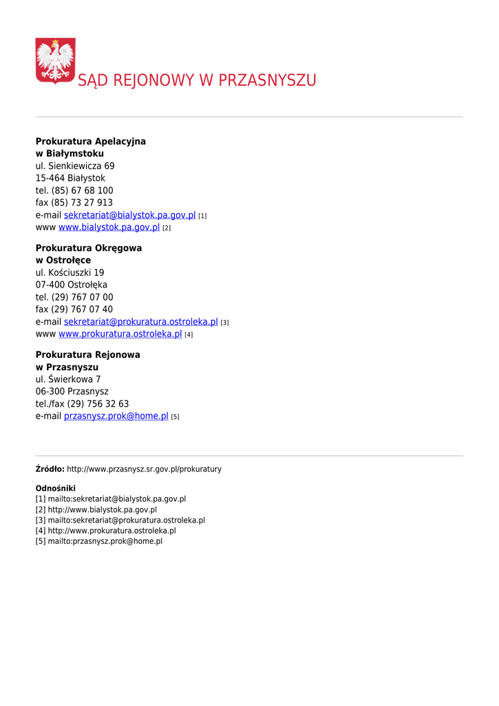SĄD REJONOWY W PRZASNYSZU Prokuratura Apelacyjna w Białymstoku ul. Sienkiewicza 69 15-464 Białystok tel. (85) 67 68 100 fax (85) 73 27 913 e-mail [email protected] [1] www www.bialystok.pa.gov.pl [2] Prokuratura Okręgowa w Ostrołęce ul. Kościuszki 19 07-400 Ostrołęka tel. (29) 767 07 00 fax (29) 767 07 40 e-mail [email protected] [3] www www.prokuratura.ostroleka.pl [4] Prokuratura Rejonowa w Przasnyszu ul. Świerkowa 7 06-300 Przasnysz tel./fax (29) 756 32 63 e-mail [email protected] [5] Źródło: http://www.przasnysz.sr.gov.pl/prokuratury Odnośniki [1] mailto:[email protected] [2] http://www.bialystok.pa.gov.pl [3] mailto:[email protected] [4] http://www.prokuratura.ostroleka.pl [5] mailto:[email protected]