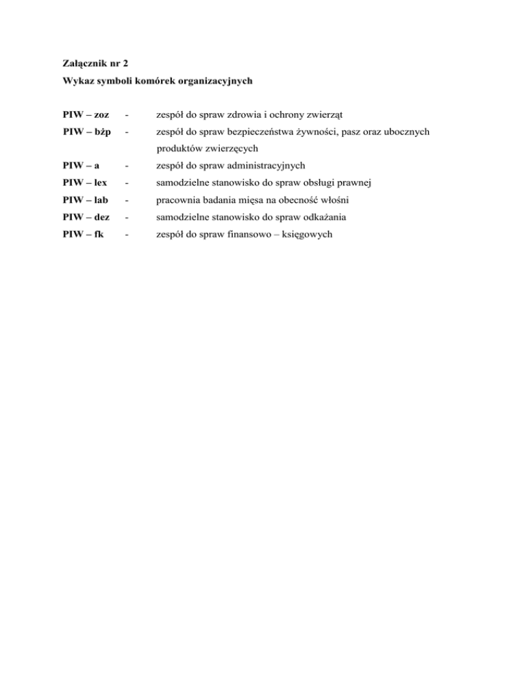 Załącznik nr 2 Wykaz symboli komórek organizacyjnych PIW – zoz - zespół do spraw zdrowia i ochrony zwierząt PIW – bżp - zespół do spraw bezpieczeństwa żywności, pasz oraz ubocznych produktów zwierzęcych PIW – a - zespół do spraw administracyjnych PIW – lex - samodzielne stanowisko do spraw obsługi prawnej PIW – lab - pracownia badania mięsa na obecność włośni PIW – dez - samodzielne stanowisko do spraw odkażania PIW – fk - zespół do spraw finansowo – księgowych