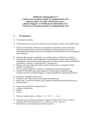 Publiczne Gimnazjum nr 5 w Ostrowcu Świętokrzyskim ul. Sandomierska 26A ogłasza nabór na wolne stanowisko pracy: główny księgowy w Publicznym Gimnazjum nr 5 w Ostrowcu Świętokrzyskim ul. Sandomierska 26A I. Wymagania : 1. Obywatelstwo polskie. 2. Pełna zdolność do czynności prawnych oraz korzystanie w pełni z praw publicznych. 3. Nie być prawomocnie skazanym za przestępstwa: przeciwko mieniu, przeciwko obrotowi gospodarczemu, przeciwko działalności instytucji państwowych oraz samorządu terytorialnego, przeciwko wiarygodności dokumentów lub za przestępstwa karne skarbowe. 4. Posiadać odpowiednie kwalifikacje, tzn. spełniać jeden z poniższych warunków: a. ekonomiczne jednolite studia magisterskie, ekonomiczne wyższe studia zawodowe, uzupełniające ekonomiczne studia magisterskie lub ekonomiczne studia podyplomowe i posiadać co najmniej 3-letnią praktykę w księgowości; b. Średnią, policealną lub pomaturalną szkołę ekonomiczną i co najmniej 6-letnia praktyk w księgowości; c. wpis do rejestru biegłych rewidentów na podstawie odrębnych przepisów; d. świadectwo kwalifikacyjne uprawniające do usługowego prowadzenia ksiąg rachunkowych lub certyfikat księgowy, wydane na podstawie odrębnych przepisów. 5. a. b. c. Znajomość zagadnień dotyczących: rachunkowości i sprawozdawczości jednostki budżetowej, planowania i rozliczania budżetu, płac, podatku dochodowego od osób fizycznych, inwentaryzacji. 6. a. b. c. Znajomość programów komputerowych: z zakresu księgowości, Płatnik. Vulcan 7. Gotowość podjęcia pracy z dniem 01. 01. 2016 r. – ½ etatu. 8. Niekaralność za naruszenie dyscypliny finansów publicznych Ustawy z dnia 26 listopada 1998 (tekst jednolity Dz. U. z 2003r. nr 15 poz. 148 zm.). 9. Niekaralność za przestępstwa popełnione umyślnie. II. Wymagania dodatkowe: 1. a. b. c. d. Znajomość zagadnień z zakresu: Ustawy z dnia 29.stycznia 2004r. - Prawo Zamówień Publicznych, Ustawy z dnia 29 września 1994r. o rachunkowości, Ustawy z dnia 27sierpnia 2009r. o Finansach Publicznych klasyfikacji i sprawozdawczości budżetowej. III. Zakres wykonywanych zadań na stanowisku: 1. Obowiązki wynikające a art. 35 ust. 1 Ustawy o Finansach Publicznych. 2. Planowanie i rozliczanie budżetu oraz wyodrębnionego rachunku dochodów jednostek budżetowych. 3. Sporządzanie harmonogramu dochodów i wydatków budżetowych. 4. Sporządzanie sprawozdań budżetowych, bilansu, analiz ekonomicznych i innych. 5. Współpraca z Urzędem Miasta w Ostrowcu Św. w zakresie wykorzystania środków finansowych i budżetu Publicznego Gimnazjum nr 5. 6. Wykonywanie kontroli wewnętrznej – bieżącej, zgodnie z planem kontroli. 7. Sporządzenie planu inwentaryzacji i udzielenie instruktażu odnośnie jej prowadzenia. 8. Współpraca z bankiem, Urzędem Skarbowym i Zakładem Ubezpieczeń Społecznych. 9. Zapewnienie właściwego archiwizowania dokumentów finansowo – księgowych. 10. Uczestnictwo w pracach komisji przetargowych. 11. Opracowanie projektów i wewnętrznych przepisów dotyczących rachunkowości. 12. Nadzór i kontrola obsługi finansowo – księgowej wydatków osobowych w zakresie: wynagrodzeń, nagród, premii, zasiłków i świadczeń ubezpieczenia społecznego w razie choroby i macierzyństwa oraz wynagrodzenia za czas choroby. 13. Nadzór nad przestrzeganiem Ustawy Prawo Zamówień Publicznych. 14. Opiniowanie projektów i wewnętrznych decyzji powodujących skutki finansowe. 15. Zapewnienie przestrzegania dyscypliny finansów publicznych. 16. Prowadzenie teczek kancelaryjnych w zakresie finansowym. 17. Monitowanie zmian w przepisach wykorzystywanych w codziennej pracy IV. Wymagane dokumenty: 1. 2. 3. 4. 5. 6. 7. List motywacyjny. Życiorys – curriculum vitae. Kserokopie świadectw pracy. Kserokopie dyplomów potwierdzających wykształcenie. Kserokopie zaświadczeń o ukończonych kursach, szkoleniach. Oryginał kwestionariusza osobowego. Kserokopie strony książeczki wojskowej z wpisami dotyczącymi przebiegu służby wojskowe, w przypadku, gdy o pracę ubiega się mężczyzna. 8. Oświadczenie o niekaralności a naruszenie dyscypliny finansów publicznych w trybie ustawy z dnia 17 grudnia 2004 r. o odpowiedzialności za naruszenie dyscypliny finansów publicznych (Dz. U. z 2005 r. nr 14, poz. 114). 9. Oświadczenie o niekaralności za przestępstwa popełnione umyślnie. Wymagane dokumenty: list motywacyjny, szczegółowe CV (z uwzględnieniem dokładnego przebiegu kariery zawodowej), powinny być opatrzone klauzulą: Wyrażam zgodę na przetwarzanie moich danych osobowych zawartych w ofercie pracy dla potrzeb niezbędnych do realizacji procesu rekrutacji zgodnie z ustawą z dnia 29 sierpnia 1997 r. o ochronie danych osobowych (Dz. U. z 2002 r. nr 101, poz. 926 z póź. zm.). Wymagane dokumenty z dopiskiem: Dotyczy naboru na stanowisko głównego księgowego w Publicznym Gimnazjum nr 5, należy składać w siedzibie Publicznego Gimnazjum nr 5 w sekretariacie szkoły w godz. 8.00 – 15.00 lub przesłać pocztą na adres: Publiczne Gimnazjum nr 5 ul. Sandomierska 26A 27 – 400 Ostrowiec Św. Z dopiskiem na kopercie „Konkurs na stanowisko głównego księgowego” Termin składania dokumentów upływa dnia 16 grudnia 2015r.o godzinie 15.00 Dokumenty, które wpłyną do Publicznego Gimnazjum nr 5 po wyżej określonym terminie nie będą rozpatrywane i zostaną zwrócone zainteresowanym. Lista kandydatów, którzy spełnili wymagania formalne oraz informacja o wyniku naboru będzie umieszczona na stronie internetowej Biuletynu Informacji Publicznej www.arl.ostrowiec.pl/bip/pg5/ oraz na tablicy ogłoszeń Publicznego Gimnazjum nr 5 w Ostrowcu Świętokrzyskim. Dyrektor Publicznego Gimnazjum nr 5 Roman Kowalski