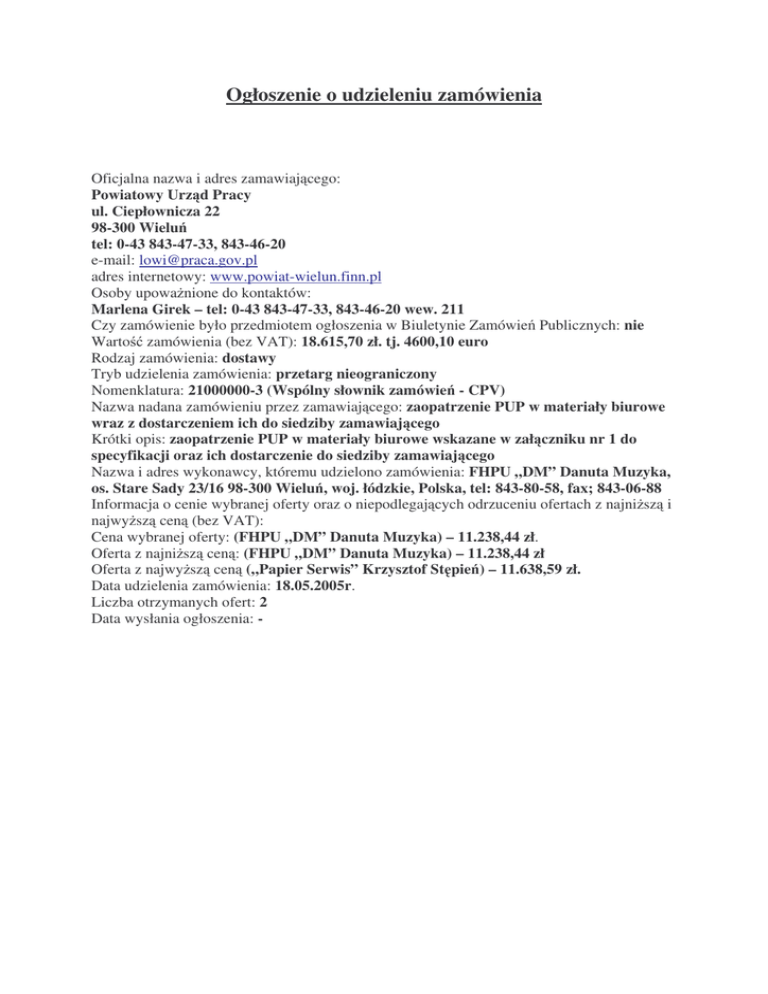 Ogłoszenie o udzieleniu zamówienia Oficjalna nazwa i adres zamawiaj cego: Powiatowy Urz d Pracy ul. Ciepłownicza 22 98-300 Wielu tel: 0-43 843-47-33, 843-46-20 e-mail: [email protected] adres internetowy: www.powiat-wielun.finn.pl Osoby upowa nione do kontaktów: Marlena Girek – tel: 0-43 843-47-33, 843-46-20 wew. 211 Czy zamówienie było przedmiotem ogłoszenia w Biuletynie Zamówie Publicznych: nie Warto zamówienia (bez VAT): 18.615,70 zł. tj. 4600,10 euro Rodzaj zamówienia: dostawy Tryb udzielenia zamówienia: przetarg nieograniczony Nomenklatura: 21000000-3 (Wspólny słownik zamówie - CPV) Nazwa nadana zamówieniu przez zamawiaj cego: zaopatrzenie PUP w materiały biurowe wraz z dostarczeniem ich do siedziby zamawiaj cego Krótki opis: zaopatrzenie PUP w materiały biurowe wskazane w zał czniku nr 1 do specyfikacji oraz ich dostarczenie do siedziby zamawiaj cego Nazwa i adres wykonawcy, któremu udzielono zamówienia: FHPU „DM” Danuta Muzyka, os. Stare Sady 23/16 98-300 Wielu , woj. łódzkie, Polska, tel: 843-80-58, fax; 843-06-88 Informacja o cenie wybranej oferty oraz o niepodlegaj cych odrzuceniu ofertach z najni sz i najwy sz cen (bez VAT): Cena wybranej oferty: (FHPU „DM” Danuta Muzyka) – 11.238,44 zł. Oferta z najni sz cen : (FHPU „DM” Danuta Muzyka) – 11.238,44 zł Oferta z najwy sz cen („Papier Serwis” Krzysztof St pie ) – 11.638,59 zł. Data udzielenia zamówienia: 18.05.2005r. Liczba otrzymanych ofert: 2 Data wysłania ogłoszenia: -