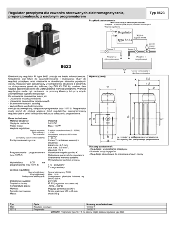 Regulator przepływu dla zaworów sterowanych elektromagnetycznie, proporcjonalnych; z osobnym programatorem Typ 8623 Przykład zastosowania: Mieszanie cieczy w określonym stosunku Przepływ 1 = Współczynnik proporcjonalności x Przepływ 2 8623 Elektroniczny regulator PI typu 8623 pracuje na bazie mikroprocesora. Urządzenie jest łatwe do parametryzowania i skalowania; służy do regulacji przepływu oraz mieszania w określonym stosunku płynących cieczy. Regulator jest zabudowany w kompaktowej obudowie z poliamidu ze zintegrowaną głowiczką kablową (wg DIN 43 650 A); zawiera dwa wejścia częstotliwościowe dla wprowadzenia wartości przepływu. Wartość regulacyjna może być zadawana za pomocą klawiszy lub przy użyciu zewnętrznego sygnału sterującego. Do ustawiania parametrów takich jak: - Ustawianie współczynników K - Ustawianie parametrów regulacyjnych - Skalowanie wartości zadanej - Wyświetlanie wielkości procesu stosuje się zewnętrzny, odłączalny programator typu 1077-5. Programator może służyć do obsługi większej ilośći regulatorów; zaprogramowany regulator jest w pełni funkcjonalny także po odłączeniu programatora. Dane techniczne: Materiał obudowy: Napięcie zasilania: Pobór mocy: Wejścia regulatora: Poliamid 24 V DC Max.: 1,5 W Wejścia sensorów: Opór wejściowy: Typy sygnałów: Zewnętrzny sygnał wartości zadanej: Podłączenie elektryczne: Programowanie typu 1077-5: Wymiary [mm]: programatorem Wyświetlacz LCD programatorze typu 1077-5: 2 wejścia częstotliwościowe (2 – 625 Hz) > 10 kΩ Sinusoidalny, trójkątny (≥300 m Vss), prostokątny 4 – 20 mA Listwa 7-zaciskowa wewnątrz obudowy; kabel o śr. 6-7 mm; 2 drut max.: 0,5 mm ; dławnica PG 9 Ustawianie współczynnika K Ustawianie parametrów regulatora Skalowanie wartości zadanej Wyświetlanie wartości procesu Obszary zastosowań: - Regulacja i wyświetlanie przepływu - Kontrola zużycia płynów - Regulacja stosunkowa do mieszania dwóch cieczy na 4 ½ - pozycyjny 7 - segmentowy Wyjścia regulatora: Sygnał wyjściowy: Prąd wyjściowy: Podłączenie elektryczne: Dodatkowe wyjście: Stopień ochrony: Temperatura pracy: Montaż: Sposób mocowania: Masa: Typ 8623 1077-5 Sygnał elektryczny PWM Max.: 1,0 A Zintegrowana głowiczka kablowa wg DIN 43 650 A 24 V DC IP 65 (regulator na zaworze) -10°C...+60°C Pozycja dowolna (co 90°) Śruba walcowa M3 x 45 mm około 50 g Opis Numery zamówieniowe: Regulator przepływu 134 072 K Programator 134 052 P UWAGA!!! Programator typu 1077-5 nie stanowi części zestawu regulatora typu 8623