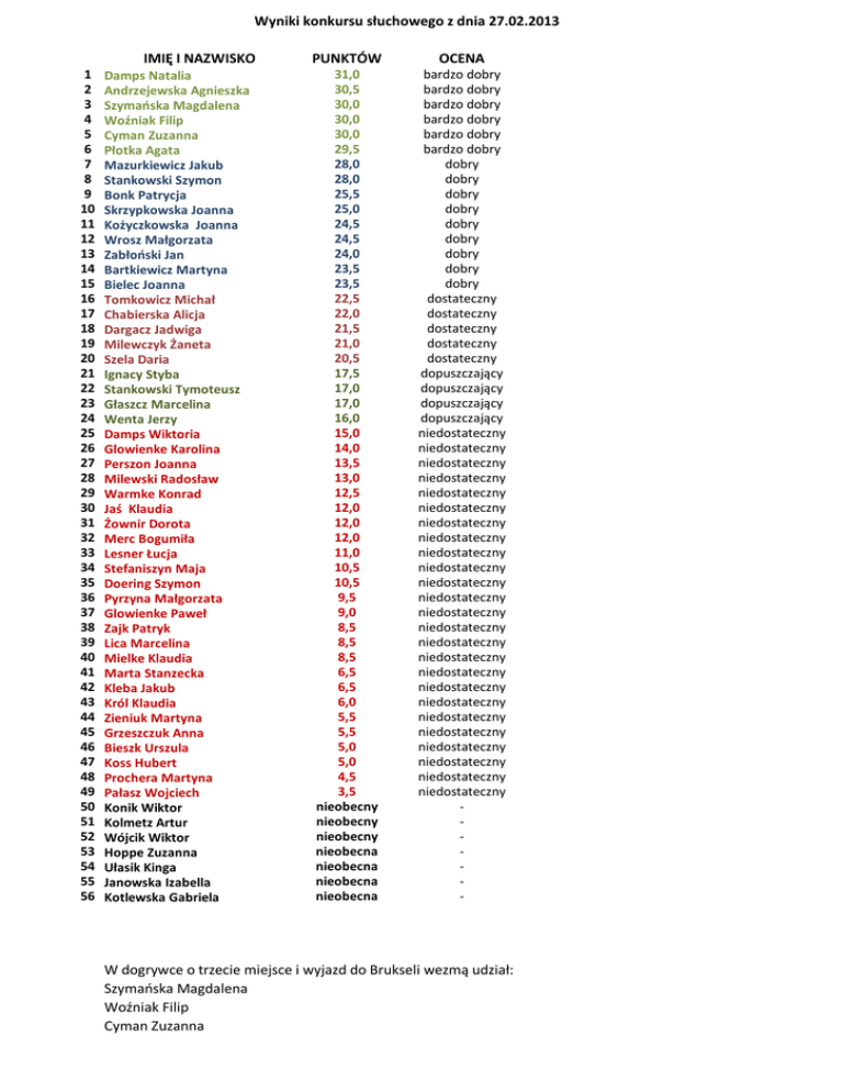 Wyniki konkursu słuchowego z dnia 27.02.2013 IMIĘ I NAZWISKO 1 2 3 4 5 6 7 8 9 10 11 12 13 14 15 16 17 18 19 20 21 22 23 24 25 26 27 28 29 30 31 32 33 34 35 36 37 38 39 40 41 42 43 44 45 46 47 48 49 50 51 52 53 54 55 56 Damps Natalia Andrzejewska Agnieszka Szymańska Magdalena Woźniak Filip Cyman Zuzanna Płotka Agata Mazurkiewicz Jakub Stankowski Szymon Bonk Patrycja Skrzypkowska Joanna Kożyczkowska Joanna Wrosz Małgorzata Zabłoński Jan Bartkiewicz Martyna Bielec Joanna Tomkowicz Michał Chabierska Alicja Dargacz Jadwiga Milewczyk Żaneta Szela Daria Ignacy Styba Stankowski Tymoteusz Głaszcz Marcelina Wenta Jerzy Damps Wiktoria Glowienke Karolina Perszon Joanna Milewski Radosław Warmke Konrad Jaś Klaudia Żownir Dorota Merc Bogumiła Lesner Łucja Stefaniszyn Maja Doering Szymon Pyrzyna Małgorzata Glowienke Paweł Zajk Patryk Lica Marcelina Mielke Klaudia Marta Stanzecka Kleba Jakub Król Klaudia Zieniuk Martyna Grzeszczuk Anna Bieszk Urszula Koss Hubert Prochera Martyna Pałasz Wojciech Konik Wiktor Kolmetz Artur Wójcik Wiktor Hoppe Zuzanna Ułasik Kinga Janowska Izabella Kotlewska Gabriela PUNKTÓW OCENA 31,0 30,5 30,0 30,0 30,0 29,5 28,0 28,0 25,5 25,0 24,5 24,5 24,0 23,5 23,5 22,5 22,0 21,5 21,0 20,5 17,5 17,0 17,0 16,0 15,0 14,0 13,5 13,0 12,5 12,0 12,0 12,0 11,0 10,5 10,5 9,5 9,0 8,5 8,5 8,5 6,5 6,5 6,0 5,5 5,5 5,0 5,0 4,5 3,5 nieobecny nieobecny nieobecny nieobecna nieobecna nieobecna nieobecna bardzo dobry bardzo dobry bardzo dobry bardzo dobry bardzo dobry bardzo dobry dobry dobry dobry dobry dobry dobry dobry dobry dobry dostateczny dostateczny dostateczny dostateczny dostateczny dopuszczający dopuszczający dopuszczający dopuszczający niedostateczny niedostateczny niedostateczny niedostateczny niedostateczny niedostateczny niedostateczny niedostateczny niedostateczny niedostateczny niedostateczny niedostateczny niedostateczny niedostateczny niedostateczny niedostateczny niedostateczny niedostateczny niedostateczny niedostateczny niedostateczny niedostateczny niedostateczny niedostateczny niedostateczny - W dogrywce o trzecie miejsce i wyjazd do Brukseli wezmą udział: Szymańska Magdalena Woźniak Filip Cyman Zuzanna