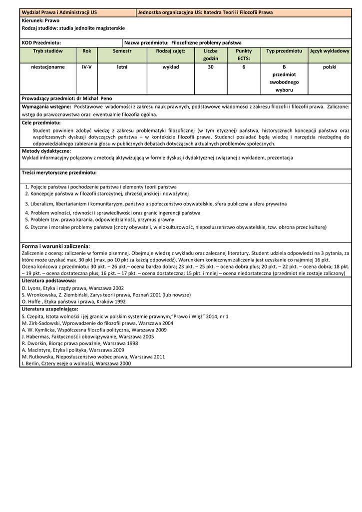Wydział Prawa i Administracji US Jednostka organizacyjna US: Katedra Teorii i Filozofii Prawa Kierunek: Prawo Rodzaj studiów: studia jednolite magisterskie KOD Przedmiotu: Nazwa przedmiotu: Filozoficzne problemy państwa Tryb studiów Rok Semestr Rodzaj zajęć: Liczba godzin Punkty ECTS: Typ przedmiotu Język wykładowy niestacjonarne IV-V letni wykład 30 6 B przedmiot swobodnego wyboru polski Prowadzący przedmiot: dr Michał Peno Wymagania wstępne: Podstawowe wiadomości z zakresu nauk prawnych, podstawowe wiadomości z zakresu filozofii i filozofii prawa. Zaliczone: wstęp do prawoznawstwa oraz ewentualnie filozofia ogólna. Cele przedmiotu: Student powinien zdobyć wiedzę z zakresu problematyki filozoficznej (w tym etycznej) państwa, historycznych koncepcji państwa oraz współczesnych dyskusji dotyczących państwa – w kontekście filozofii prawa. Studenci posiadać będą wiedzę i narzędzia niezbędną do odpowiedzialnego zabierania głosu w publicznych debatach dotyczących aktualnych problemów społecznych. Metody dydaktyczne: Wykład informacyjny połączony z metodą aktywizującą w formie dyskusji dydaktycznej związanej z wykładem, prezentacja Treści merytoryczne przedmiotu: 1. Pojęcie państwa i pochodzenie państwa i elementy teorii państwa 2. Koncepcje państwa w filozofii starożytnej, chrześcijańskiej i nowożytnej 3. Liberalizm, libertarianizm i komunitaryzm, państwo a społeczeństwo obywatelskie, sfera publiczna a sfera prywatna 4. Problem wolności, równości i sprawiedliwości oraz granic ingerencji państwa 5. Problem tzw. prawa karania, odpowiedzialność, przymus prawny 6. Etyczne i moralne problemy państwa (cnoty obywateli, wielokulturowość, nieposłuszeństwo obywatelskie, tzw. obrona przez kulturę) Forma i warunki zaliczenia: Zaliczenie z oceną: zaliczenie w formie pisemnej. Obejmuje wiedzę z wykładu oraz zalecanej literatury. Student udziela odpowiedzi na 3 pytania, za które może uzyskać max. 30 pkt (max. po 10 pkt za każdą odpowiedź). Warunkiem koniecznym zaliczenia jest uzyskanie co najmniej 16 pkt. Ocena końcowa z przedmiotu: 30 pkt. – 26 pkt.– ocena bardzo dobra; 23 pkt. – 25 pkt. – ocena dobra plus; 20 pkt. – 22 pkt. – ocena dobra; 18 pkt. – 19 pkt. – ocena dostateczna plus; 16 pkt. – 17 pkt. – ocena dostateczna; 15 pkt. i mniej – ocena niedostateczna (przedmiot nie zostaje zaliczony) Literatura podstawowa: D. Lyons, Etyka i rządy prawa, Warszawa 2002 S. Wronkowska, Z. Ziembiński, Zarys teorii prawa, Poznań 2001 (lub nowsze) O. Hoffe , Etyka państwa i prawa, Kraków 1992 Literatura uzupełniająca: S. Czepita, Istota wolności i jej granic w polskim systemie prawnym,”Prawo i Więź” 2014, nr 1 M. Zirk-Sadowski, Wprowadzenie do filozofii prawa, Warszawa 2004 A. W. Kymlicka, Współczesna filozofia polityczna, Warszawa 2009 J. Habermas, Faktyczność i obowiązywanie, Warszawa 2005 R. Dworkin, Biorąc prawa poważnie, Warszawa 1998 A. MacIntyre, Etyka i polityka, Warszawa 2009 M. Rutkowska, Nieposłuszeństwo wobec prawa, Warszawa 2011 I. Berlin, Cztery eseje o wolności, Warszawa 2000