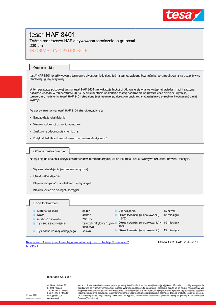 tesa® HAF 8401 Taśma montażowa HAF aktywowana termicznie, o grubości 200 µm INFORMACJA O PRODUKCIE Opis produktu tesa® HAF 8401 to aktywowana termicznie dwustronnie klejąca taśma samoprzylepna bez nośnika, wyprodukowana na bazie żywicy fenolowej i gumy nitrylowej. W temperaturze pokojowej taśma tesa® HAF 8401 nie wykazuje lepkości. Aktywuje się ona we wstępnej fazie laminacji i zaczyna nabierać lepkości w temperaturze 90 °C. W drugim etapie nakładania taśmę poddaje się na pewien czas działaniu wysokiej temperatury i ciśnienia. tesa® HAF 8401 chroniona jest mocnym papierowym paskiem, można ją łatwo przecinać i wytwarzać z niej wykroje. Po zespoleniu taśma tesa® HAF 8401 charakteryzuje się: • Bardzo dużą siłą klejenia • Wysoką odpornością na temperaturę • Znakomitą odpornością chemiczną • Dzięki składnikom kauczukowym zachowuje elastyczność Główne zastosowanie Nadaje się do spajania wszystkich materiałów termoodpornych, takich jak metal, szkło, tworzywa sztuczne, drewno i tekstylia. • Wysoka siła klejenia (wzmacnianie łączeń) • Strukturalne klejenie • Klejenie magnesów w silnikach elektrycznych • Klejenie okładzin ciernych sprzęgieł Dane techniczne Materiał nośnika Kolor Grubość całkowita Typ substancji klejącej Typ paska zabezpieczającego żaden amber 200 µm kauczuk nitrylowy / żywica fenolowa celofan Siła wiązania Okres trwałości (w opakowaniu) < 5°C Okres trwałości (w opakowaniu) < 15°C Okres trwałości (w opakowaniu) Najnowsze informacje na temat tego produktu znajdziesz tutaj http://l.tesa.com/? ip=08401 12 N/mm² 18 miesięcy 15 miesięcy 12 miesięcy Strona 1 z 2 / Data: 28.03.2014 tesa tape Sp. z o.o. ul. Gnieźnieńska 32 61-021 Poznań Tel.: +48 61 874 6147 Fax: +48 61 874 6019 [email protected] www.tesa.pl W ciężkich warunkach eksploatacyjnych, produkty tesa® stale dowodzą swej imponującej jakości. Ponadto, produkty te regularnie poddawane są rygorystycznej kontroli jakości. Wszystkie podane tutaj informacje i zalecenia oparte są na naszej najlepszej w tym względzie wiedzy i praktycznym doświadczeniu. Mimo tego tesa SE nie może dać rękojmi, czy to wyraźnej czy domyślnej. Zatem w każdym konkretnym przypadku to użytkownik ponosi odpowiedzialność za ustalenie zdatności danego produktu tesa® co do celu, jak i przyjętej przez niego metody nakładania. W wypadku jakichkolwiek wątpliwości prosimy zasięgnąć porady w naszym dziale Pomocy Technicznej. Dodatkowe informacje Proces obróbki: 1. Laminowanie wstępne: tesa® HAF 8401 laminowana jest przed utwardzeniem. Zalecana temperatura dla tego procesu mieści się w granicach 120 °C a 140 °C. 2. Spajanie: Temperatura, ciśnienie i czas potrzebne do uzyskania spojenia zależą od konkretnego zastosowania. Można przyjąć następujące parametry jako wytyczne: Łączenie na długość: • Temperatura: 120 - 220 °C • Ciśnienie: > 2 bar • Czas: 15 sek. - 90 sek. Okładziny cierne do sprzęgieł: • Temperatura: 180 - 230 °C • Ciśnienie: > 8 bar • Czas: 3 min - 30 min Klejenie magnesów w silnikach elektrycznych: • Temperatura: 140 - 180 °C • Ciśnienie: > 6-10 bar • Czas: 2 min - 5 min Strukturalne klejenie • Temperatura: 180 - 220 °C • Ciśnienie: > 10-15 bar • Czas: 3 min - 30 min Aby uzyskać maksymalną siłę klejenia, spajane powierzchnie powinny być czyste i suche. Warunki przechowywania zgodne z zasadami utrzymania trwałości produktów tesa® HAF. Uwaga: Wartości siły klejenia uzyskano w standardowych warunkach laboratoryjnych (wartości uśrednione). Dla każdej partii produktów sprawdza się zachowanie tych wartości w granicach ustalonej tolerancji (Materiał: próbka testowa z wytrawionego aluminium / warunki spajania: Temp. = 120 °C; p = 10 bar; t = 8 min) Najnowsze informacje na temat tego produktu znajdziesz tutaj http://l.tesa.com/? ip=08401 Strona 2 z 2 / Data: 28.03.2014 tesa tape Sp. z o.o. ul. Gnieźnieńska 32 61-021 Poznań Tel.: +48 61 874 6147 Fax: +48 61 874 6019 [email protected] www.tesa.pl W ciężkich warunkach eksploatacyjnych, produkty tesa® stale dowodzą swej imponującej jakości. Ponadto, produkty te regularnie poddawane są rygorystycznej kontroli jakości. Wszystkie podane tutaj informacje i zalecenia oparte są na naszej najlepszej w tym względzie wiedzy i praktycznym doświadczeniu. Mimo tego tesa SE nie może dać rękojmi, czy to wyraźnej czy domyślnej. Zatem w każdym konkretnym przypadku to użytkownik ponosi odpowiedzialność za ustalenie zdatności danego produktu tesa® co do celu, jak i przyjętej przez niego metody nakładania. W wypadku jakichkolwiek wątpliwości prosimy zasięgnąć porady w naszym dziale Pomocy Technicznej.