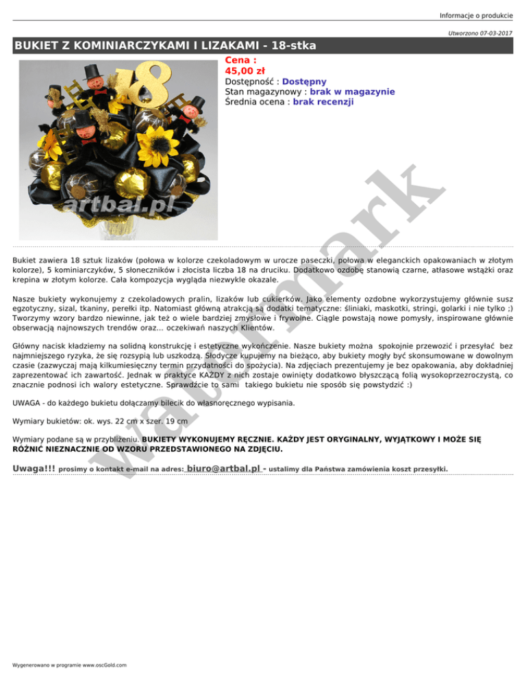 Informacje o produkcie Utworzono 07-03-2017 BUKIET Z KOMINIARCZYKAMI I LIZAKAMI - 18-stka Cena : 45,00 zł er m ar k Dostępność : Dostępny Stan magazynowy : brak w magazynie Średnia ocena : brak recenzji Bukiet zawiera 18 sztuk lizaków (połowa w kolorze czekoladowym w urocze paseczki, połowa w eleganckich opakowaniach w złotym kolorze), 5 kominiarczyków, 5 słoneczników i złocista liczba 18 na druciku. Dodatkowo ozdobę stanowią czarne, atłasowe wstążki oraz krepina w złotym kolorze. Cała kompozycja wygląda niezwykle okazale. Nasze bukiety wykonujemy z czekoladowych pralin, lizaków lub cukierków. Jako elementy ozdobne wykorzystujemy głównie susz egzotyczny, sizal, tkaniny, perełki itp. Natomiast główną atrakcją są dodatki tematyczne: śliniaki, maskotki, stringi, golarki i nie tylko ;) Tworzymy wzory bardzo niewinne, jak też o wiele bardziej zmysłowe i frywolne. Ciągle powstają nowe pomysły, inspirowane głównie obserwacją najnowszych trendów oraz... oczekiwań naszych Klientów. at Główny nacisk kładziemy na solidną konstrukcję i estetyczne wykończenie. Nasze bukiety można spokojnie przewozić i przesyłać bez najmniejszego ryzyka, że się rozsypią lub uszkodzą. Słodycze kupujemy na bieżąco, aby bukiety mogły być skonsumowane w dowolnym czasie (zazwyczaj mają kilkumiesięczny termin przydatności do spożycia). Na zdjęciach prezentujemy je bez opakowania, aby dokładniej zaprezentować ich zawartość. Jednak w praktyce KAŻDY z nich zostaje owinięty dodatkowo błyszczącą folią wysokoprzezroczystą, co znacznie podnosi ich walory estetyczne. Sprawdźcie to sami takiego bukietu nie sposób się powstydzić :) UWAGA - do każdego bukietu dołączamy bilecik do własnoręcznego wypisania. Wymiary bukietów: ok. wys. 22 cm x szer. 19 cm w Wymiary podane są w przybliżeniu. BUKIETY WYKONUJEMY RĘCZNIE. KAŻDY JEST ORYGINALNY, WYJĄTKOWY I MOŻE SIĘ RÓŻNIĆ NIEZNACZNIE OD WZORU PRZEDSTAWIONEGO NA ZDJĘCIU. Uwaga!!! prosimy o kontakt e-mail na adres: Wygenerowano w programie www.oscGold.com [email protected] - ustalimy dla Państwa zamówienia koszt przesyłki.