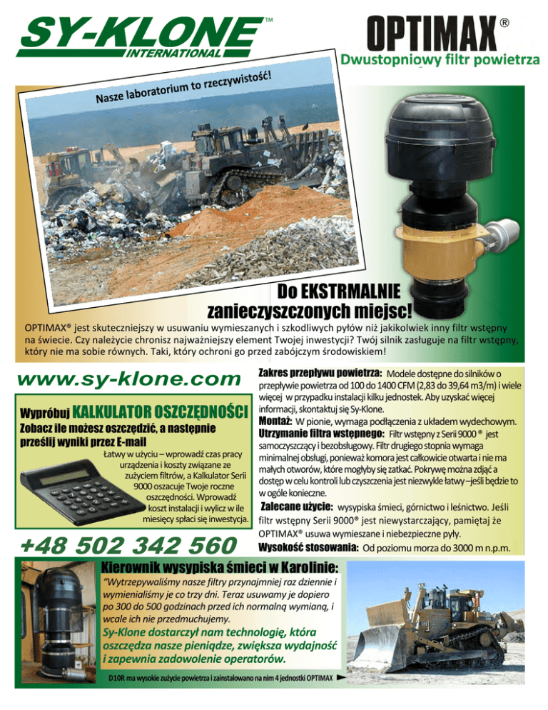 Do EKSTRMALNIE zanieczyszczonych miejsc! OPTIMAX® jest skuteczniejszy w usuwaniu wymieszanych i szkodliwych pyłów niż jakikolwiek inny filtr wstępny na świecie. Czy należycie chronisz najważniejszy element Twojej inwestycji? Twój silnik zasługuje na filtr wstępny, który nie ma sobie równych. Taki, który ochroni go przed zabójczym środowiskiem! Zakres przepływu powietrza: Modele dostępne do silników o przepływie powietrza od 100 do 1400 CFM (2,83 do 39,64 m3/m) i wiele więcej w przypadku instalacji kilku jednostek. Aby uzyskad więcej Wypróbuj KALKULATOR OSZCZĘDNOŚCI informacji, skontaktuj się Sy-Klone. Montaż: W pionie, wymaga podłączenia z układem wydechowym. Zobacz ile możesz oszczędzić, a następnie Utrzymanie filtra wstępnego: Filtr wstępny z Serii 9000 ® jest prześlij wyniki przez E-mail samoczyszczący i bezobsługowy. Filtr drugiego stopnia wymaga Łatwy w użyciu – wprowadź czas pracy minimalnej obsługi, ponieważ komora jest całkowicie otwarta i nie ma urządzenia i koszty związane ze małych otworów, które mogłyby się zatkad. Pokrywę można zdjąd a zużyciem filtrów, a Kalkulator Serii dostęp w celu kontroli lub czyszczenia jest niezwykle łatwy –jeśli będzie to 9000 oszacuje Twoje roczne w ogóle konieczne. oszczędności. Wprowadź Zalecane użycie: wysypiska śmieci, górnictwo i leśnictwo. Jeśli koszt instalacji i wylicz w ile miesięcy spłaci się inwestycja. filtr wstępny Serii 9000® jest niewystarczający, pamiętaj że OPTIMAX® usuwa wymieszane i niebezpieczne pyły. Wysokość stosowania: Od poziomu morza do 3000 m n.p.m. www.sy-klone.com +48 502 342 560 Kierownik wysypiska śmieci w Karolinie: C “Wytrzepywaliśmy nasze filtry przynajmniej raz dziennie i wymienialiśmy je co trzy dni. Teraz usuwamy je dopiero po 300 do 500 godzinach przed ich normalną wymianą, i wcale ich nie przedmuchujemy. Sy-Klone dostarczył nam technologię, która oszczędza nasze pieniądze, zwiększa wydajnośd i zapewnia zadowolenie operatorów. D10R ma wysokie zużycie powietrza i zainstalowano na nim 4 jednostki OPTIMAX Jak to działa: Cechy i korzyści: Krok 1: Powietrze wchodzi do Wydłuża okresy pomiędzy przeglądami: Obniża koszt godziny pracy! 3 4 STOPIEŃ 1 2 5 7 5 STOPIEŃ 2 OPTIMAXa® przez ekran wstępny (lub w opcji ekran do grubych okruchów), który usuwa największe zanieczyszczenia. Krok2: Zakrzywione łopatki przyspieszają powietrze i drobinki, ciskając je o boczne ścianki kopuły. Krok3: Prowadnice (zagięte łopatki) wzdłuż wewnętrznej powierzchni przesuwają cięższe 1 od powietrza drobinki w kierunku otwory wyrzutowego. Step 4: Wstępnie oczyszczone powietrze wchodzi w drugi stopieo filtracji - OPTIMAX®. Krok5: Pozostałe drobne lecz cięższe od powietrza drobinki obiegają wzdłuż zewnętrznych ścianek. Sprawdzony w najcięższych warunkach: Działa w każdej pogodzie! Wymagana minimalna obsługa: Obniża czas przestoju spowodowany wymianą filtra! Wbudowany ekran przeciw dużym cząstkom: Blokuje duże cząstki na wlocie! Powierzchnia nie odbija światła: W małym stopniu odwraca uwagę operatora! Konstrukcja dwustopniowa: Skuteczny przy mieszanym pyle i w skrajnych warunkach! SKontroler pracy w Pd. Karolinie, USA: “OPTIMAX naprawdę się nam spodobał. Na początku wytrzepywaliśmy filtry co drugi dzieo i wymienialiśmy raz na tydzieo, a dziś wymieniamy filtry co 300 godzin i nawet nie otwieramy obudowy filtra, aby go wytrzepad. Operatorzy kupili ten system całkowicie i ja także się z tym zgadzam. 6 Krok6: Cząstki zanieczyszczeo są następnie izolowane w misce wylotowej. Krok7: Odizolowane powietrze jest usuwane przez układ wydechowy maszyny. 8 Krok 8: Czyste powietrze wchodzi do wlotu powietrza do silnika. Oszczędności OPTIMAX : Pokaż mi kasę! Obsługa filtra powietrza BEZ OPTIMAX® Obsługa filtra powietrza Z OPTIMAX® Stawka robocizny: $15/ godzinę Czyszczenie 6 dni/ tydzieo x 52 tygodni $2.340,00 Stawka robocizny: $15,00/ godzinę Rutynowe czyszczenie jest niepotrzebne $2,498,60 $390,00 Koszt filtra powietrza: $48,05 sztuka 6 nowych filtrów na rok Praca przy wymianie filtra 6 razy w roku $0,00 (30 każde czyszczenie) Koszt filtra powietrza: $48.05 sztuka 1 nowy filtr co tydzieo x 52 tygodnie Praca przy wymianie filtra x 52 tygodnie (30 każde czyszczenie) Całkowity roczny koszt : $5.228,60 (30 każde czyszczenie) Całkowity roczny koszt: Oszczędność roczna: $4.895, 30 Wartości wyliczone dla D6R pracującej 3.000 godzin w roku. D6R © 2010 Sy-Klone International. Registered to ISO 9001:2008 Wszelkie prawa zastrzeżone. LIT 2002 Rev 005 11/09 Sy-Klone w Polsce: Diesel Air Poland ul. Dworcowa 11 34-300 Żywiec tel. +48 502 34 25 60 E-Mail: [email protected] $288,30 $45,00 $333,30
