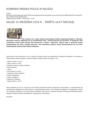 KOMENDA MIEJSKA POLICJI W KALISZU Źródło: http://www.kalisz.policja.gov.pl/wl7/informacje/stowarzyszenie-emerytow/z-zycia-seir-policyjnyc/39920,KALISZ-10-wrzesnia-2 016-r-SWITO-ULICY-NIECALEJ.html Wygenerowano: Wtorek, 7 marca 2017, 13:16 KALISZ 10 WRZEŚNIA 2016 R. - ŚWIÊTO ULICY NIECAŁEJ Już czwarty rok z rzędu władze samorządowe Kalisza organizują Święto ul. Niecałej. Wszystkie imprezy odbywają się na wymienionej ulicy i towarzyszących jej terenach. W bieżącym roku wystawiało swoje dzieła ponad 100 wystawców z Polski i zagranicy. Oprócz tego w obchody Święta zaangażowały się chóry, zespoły taneczne i inni animatorzy kultury. Nasze Stowarzyszenie po raz trzeci reprezentował artysta malarz Marian Ozdowski. Kontynuując nasze zamierzenia, że nic w Kaliszu nie dzieje się bez nas uzgodniliśmy z Marianem Ozdowskim, że wystawi on swoje wybrane dzieła związane z miastem Kaliszem. Malarz wybrał 20 obrazów , m.in. ● Ratusz w dzień i w nocy; ● Teatr w dzień i w nocy; ● Bazylika mniejsza z basztą „Dorotką”; ● Most kamienny; ● „Koza”; ● Straż Pożarna w rynku; ● Oranżeria w Parku Miejskim; ● Domek Szwajcarski; ● Zegar na Rogatce; ● Katedra św. Mikołaja; ● Spalony Kalisz w 1914 r. Wielu obiektów już nie ma. Cieszyły się one wśród mieszkańców Kalisza ogromnym sentymentem, co przedstawiało się westchnieniem oglądających osób starszych i przekazywaniem wiedzy o nich młodszemu pokoleniu. W uzupełnianiu historii tych obiektów pomagał im sam artysta Marian Ozdowski, który jest też członkiem Zarządu Towarzystwa Miłośników Kalisza. Wystawa cieszyła się dużym powodzeniem i była jedyną o tej tematyce. niecala16 Ocena: 0/5 (0) Tweetnij