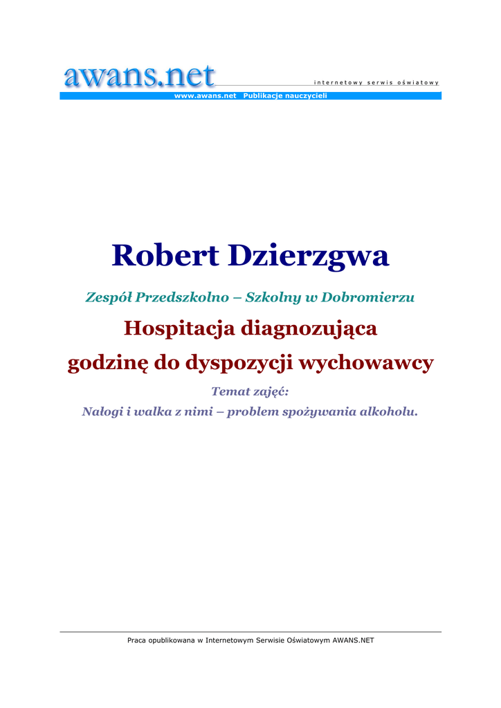 www.awans.net Publikacje nauczycieli Robert Dzierzgwa Zespół Przedszkolno – Szkolny w Dobromierzu Hospitacja diagnozująca godzinę do dyspozycji wychowawcy Temat zajęć: Nałogi i walka z nimi – problem spożywania alkoholu. Praca opublikowana w Internetowym Serwisie Oświatowym AWANS.NET ZESPOŁ PRZEDSZKOLNO – SZKOLNY W DOBROMIERZU mgr ROBERT DZIERZGWA HOSPITACJA DIAGNOZUJĄCA GODZINĘ DO DYSPOZYCJI WYCHOWAWCY KLASA VI „b” DOBROMIERZ 2003 ROZMOWA PRZEDHOSPITACYJNA Wychowankowie mojej klasy czynnie włączyli się w realizację zadań powstałego w szkole programu profilaktycznego. Jednym z takich zagadnień jest profilaktyka przeciwalkoholowa. W trakcie naszych wspólnych rozważań nad możliwością przedstawienia tego problemu całej społeczności uczniowskiej pojawiła się koncepcja wystawienia spektaklu teatralnego dotyczącego spożywania alkoholu. Wychowankowie bardzo chętnie i ochoczo podeszli do problemu i postanowili wystawić odszukane w literaturze przedstawienie pt. „W matni” (przewodnik MAWI, nr VIII). Ich ogromny wkład wysiłkowy od początku wzbudzał mój podziw. Próby spektaklu odbywały się w trakcie przerw, a nawet po zakończeniu lekcji. W próbach uczestniczyli wszyscy uczniowie i od samego początku wykazywali się dużym zrozumieniem tematu. Obsadzenie ról było wynikiem ich dyskusji i polemik, co również wzbudziło mój szacunek, tak wielki, że postanowiłem podzielić się z nim, zapraszając dyrektora szkoły na godzinę wychowawczą, podczas której zajęliśmy się problemem nadmiernego spożywania alkoholu. W tym momencie postanowiłem wpleść spektakl teatralny do szerszych rozważań nad tematyką spożywania alkoholu. Poza tym, zaproszenie dyrektora na moją lekcję wychowawczą, było także sposobem pozyskania informacji zwrotnej w pracy nauczyciela - wychowawcy. Swoją wiedzę wychowawczą czerpałem w zdecydowanej mierze na własnych doświadczeniach i przeżyciach, dlatego też uważam, iż dobrze jest od czasu do czasu pokazać swoją lekcję, zapraszając na nią gości. ARKUSZ HOSPITACJI DIAGNOZUJĄCEJ Imię i nazwisko: Robert Dzierzgwa Klasa: VI „b” Temat: Problem spożywania alkoholu. Cele: Uczniowie: znają i rozumieją zagrożenia, jakie niesie picie alkoholu, potrafią zilustrować przyczyny sięgania po alkohol, dostrzegają szkodliwości wynikające z nadużywania alkoholu, potrafią wyłonić sytuacje, które są skutkiem alkoholizmu, potrafią prowadzić dyskusję na ten temat. Pomoce: Karty pracy ,,Dlaczego ludzie piją alkohol?”, karty pracy ,,Kiedy alkohol szkodzi?”, karty pracy ,,Do czego prowadzi alkoholizm?”. Forma zajęć: Praca indywidualna, praca w kręgu klasowym. Czas zajęć: 45 minut. Standardy osiągnięć 1. Uczeń zna zagrożenia wynikające z nadużywania alkoholu. 2. Uczeń zna przyczyny sięgania po alkohol. Wskaźniki (standardy wymagań) a) potrafi podać przykłady zagrożeń wynikających z picia alkoholu, b) zna choroby powstające w wyniku alkoholizmu, c) zna i rozumie wpływ alkoholizmu na funkcjonowanie rodziny. a) rozumie pojęcie alkoholizmu, b) potrafi zilustrować przyczyny podejmowania decyzji zażywania alkoholu, Obserwacja wiedzy, umiejętności i postaw uczniów; skala (0-6) Uwagi nauczyciela: Temat, który zdecydowałem się przedstawić wspólnie z moimi wychowankami, jest szczególnie trudny. Jak wynika z badań odsetek niepijącej młodzieży w wieku do 17 lat to zaledwie 19% wśród chłopców i 23% wśród dziewcząt. Z roku na rok obniża się wiek inicjacji alkoholowej i zwiększa ilość pijących dziewcząt. Oczywiście można by powiedzieć, że jest to walka z wiatrakami, ale problem pozostaje. To, że nałogi są negatywnym zjawiskiem, jest bezdyskusyjne. I raczej na nic się tutaj zdaje moralizowanie typu: to jest złe, nie rób tak. Potrzebna jest konstruktywna rozmowa (nie tylko na lekcji i nie tylko raz) z wnikaniem w przyczyny i skutki, dostrzeganiem i docenianiem prób walki z nałogiem, podejmowanych przez samych uczniów. Gotowej recepty nie ma, ale chyba najgorzej jest nie dostrzegać problemu w ogóle lub włączyć kasetę video i zapisać temat w dzienniku lekcyjnym. Wnioski: Po realizacji zagadnienia wnioski do dalszej pracy nasuwają się samoistnie: 1. Systematyczna pedagogizacja rodziców w kwestii nadużywania alkoholu, gdyż tylko dzięki tak szerokiemu podejściu do problemu, możemy myśleć o lepszej i skuteczniejszej pracy profilaktycznej. 2. Nie można pozostawić problemu spożywania alkoholu tylko samym dzieciom - należy wskazywać postawy i działania, które są alternatywnymi dla „pustki” alkoholowej. Robert Dzierzgwa wychowawca klasy VI „b” w ZPS w Dobromierzu KONSPEKT GODZINY DO DYSPOZYCJI WYCHOWAWCY w klasie VI „b” przeprowadzonej 9 maja 2003 roku Temat: Nałogi i walka z nimi - problem spożywania alkoholu. Czas zajęć: 45 minut Forma pracy: zbiorowa, indywidualna, praca w kręgu klasowym Środki dydaktyczne: scenariusz przedstawienia „W matni”, karty pracy „Dlaczego ludzie piją alkohol?”, karty pracy „Kiedy alkohol szkodzi zdrowiu?”, karty pracy „Do czego prowadzi alkoholizm?”. Cele lekcji: Uczeń: zna przyczyny, dla których ludzie sięgają po alkohol, wie, w jakich sytuacjach alkohol szkodzi zdrowiu człowieka, zdaje sobie sprawę ze skutków nadużywania alkoholu. Przebieg lekcji: 1. Czynności organizacyjno – porządkowe. 2. Inscenizacja przedstawienia o tematyce antyalkoholowej pt. „W matni”. 3. Przygotowanie uczniów do szczerej rozmowy na temat alkoholizmu. 4. Ćwiczenie 1. Nauczyciel rozdaje uczniom karty (każdemu uczniowi) „Dlaczego ludzie piją alkohol?” i prosi ich o zapoznanie się z ich treścią. Następnie proponuje, aby sami w swoich myślach zastanowili się i jeśli kiedykolwiek spożywali alkohol, to z których powodów wymienionych w karcie. W omówieniu tego ćwiczenia nauczyciel zadaje uczniom pytania: - Jak się czujesz po przeczytaniu tych informacji? - 