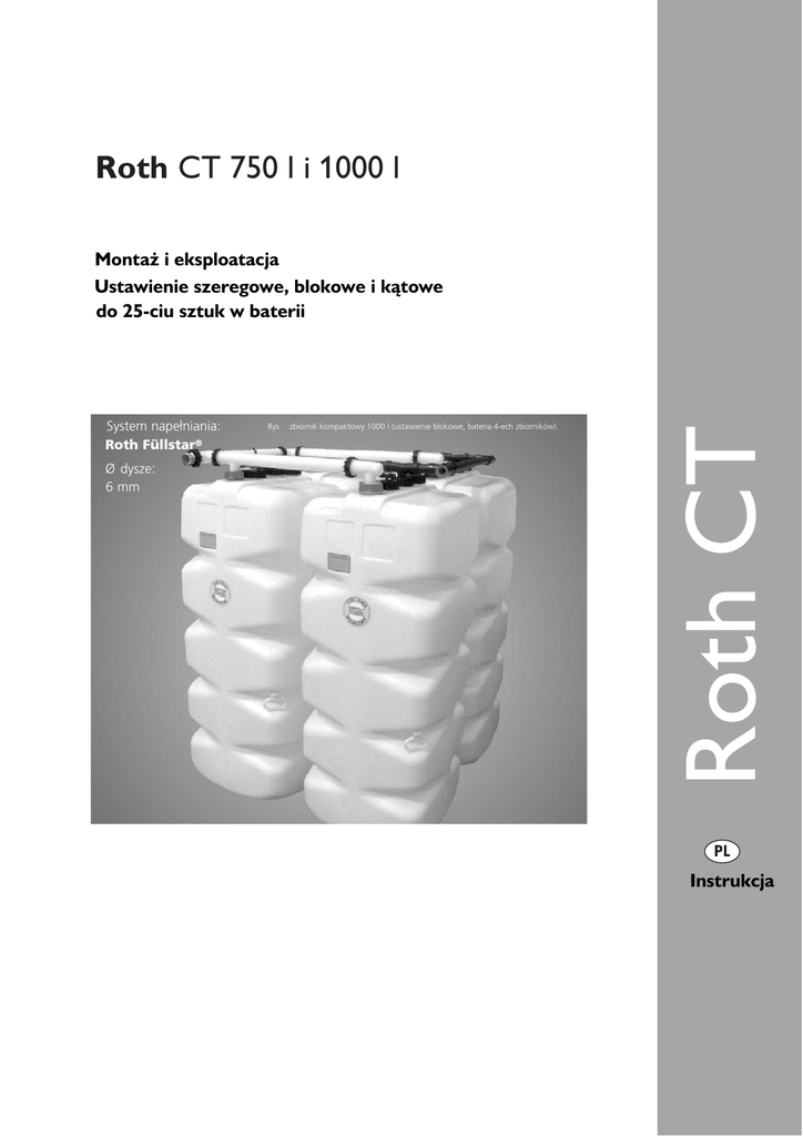 Roth CT 750 l i 1000 l System napełniania: Roth Füllstar® Ø dysze: 6 mm Certyfikaty: AT - 15 - 8515/2010 Rys. zbiornik kompaktowy 1000 l (ustawienie blokowe, bateria 4-ech zbiorników). Roth CT Montaż i eksploatacja Ustawienie szeregowe, blokowe i kątowe do 25-ciu sztuk w baterii PL Instrukcja CT WSTĘP Niniejsze wytyczne określają warunki stosowania, eksploatacji i montażu zbiorników na olej opałowy firmy Roth, z uwzględnieniem norm i przepisów obowiązujących w Polsce. Przy projektowaniu należy uwzględnić jednak wszelkie aktualizacje tychże przepisów. Wszelkie dokumenty dołączone do zbiorników należy zabezpieczyć przed zniszczeniem i odpowiednio przechowywać. TRANSPORT Chronić zbiorniki przed ostrymi przedmiotami! Nie ciągnąć ich po szorstkich podłożach! Zabrudzenia usuwać wyłącznie wodą! Nie stosować rozpuszczalników! • • • • • PRZEZNACZENIE I WARUNKI STOSOWANIA Zbiorniki przeznaczone są do magazynowania olejów opałowych o właściwościach opisanych w PN-76/C-96024, tzn. cieczy palnych III klasy niebezpieczeństwa pożarowego, tj. o temperaturze zapłonu powyżej 55 °C, w warunkach bezciśnieniowych (tylko pod ciśnieniem hydrostatycznym magazynowanego oleju opałowego). Zbiorniki powinny być eksploatowane w warunkach wykluczających możliwość nagrzania (nawet miejscowego) do temperatury wyższej niż 40 °C. Pomieszczenia w budynkach, w których odbywa się magazynowanie oleju opałowego w polietylenowych zbiornikach Roth muszą być zgodne z: • • Rozporządzeniem Ministra Infrastruktury z dnia 12 kwietnia 2002 r. w sprawie warunków technicznych, jakim powinny odpowiadać budynki i ich usytuowanie. (Dz. U. z 2002 Nr 75, poz. 690 wraz z późniejszymi zmianami), Rozporządzeniem Ministra Spraw Wewnętrznych i Administracji z dnia 16 czerwca 2003 r. w sprawie ochrony przeciwpożarowej budynków, innych obiektów budowlanych i terenów. (Dz. U. z 2003 Nr 121 poz. 1138). Pomieszczenia powinny stanowić odrębną strefę pożarową, oddzieloną od pozostałych części budynku ścianami i stropami klasy odporności ogniowej co najmniej 60 minut, a zamknięcia otworów w ścianach i stropach co najmniej 30 minut (w budynkach wysokościowych odpowiednio 120 i 60 minut). • • • • • • • • • Dopuszcza się składowanie oleju opałowego o objętości do 1000 litrów bezpośrednio w pomieszczeniu kotłowym pod warunkiem zachowania między zbiornikami a kotłem minimalnej odległości wynoszącej 1 metr. Pomieszczenia powinny posiadać wannę wychwytującą olej. Napełnienie zbiornika nie może przekraczać 95 % jego objętości. USTAWIENIE Zbiorniki można ustawiać do 25-ciu sztuk w baterii, max w 5-ciu szeregach; możliwe jest również ustawienie kątowe. Podłoga w pomieszczeniu składowym powinna być gładka, wypoziomowana oraz posiadać zdolność nośną. Zbiorniki należy ustawić tak, aby można było odczytać tabliczki znamionowe na zbiornikach w – baterii. Należy zachować przynajmniej 40 cm od ściany czołowej i bocznej (możliwość dojścia do zbiorników) oraz przynajmniej 5 cm od pozostałych ścian (zaleca się jednak – ze względu na odkształcenie zbiorników po napełnieniu – pozostawienie przy montażu około 10 cm). Odstęp od sufitu powinien umożliwić zamontowanie głównego zestawu ssawnego, zaleca się pozostawienie min. 20 cm od górnej krawędzi króćców zbiornika. Odległości między środkami zbiorników wynoszą: 780 mm (kompakt 750 l) oraz 840 mm (kompakt 1000 l). DODATKOWE UWAGI do montażu zbiorników należy używać wyłącznie oryginalnych elementów Roth; układy zalewowy i odpowietrzający należy przygotować najpierw na podłożu, a następnie w całości zamontować na zbiornikach; przed montażem należy odtłuścić wszystkie oringi; zewnętrzna instalacja zalewowa musi być odporna na ciśnienie 10 bar; zewnętrzne instalacje zalewową i odpowietrzenia należy chronić przed powstawaniem dodatkowych naprężeń; 2 • • • • • • • nie wolno wykonywać zewnętrznej instalacji zalewowej oraz odpowietrzenia na sztywnych połączeniach (np. rura spawana, mocowana sztywnymi uchwytami do ściany); w związku z tym, między przyłączami Roth, a zewnętrzną rurą zalewową oraz zewnętrzną rurą odpowietrzającą należy zamontować dwa kolana połączone prostką dł. ok. 1 m, ze spadkiem w kierunku zbiorników; główny zestaw ssawny montować zawsze na zbiorniku na którym znajduje się końcówka zalewowa; po zamontowaniu na zbiornikach należy dokręcić wszystkie połączenia gwintowane; po pierwszym napełnieniu należy sprawdzić szczelność wszystkich połączeń; następnie regularnie powtarzać kontrole; system poboru paliwa jest systemem dwudrogowym; zbiorniki można napełniać wyłącznie ciśnieniowo, poprzez szczelne złącze zewnętrzne; jeżeli cysterna nie jest przystosowana do współpracy z czujnikiem maksymalnego napełnienia, niezbędne jest zapewnienie niezależnej sygnalizacji napełnienia w postaci np. dzwonka umieszczonego na zewnątrz, a włączanego w składzie opału przez osobę nadzorującą napełnianie; napełnianie powinno być zawsze nadzorowane wewnątrz składu opału; przy wszelkich pracach należy uwzględnić wymogi Prawa Budowlanego i ewentualne przepisy terenowe; CT Ustawienie pojedynczego zbiornika Łączyć wolno wyłącznie rury przewodów napełniających o tym samym kolorze nakrętki nasadowej (czerwonej i zielonej, dysza 6 mm). 1 2 Zamontować na 1. króćcu zbiornika (z wewnętrzną rurą zalewową) kolano zalewowe z końcówką zalewową; o-ringi natłuścić; Na 2. króćcu zamontować główny zestaw ssawny; 3 4 Za pomocą zaślepki i nakrętki zamknąć wyjście z zestawu ssawnego do następnego zbiornika; Na 3. króćcu zamontować kolano odpowietrzenia wraz z końcówką odpowietrzenia; Ustawienie szeregowe, blokowe i kątowe (od 2 do 25 zbiorników) 1 2 Zmontować układ zalewowy dla jednego szere