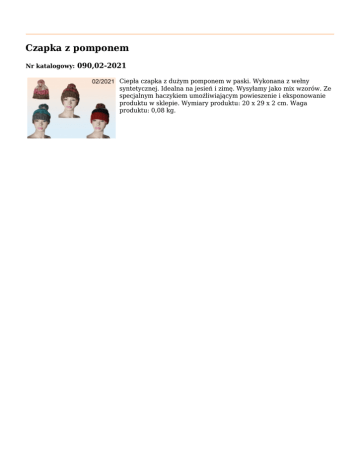 Czapka z pomponem Nr katalogowy: 090,02-2021 Ciepła czapka z dużym pomponem w paski. Wykonana z wełny syntetycznej. Idealna na jesień i zimę. Wysyłamy jako mix wzorów. Ze specjalnym haczykiem umożliwiającym powieszenie i eksponowanie produktu w sklepie. Wymiary produktu: 20 x 29 x 2 cm. Waga produktu: 0,08 kg.