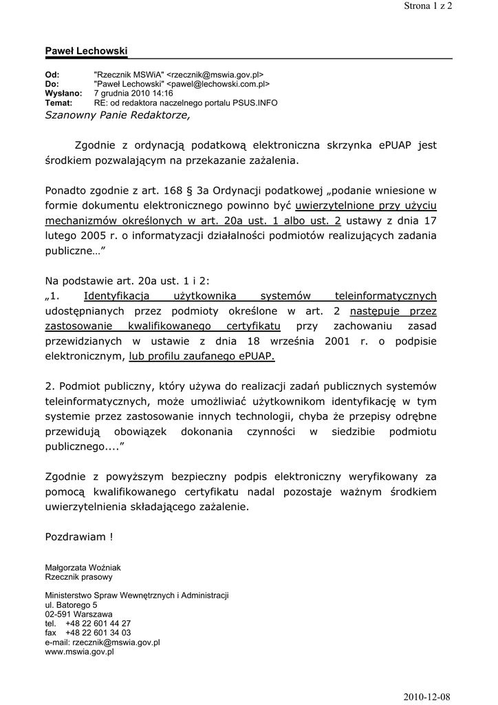 Strona 1 z 2 Paweł Lechowski Od: Do: Wysłano: Temat: "Rzecznik MSWiA" <[email protected]> "Paweł Lechowski" <[email protected]> 7 grudnia 2010 14:16 RE: od redaktora naczelnego portalu PSUS.INFO Szanowny Panie Redaktorze, Zgodnie z ordynacją podatkową elektroniczna skrzynka ePUAP jest środkiem pozwalającym na przekazanie zaŜalenia. Ponadto zgodnie z art. 168 § 3a Ordynacji podatkowej „podanie wniesione w formie dokumentu elektronicznego powinno być uwierzytelnione przy uŜyciu mechanizmów określonych w art. 20a ust. 1 albo ust. 2 ustawy z dnia 17 lutego 2005 r. o informatyzacji działalności podmiotów realizujących zadania publiczne…” Na podstawie art. 20a ust. 1 i 2: „1. Identyfikacja uŜytkownika systemów udostępnianych przez podmioty określone w art. zastosowanie kwalifikowanego certyfikatu przy przewidzianych w ustawie z dnia 18 września elektronicznym, lub profilu zaufanego ePUAP. teleinformatycznych 2 następuje przez zachowaniu zasad 2001 r. o podpisie 2. Podmiot publiczny, który uŜywa do realizacji zadań publicznych systemów teleinformatycznych, moŜe umoŜliwiać uŜytkownikom identyfikację w tym systemie przez zastosowanie innych technologii, chyba Ŝe przepisy odrębne przewidują obowiązek dokonania czynności w siedzibie podmiotu publicznego....” Zgodnie z powyŜszym bezpieczny podpis elektroniczny weryfikowany za pomocą kwalifikowanego certyfikatu nadal pozostaje waŜnym środkiem uwierzytelnienia składającego zaŜalenie. Pozdrawiam ! Małgorzata Woźniak Rzecznik prasowy Ministerstwo Spraw Wewnętrznych i Administracji ul. Batorego 5 02-591 Warszawa tel. +48 22 601 44 27 fax +48 22 601 34 03 e-mail: [email protected] www.mswia.gov.pl 2010-12-08 Strona 2 z 2 ______________________________________________________ Pomyśl o środowisku zanim zdecydujesz się na wydrukowanie tej wiadomości. From: Paweł Lechowski [mailto:[email protected]] Sent: Friday, December 03, 2010 3:49 PM To: izba celna izba celna; Rzecznik MSWiA Subject: od redaktora naczelnego portalu PSUS.INFO Dzien Dobry Na naszym portalu pojawił sie materiał interwencyjny. Chodzi o to, Ŝe Izba Celna w Katowicach odrzuca w prowadzonych postepowaniach pisma opatrzone tzw e- podpisem. Podany jest konkretny przykład. W IC odpowiada za te sprawy pani Danuta Wolniaczyk. Czy stanowisko Izby Celnej w katowicach w sprawie stosowania e-podpisu jest zgodne ze stanowiskiem MSWiA? Odpowiedź zamieścimy na naszym portalu http://psus.info/ pozdrawiam Pawel Lechowski __________ Informacja programu ESET NOD32 Antivirus, wersja bazy sygnatur wirusow 5670 (20101203) __________ Wiadomosc zostala sprawdzona przez program ESET NOD32 Antivirus. http://www.eset.pl lub http://www.eset.com __________ Informacja programu ESET NOD32 Antivirus, wersja bazy sygnatur wirusow 5681 (20101207) __________ Wiadomosc zostala sprawdzona przez program ESET NOD32 Antivirus. http://www.eset.pl lub http://www.eset.com 2010-12-08