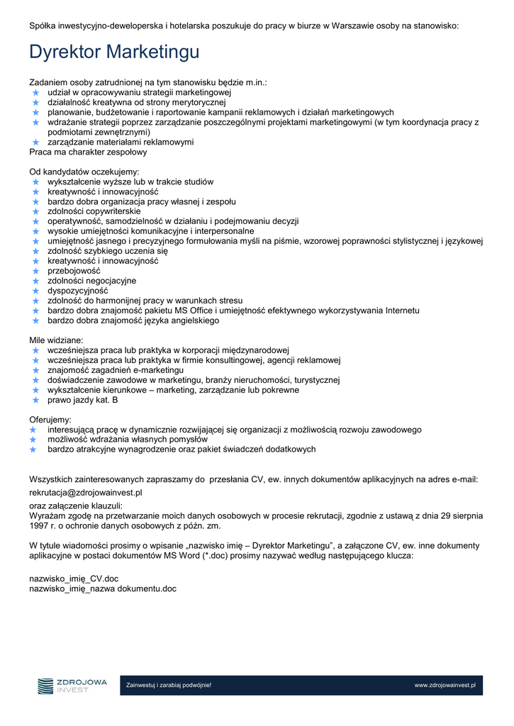 Spółka inwestycyjno-deweloperska i hotelarska poszukuje do pracy w biurze w Warszawie osoby na stanowisko: Dyrektor Marketingu Zadaniem osoby zatrudnionej na tym stanowisku będzie m.in.: udział w opracowywaniu strategii marketingowej działalność kreatywna od strony merytorycznej planowanie, budżetowanie i raportowanie kampanii reklamowych i działań marketingowych wdrażanie strategii poprzez zarządzanie poszczególnymi projektami marketingowymi (w tym koordynacja pracy z podmiotami zewnętrznymi) zarządzanie materiałami reklamowymi Praca ma charakter zespołowy Od kandydatów oczekujemy: wykształcenie wyższe lub w trakcie studiów kreatywność i innowacyjność bardzo dobra organizacja pracy własnej i zespołu zdolności copywriterskie operatywność, samodzielność w działaniu i podejmowaniu decyzji wysokie umiejętności komunikacyjne i interpersonalne umiejętność jasnego i precyzyjnego formułowania myśli na piśmie, wzorowej poprawności stylistycznej i językowej zdolność szybkiego uczenia się kreatywność i innowacyjność przebojowość zdolności negocjacyjne dyspozycyjność zdolność do harmonijnej pracy w warunkach stresu bardzo dobra znajomość pakietu MS Office i umiejętność efektywnego wykorzystywania Internetu bardzo dobra znajomość języka angielskiego Mile widziane: wcześniejsza praca lub praktyka w korporacji międzynarodowej wcześniejsza praca lub praktyka w firmie konsultingowej, agencji reklamowej znajomość zagadnień e-marketingu doświadczenie zawodowe w marketingu, branży nieruchomości, turystycznej wykształcenie kierunkowe – marketing, zarządzanie lub pokrewne prawo jazdy kat. B Oferujemy: interesującą pracę w dynamicznie rozwijającej się organizacji z możliwością rozwoju zawodowego możliwość wdrażania własnych pomysłów bardzo atrakcyjne wynagrodzenie oraz pakiet świadczeń dodatkowych Wszystkich zainteresowanych zapraszamy do przesłania CV, ew. innych dokumentów aplikacyjnych na adres e-mail: [email protected] oraz załączenie klauzuli: Wyrażam zgodę na przetwarzanie moich danych osobowych w procesie rekrutacji, zgodnie z ustawą z dnia 29 sierpnia 1997 r. o ochronie danych osobowych z późn. zm. W tytule wiadomości prosimy o wpisanie „nazwisko imię – Dyrektor Marketingu”, a załączone CV, ew. inne dokumenty aplikacyjne w postaci dokumentów MS Word (*.doc) prosimy nazywać według następującego klucza: nazwisko_imię_CV.doc nazwisko_imię_nazwa dokumentu.doc Zainwestuj i zarabiaj podwójnie! www.zdrojowainvest.pl