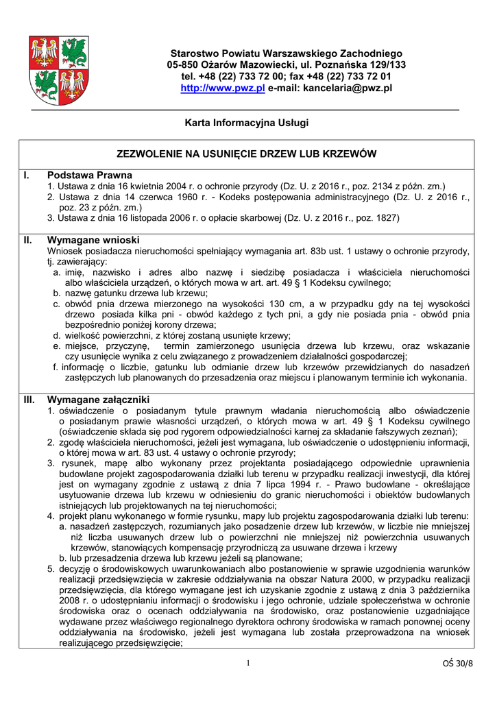 Starostwo Powiatu Warszawskiego Zachodniego 05-850 Ożarów Mazowiecki, ul. Poznańska 129/133 tel. +48 (22) 733 72 00; fax +48 (22) 733 72 01 http://www.pwz.pl e-mail: [email protected] Karta Informacyjna Usługi ZEZWOLENIE NA USUNIĘCIE DRZEW LUB KRZEWÓW I. Podstawa Prawna 1. Ustawa z dnia 16 kwietnia 2004 r. o ochronie przyrody (Dz. U. z 2016 r., poz. 2134 z późn. zm.) 2. Ustawa z dnia 14 czerwca 1960 r. - Kodeks postępowania administracyjnego (Dz. U. z 2016 r., poz. 23 z późn. zm.) 3. Ustawa z dnia 16 listopada 2006 r. o opłacie skarbowej (Dz. U. z 2016 r., poz. 1827) II. Wymagane wnioski Wniosek posiadacza nieruchomości spełniający wymagania art. 83b ust. 1 ustawy o ochronie przyrody, tj. zawierający: a. imię, nazwisko i adres albo nazwę i siedzibę posiadacza i właściciela nieruchomości albo właściciela urządzeń, o których mowa w art. art. 49 § 1 Kodeksu cywilnego; b. nazwę gatunku drzewa lub krzewu; c. obwód pnia drzewa mierzonego na wysokości 130 cm, a w przypadku gdy na tej wysokości drzewo posiada kilka pni - obwód każdego z tych pni, a gdy nie posiada pnia - obwód pnia bezpośrednio poniżej korony drzewa; d. wielkość powierzchni, z której zostaną usunięte krzewy; e. miejsce, przyczynę, termin zamierzonego usunięcia drzewa lub krzewu, oraz wskazanie czy usunięcie wynika z celu związanego z prowadzeniem działalności gospodarczej; f. informację o liczbie, gatunku lub odmianie drzew lub krzewów przewidzianych do nasadzeń zastępczych lub planowanych do przesadzenia oraz miejscu i planowanym terminie ich wykonania. III. Wymagane załączniki 1. oświadczenie o posiadanym tytule prawnym władania nieruchomością albo oświadczenie o posiadanym prawie własności urządzeń, o których mowa w art. 49 § 1 Kodeksu cywilnego (oświadczenie składa się pod rygorem odpowiedzialności karnej za składanie fałszywych zeznań); 2. zgodę właściciela nieruchomości, jeżeli jest wymagana, lub oświadczenie o udostępnieniu informacji, o której mowa w art. 83 ust. 4 ustawy o ochronie przyrody; 3. rysunek, mapę albo wykonany przez projektanta posiadającego odpowiednie uprawnienia budowlane projekt zagospodarowania działki lub terenu w przypadku realizacji inwestycji, dla której jest on wymagany zgodnie z ustawą z dnia 7 lipca 1994 r. - Prawo budowlane - określające usytuowanie drzewa lub krzewu w odniesieniu do granic nieruchomości i obiektów budowlanych istniejących lub projektowanych na tej nieruchomości; 4. projekt planu wykonanego w formie rysunku, mapy lub projektu zagospodarowania działki lub terenu: a. nasadzeń zastępczych, rozumianych jako posadzenie drzew lub krzewów, w liczbie nie mniejszej niż liczba usuwanych drzew lub o powierzchni nie mniejszej niż powierzchnia usuwanych krzewów, stanowiących kompensację przyrodniczą za usuwane drzewa i krzewy b. lub przesadzenia drzewa lub krzewu jeżeli są planowane; 5. decyzję o środowiskowych uwarunkowaniach albo postanowienie w sprawie uzgodnienia warunków realizacji przedsięwzięcia w zakresie oddziaływania na obszar Natura 2000, w przypadku realizacji przedsięwzięcia, dla którego wymagane jest ich uzyskanie zgodnie z ustawą z dnia 3 października 2008 r. o udostępnianiu informacji o środowisku i jego ochronie, udziale społeczeństwa w ochronie środowiska oraz o ocenach oddziaływania na środowisko, oraz postanowienie uzgadniające wydawane przez właściwego regionalnego dyrektora ochrony środowiska w ramach ponownej oceny oddziaływania na środowisko, jeżeli jest wymagana lub została przeprowadzona na wniosek realizującego przedsięwzięcie; 1 OŚ 30/8 6. zezwolenie w stosunku do gatunków chronionych na czynności podlegające zakazom określonym w art. 51 ust. 1 pkt 1-4 i 10 oraz w art. 52 ust. 1 pkt 1, 3, 7, 8, 12, 13 i 15 ustawy o ochronie przyrody, jeżeli zostało wydane. 7. Oryginał pełnomocnictwa lub urzędowo poświadczony odpis pełnomocnictwa1. IV. Dokumenty do wglądu Brak V. Opłaty Opłaty skarbowe: - 17 zł w przypadku złożenia pełnomocnictwa Opłaty skarbowe można uiścić w kasie Starostwa lub na rachunek bankowy Starostwa: GETIN NOBLE BANK S.A. ul. Przyokopowa 33, 01-208 Warszawa Nr 68156000132371405530000014 lub na rachunek bankowy Urzędu Miejskiego w Ożarowie Mazowieckim: PKO BP S.A. Nr 31 1020 1185 0000 4102 0019 1726. Zwalnia się od opłaty skarbowej: a. pod warunkiem wzajemności, państwa obce, ich przedstawicielstwa dyplomatyczne, urzędy konsularne i siły zbrojne, międzynarodowe organizacje i instytucje oraz ich oddziały i przedstawicielstwa, korzystające na podstawie ustaw, umów lub powszechnie uznanych zwyczajów międzynarodowych z przywilejów i immunitetów, a także członków ich personelu i inne osoby zrównane z nimi, jeżeli nie są one obywatelami polskimi i nie mają miejsca stałego pobytu na terytorium Rzeczypospolitej Polskiej; b. jednostki budżetowe; c. jednostki samorządu terytorialnego; d. organizacje pożytku publicznego, jeżeli dokonują zgłoszenia lub składają wniosek o dokonanie czynności urzędowej albo wniosek o wydanie zaświadczenia lub zezwolenia - wyłącznie w związku z nieodpłatną działalnością pożytku publicznego w rozumieniu przepisów o działalności pożytku publicznego i o wolontariacie; e. osoby, które dokonując zgłoszenia lub składając wniosek o dokonanie czynności urzędowej albo wniosek o wydanie zaświadczenia lub zezwolenia (pozwolenia, koncesji) albo składając dokument stwierdzający udzielenie pełnomocnictwa lub prokury albo jego odpis, wypis lub kopię przedstawią zaświadczenie o korzystaniu ze świadczeń pomocy społecznej z powodu ubóstwa. VI. Termin załatwienia sprawy Do 1 miesiąca, a sprawy szczególnie skomplikowanej do 2 miesięcy. Do terminów załatwienia sprawy nie wlicza się terminów przewidzianych w przepisach prawa dla dokonania określonych czynności, okresów zawieszenia postępowania oraz okresów opóźnień spowodowan