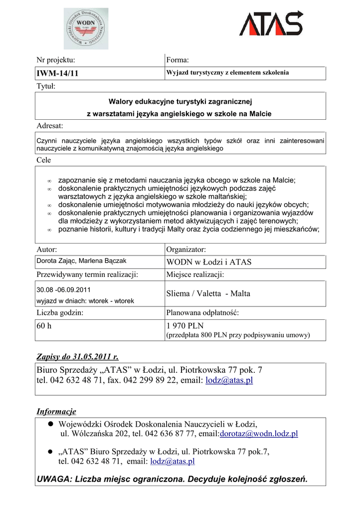 Nr projektu: Forma: IWM-14/11 Wyjazd turystyczny z elementem szkolenia Tytuł: Walory edukacyjne turystyki zagranicznej z warsztatami języka angielskiego w szkole na Malcie Adresat: Czynni nauczyciele języka angielskiego wszystkich typów szkół oraz inni zainteresowani nauczyciele z komunikatywną znajomością języka angielskiego Cele • • • • • zapoznanie się z metodami nauczania języka obcego w szkole na Malcie; doskonalenie praktycznych umiejętności językowych podczas zajęć warsztatowych z języka angielskiego w szkole maltańskiej; doskonalenie umiejętności motywowania młodzieży do nauki języków obcych; doskonalenie praktycznych umiejętności planowania i organizowania wyjazdów dla młodzieży z wykorzystaniem metod aktywizujących i zajęć terenowych; poznanie historii, kultury i tradycji Malty oraz życia codziennego jej mieszkańców; Autor: Organizator: Dorota Zając, Marlena Bączak WODN w Łodzi i ATAS Przewidywany termin realizacji: Miejsce realizacji: 30.08 -06.09.2011 Sliema / Valetta - Malta wyjazd w dniach: wtorek - wtorek Liczba godzin: Planowana odpłatność: 60 h 1 970 PLN (przedpłata 800 PLN przy podpisywaniu umowy) Zapisy do 31.05.2011 r. Biuro Sprzedaży „ATAS” w Łodzi, ul. Piotrkowska 77 pok. 7 tel. 042 632 48 71, fax. 042 299 89 22, email: [email protected] Informacje Wojewódzki Ośrodek Doskonalenia Nauczycieli w Łodzi, ul. Wólczańska 202, tel. 042 636 87 77, email:[email protected] „ATAS” Biuro Sprzedaży w Łodzi, ul. Piotrkowska 77 pok.7, tel. 042 632 48 71, email: [email protected] UWAGA: Liczba miejsc ograniczona. Decyduje kolejność zgłoszeń. 1. Szczegółowy program szkolenia: Sposoby realizacji Lp. Bloki tematyczne/moduły 1. Podstawy prawne dotyczące organizacji turystyki w placówkach oświatowych 2. Istota krajoznawstwa i turystyki w edukacji 3. Praktyczne zajęcia w terenie z wykorzystaniem atrakcji turystycznych Malty 4. Warsztaty języka angielskiego w klasach w szkole maltańskiej 5. Ćwiczenia językowe doskonalące język angielski w praktyce. 6. Prezentacja współpracy dostawcy usługi turystycznej ze szkołą na podstawie firmy ATAS Razem: 2. Warunki zaliczenia: Uczestnictwo w warsztatach warsztaty wykład Inne formy (jakie?) Liczba godzin bloku/modułu X 10 X 10 X 15 X 12 X 10 37 X 3 23 60 3. Program wyjazdu turystycznego na Maltę*: I dzień: Zbiórka na lotnisku w Warszawie – 17.30, wylot: 19:30 (przylot: 22:30), transfer z lotniska do rodzin goszczących, zakwaterowanie, nocleg II dzień: Śniadanie, MALTA - Zajęcia językowe w klasach, wykład, wyjście na plażę obiadokolacja, nocleg III dzień: Śniadanie, MALTA - Zajęcia językowe w klasach, wyjście na plażę; półdniowa wycieczka do Mdiny – zwiedzanie dawnej stolicy Malty obiadokolacja, nocleg IV dzień: Śniadanie, MALTA - Zajęcia językowe w klasach, wykład, wyjście na plażę, wieczorne wyjście do klubu obiadokolacja, nocleg V dzień: Śniadanie, MALTA – COMINO - Całodniowa wycieczka na najmniejszą zamieszkałą wyspę archipelagu wysp maltańskich – Comino (Błękitna Laguna) obiadokolacja, nocleg VI dzień: Śniadanie, MALTA – wyjście na plażę, wykład i warsztaty, Harbour Cruise obiadokolacja, nocleg Śniadanie, VII dzień: MALTA - Zajęcia językowe w klasach, wykład i warsztaty, wyjście na plażę obiadokolacja, nocleg Śniadanie, VIII dzień: wykwaterowanie w godzinach południowych, transfer na lotnisko, wylot do Polski (15:30), powrót do Warszawy (18:40) *Na realizację programu i transfery z/na lotnisko na Malcie należy przygotować 75EUR 4. Procedura zapisu: 1. Prosimy o przesłanie faksem lub dostarczenie osobiście wypełnionej karty zgłoszeniowej do najbliższego Biura ATAS do dnia 31 maja 2011r. 2. Po zweryfikowaniu danych na podstawie przesłanej karty zgłoszeniowej zostanie do Państwa wysłana umowa - zgłoszenie potwierdzająca udział w wyjeździe wraz z informacją o terminach i sposobie płatności. 3. Ostateczny termin dokonania pełnej płatności to 4 tygodnie przed planowanym terminem wyjazdu - tj. do dnia 31 lipca 2011 r. 4. Instrukcja do dokonywania płatności przelewem: AGENCJA WIELOBRANŻOWA „ATAS” Sp. z o.o. 05-410 Józefów, ul. Luksusowa 19 12 1160 2202 0000 0000 3046 6445 UWAGA! W tytule przelewu proszę wpisać imię i nazwisko wpłacającego oraz kod imprezy (IWM-14/11), za który dokonywana jest wpłata/przedpłata • UWAGA! W przypadku rezygnacji z udziału w imprezie do 30 czerwca 2011 zwracane są wpłacone kwoty, zaś po tym terminie, aby odzyskać wpłacone pieniądze prosimy o wskazanie innego uczestnika imprezy. • Istnieje możliwość otrzymania faktury za wyjazd po podaniu dokładnych danych nabywcy faktury. Faktury wystawia ATAS UWAGA! Uczestnicy wyjazdu są zobowiązani posiadać dokument tożsamości uprawniający do przekroczenia granicy (nowy dowód osobisty lub ważny paszport
