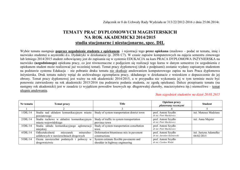 Załącznik nr 8 do Uchwały Rady Wydziału nr 313/22/2012-2016 z dnia 25.06.2014r. TEMATY PRAC DYPLOMOWYCH MAGISTERSKICH NA ROK AKADEMICKI 2014/2015 studia stacjonarne i niestacjonarne, spec. DIL Wybór tematu następuje poprzez uzgodnienie studenta z opiekunem i rejestracji tego przez opiekuna (mailowo – podać nr tematu, imię i nazwisko studenta) u asystentki d.s. Dydaktyki w dziekanacie (p. 205b C7). W czasie zapisów komputerowych na zajęcia semestru zimowego lub letniego 2014/2015 student zobowiązany jest do zapisania się w systemie EDUKACJA na kurs PRACA DYPLOMOWA INŻYNIERSKA na nazwisko (uzgodnionego) opiekuna pracy, co jest równoznaczne z podjęciem się realizacji tego kursu w danym semestrze (w uzgodnieniu z opiekunem student może realizować już wcześniej temat). Temat pracy dyplomowej (druk z podpisami) zostanie wydany zapisanym studentom na podstawie systemu Edukacja – nie pobranie druku tematu nie skutkuje anulowaniem komputerowego zapisu na kurs Praca dyplomowa inżynierska. Druk tematu należy wpiąć do archiwalnego egzemplarza pracy, składanego w dziekanacie z wnioskiem o dopuszczenie do jej obrony. Temat pracy dyplomowej jest ważny na rok akademicki 2014/2015, a w przypadku nie wykonania jej w tym terminie może być ponownie zatwierdzony na rok akademicki 2015/2016 (na podstawie podania studenta, ze zgodą opiekuna). Dalsze przepisanie tematu (na następny rok akademicki) jest w zasadzie (z wyjątkiem powodów losowych np. długotrwałej choroby, macierzyństwa itp.) niemożliwe – temat ulegnie anulowaniu. Stan uzgodnień studentów na dzień 20.03.2015 Nr tematu 1 1/DIL/14 2/DIL/14 3/DIL/14 4/DIL/14 5/DIL/14 Temat pracy 2 Studia nad układem komunikacyjnym miasta powiatowego Studia ruchowe w układzie komunikacyjnym miasta wojewódzkiego Studia układu komunikacyjnego aglomeracji miejskiej Odkształcalność mieszanek mineralnoasfaltowych w nawierzchniach drogowych Ocena nawierzchni podatnych i poboczy w drogownictwie Title 3 Study of system transportation district town Study of traffic in system transportation province town Study of system transportation conurbation town Deformation bituminous mix in pavement constructions System estimate flexible pavements and shoulder in highway engineering Opiekun pracy planowany recenzent 4 prof. Antoni Szydło 5 inż. Mateusz Madziara prof. Antoni Szydło inż. Anna Majster dr inż. Piotr Mackiewicz dr inż. Piotr Mackiewicz Student prof. Antoni Szydło dr inż. Piotr Mackiewicz prof. Antoni Szydło dr inż. Jarosław Kuźniewski prof. Antoni Szydło dr inż. Czesław Wolek inż. Justyna Adamelko 04/02/2015 6/DIL/14 7/DIL/14 8/DIL/14 9/DIL/14 10/DIL/14 11/DIL/14 12/DIL/14 Studia nad kształtowaniem rond Research on roundabouts designing process prof. Antoni Szydło Poprawa warunków ruchu dla wybranej lokalizacji Poprawa warunków ruchu i bezpieczeństwa dla wybranej lokalizacji Przebudowa układu komunikacyjnego dla wybranej lokalizacji Koncepcja lotniska w rejonie miejscowości Oleśnica Improvement of traffic conditions for selected location Improvement of traffic conditions and safeties for selected location Rebuilding of communication system for selected location Conception of airport in the region of Oleśnica dr inż. Krzysztof Gasz dr inż. Henryk Koba prof. Antoni Szydło inż. Bartłomiej Orzeł 12/03/2015 inż. Marcin Stojko 12/03/2015 inż. Tomasz Owczarz 10/02/2015 inż. Wojciech Lis dr inż. Henryk Koba prof. Antoni Szydło dr inż. Krzysztof Gasz prof. Antoni Szydło dr inż. Krzysztof Gasz prof. Antoni Szydło dr inż. Krzysztof Gasz dr hab. inż. Maciej Kruszyna 13/DIL/14 Przebudowa ulic Bażantowej i Sokolej w Jelczu Laskowicach Rebuilding of the Bażantowa and Sokola streets in Jelcz- Laskowice 14/DIL/14 Przebudowa ulicy Żurawiej i Kanarkowej w Jelczu-Laskowicach Przebudowa ulicy Świętochowskiego i Ziołowej w Jelczu-Laskowicach Przebudowa ulicy Parkowa, Łąkowa i Słonecznej w Jelczu-Laskowicach Obwodnica Ostrowa Wielkopolskiego w ciągu drogi S11 Węzeł drogowy w ciągu drogi krajowej nr 39 Rebuilding of the Żurawia and Kanarkowa street in Jelcz - Laskowice Rebuilding of the Świętochowskiego and Ziołowa streets in Jelcz - Laskowice Rebuilding of the Parkowa, Łąkowa and Słoneczna streets in Jelcz - Laskowice Ostrów Wielkopolski ring road as a continiuation of the S11 road Junction at the no. 39 national road dr inż. Henryk Koba Przebudowa układu komunikacyjnego w rejonie północnej obwodnicy Wielunia Przebudowa układu komunikacyjnego w rejonie Węzła Bielańskiego k. Wrocławia Redevelopment of the Wieluń city northern ring road area's transport network Redevelopment of the Bielany Junction (nearby Wrocław) area's transport network dr inż. Bartłomiej Krawczyk Przebudowa układu komunikacyjnego wybranego miasta powiatowego Wprowadzenie zaawansowanych sygnalizacji dla wybranych skrzyżowań Redevelopment of a chosen district town’s transport network Introduction of advanced solutions in traffic signals for chosen location dr inż. Bartłomiej Krawczyk 24/DIL/14 Studia nowego połączenia pomiędzy drogami: AOW, S5 i S8 po północnej stronie Wrocławia Study of new connection between the roads: AOW, S5 and S8 on the north side of Wroclaw 25/DIL/14 Koncepcja południowej części obwodnicy A conceptual design study of the southern part 15/DIL/14 16/DIL/14 17/DIL/14 18/DIL/14 19/DIL/14 20/DIL/14 21/DIL/14 22/DIL/14 inż. Krystian Kowalski prof. Antoni Szydło dr inż. Henryk Koba prof. Antoni Szydło dr inż. Henryk Koba prof. Antoni Szydło dr inż. Bartłomiej Krawczyk prof. Antoni Szydło dr inż. Bartłomiej Krawczyk prof. Antoni Szydło prof. Antoni Szydło dr inż. Bartłomiej Krawczyk prof. Antoni Szydło inż. Karol Kowalczyk 03/03/2015 inż. Mateusz Chmiel 03/03/2015 inż. Michał Packi 03/03/2015 inż. Przemysław Kapela 03/03/2015 prof. Antoni Szydło dr hab. inż. Maciej Kruszyna dr inż. Krzysztof Gasz inż. Marcin Żelazko 13/03/2015 dr hab. inż. Maciej Kr