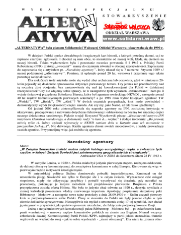 W Y D A N I E S P E C J A L N E! „ALTERNATYWA” była pismem Solidarności Walczącej Oddział Warszawa- ukazywała się do 1990 r. W dziejach Polski oprócz chwalebnych i tragicznych kart historii, z których jesteśmy dumni, są i te zapisane czarnymi zgłoskami. I chociaŜ są nam obce, to niezaleŜnie od naszej woli, kładą się cieniem na naszej historii. Takim wydarzeniem była i pozostanie rocznica powstania 5 I 1942 r. Polskiej Partii Robotniczej (PPR), z której ,,owocami’’ mamy do czynienia równieŜ w obecnej rzeczywistości. Zapraszamy do zapoznania się z artykułem pt. ,,Narodziny agentury’’, który ukazał się w 7 numerze /styczeń 1989 r./ naszej podziemnej ,,Alternatywy’’. Pomimo, iŜ upłynęło ponad 20 lat, wymowa i przesłanie tego tekstu pozostają wciąŜ aktualne. Dla niektórych treść artykułu moŜe się wydać zbyt archaiczna lub oczywista, gdyŜ w minionym 20leciu pojawiły się doskonałe opracowania dotyczące poruszanego tematu. Czy jednak nie przechodzimy nad tą rocznicą zbyt obojętnie, bez zastanowienia się nad jej konsekwencjami dla Polski w dzisiejszej rzeczywistości? Czy nie zdajemy sobie sprawy, Ŝe w następstwie tych wydarzeń ,,zafundowano’’ nam po II wojnie światowej prezydenta Bolesława Bieruta, który był agentem sowieckiego NKWD? , następnie ponad 40 lat rządów komunistycznych pierwszych sekretarzy? a po 1989 roku wybór kolejnych agentów: TW ,,Wolski’’, TW ,,Bolek’’, TW ,,Alek’’? W dwóch ostatnich przypadkach, ktoś moŜe powiedzieć – demokratyczny wybór (większości?) części narodu. Ale czy my, jako Naród, aŜ tak nisko upadliśmy?. Od jesieni 2009 roku zintensyfikowała się nagonka agentury na IPN, zasłuŜoną instytucję w ukazywaniu, propagowaniu i ratowaniu dotychczas fałszowanej i odstawionej na boczny tor znacznej części naszego dziedzictwa narodowego. Pięknie to ujął Krzysztof Wyszkowski pisząc: ,,Kwaśniewski nazywa IPN instytutem kłamstwa narodowego, a dokumenty radzi “o kant d… roztłuc” i dodaje ironicznie: ,,Bo prawdę mówią tylko ci, którzy wybrali rejestrację w NKWD zamiast dołu w Katyniu oraz ich uczniowie w janczarskim fachu(...)’’. Nic dziwnego. KaŜda agentura chroni swoich mocodawców, a kaŜdy prowadzący swoich agentów. Przypomnijmy więc, jak rodziła się agentura. Narodziny agentury Motto: ,,W Związku Sowieckim znaleźć moŜna zaląŜek kaŜdego europejskiego rządu, a zwłaszcza tych rządów, w których Związek Sowiecki jest zainteresowany geograficznie lub strategicznie’’. Ambasador USA w ZSRS do Sekretarza Stanu 28 IV 1943 r. W zamyśle Lenina, w 1920 r., Polska miała być jedynie pierwszym etapem, rodzajem odskoczni, do dalszej ofensywy komunistycznej, do zwycięstwa komunizmu w całej Europie. Kierowano się więc w pierwszym rzędzie motywami ideologicznymi. W antypolskiej polityce Stalina dominowały pobudki imperialistyczne. Zamierzał on do umocnienia potęgi Sowietów nie tylko w Europie ale i w całym świecie. Wyznaczone cele osiągał stopniowo, nigdy nie odkrywając przyłbicy i potrafił wycofywać się doraźnie, gdy natrafiał na przeszkody, pokonując je innymi metodami niŜ projektowane pierwotnie. Rozprawa z Polska przyspieszona została ofertą Hitlera. Nie była to jedynie chęć odwetu za 1920 r., decyzja wynikała z zimnej kalkulacji poszerzenia władzy czerwonego imperium. Aprobując pospiesznie sierpniowy pakt Ribbentrop - Mołotow, a następnie nowe tajne protokoły z dnia 28.09.1939 r. – Stalin uczynił pierwszy krok w podporządkowaniu sobie Polski. Plany w stosunku do Polski nie były jeszcze chyba w tym okresie dokładnie sprecyzowane. Niewątpliwie nie myślał o utworzeniu z niej 17-tej republiki, lecz chciał ją utrzymać w przyszłości jako państwo pozornie niezaleŜne, ale faktycznie podporządkowane Rosji. Jedną z natychmiastowych konsekwencji paktu Ribbentrop - Mołotow był – po zakończeniu kampanii wrześniowej – masowy napływ komunistów polskich na ziemie zza Bugiem. Niemal wszyscy członkowie dawnej Komunistycznej Partii Polski /KPP/, zajmujący w partii jakieś stanowiska, tłumnie wędrowali na wschód do swej – jak to sobie wyobraŜali - ,,ziemi obiecanej’’. Dla wielu ta ,,ziemia obie- cana’’ miała swój ciąg dalszy w sowieckich łagrach, kopalniach – dokąd NKWD zsyłało polskich komunistów. Powoływanie się na działalność w KPP było ... okolicznością obciąŜającą. Funkcjonariusze NKWD mieli mocno zakarbowane w pamięci rozwiązanie KPP przez Komintern pod róŜnymi politycznymi zarzutami. Jak było dalej, odwołajmy się do wspomnień Lucjana Partyńskiego – ,,jedynego Ŝyjącego do dziś członka Grupy Inicjatywnej PPR’’ – opublikowanych nieopatrznie w ,,Trybunie Ludu’’ w numerach z dnia 19, 20 i 22 stycznia 1988 r. Ta ciekawa lektura na temat powstania PPR zmusza do wyciągnięcia jedynie słusznych wniosków. Ze wspomnień Partyńskiego wynika, Ŝe właściwym inicjatorem PPR był tow. Kilbin, szary i nieznany aparatczyk z Okręgowego Komitetu WKP/b/ w Białymstoku (przypomnijmy tu, Ŝe Ŝadne decyzje w sprawie komunistów innych narodowości nie mogły być podjęte bez zgody Stalina). Wezwał on (tow. Kilbin) w czerwcu 1940 r. do siebie Nowotkę i Partyńskiego, nakazując im ,,w ciągu dwóch tygodni zdać swoje obowiązki i ponownie zgłosić się do niego’’, a po dwóch tygodniach przekazał im kolejny rozkaz z góry: ,,jeŜeli juŜ zdaliście obowiązki, to teraz spakujcie manatki. Tu macie dokumenty, bilety na przejazd do Moskwy. Zgłosicie się w Kominternie. Co będzie z wami dalej – dowiecie się na miejscu’’. Kierownik wydziału kadr Kominternu tow. Gulajew teŜ nie spieszył się z wyjaśnieniem zagadki nurtującej historyków PPR. Nowotko i Partyński usłyszeli tylko, Ŝe ich ,,obecnym zadaniem jest studiowanie, a o celu tych studiów rozmowa odbędzie się we właściwym czasie’’. Wspomnienia Partyńsk