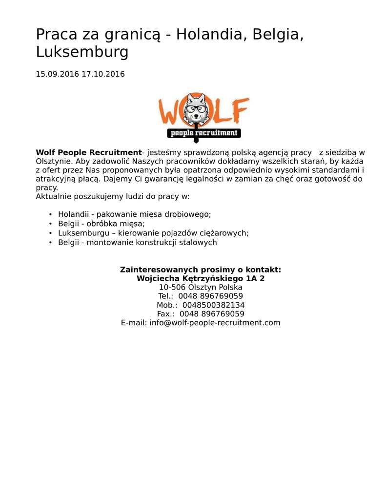 Praca za granicą - Holandia, Belgia, Luksemburg 15.09.2016 17.10.2016 Wolf People Recruitment- jesteśmy sprawdzoną polską agencją pracy z siedzibą w Olsztynie. Aby zadowolić Naszych pracowników dokładamy wszelkich starań, by każda z ofert przez Nas proponowanych była opatrzona odpowiednio wysokimi standardami i atrakcyjną płacą. Dajemy Ci gwarancję legalności w zamian za chęć oraz gotowość do pracy. Aktualnie poszukujemy ludzi do pracy w: • • • • Holandii - pakowanie mięsa drobiowego; Belgii - obróbka mięsa; Luksemburgu – kierowanie pojazdów ciężarowych; Belgii - montowanie konstrukcji stalowych Zainteresowanych prosimy o kontakt: Wojciecha Kętrzyńskiego 1A 2 10-506 Olsztyn Polska Tel.: 0048 896769059 Mob.: 0048500382134 Fax.: 0048 896769059 E-mail: [email protected]